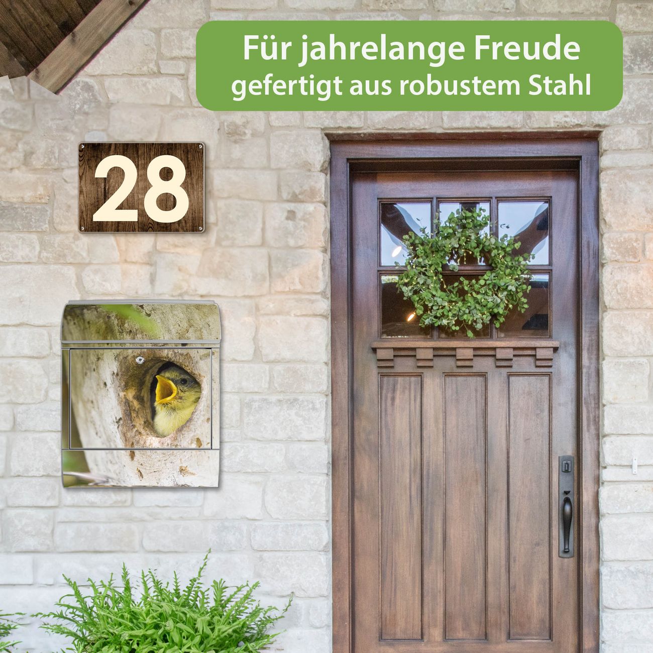 DESIGN: Der Postkasten mit Motiv Motiv Blaumeise hat ein sehr ansprechendes und ausgefallenes Design, damit entlocken Sie Ihren Nachbarn und dem Postboten ein Lächeln. Heben Sie Sich von der tristen grauen Masse ab, ohne auf Funktionalität zu verzichten. DETAILS: Der Postkasten besteht aus pulverbeschichtetem Stahl. Er ist 38x46x12,5cm groß. Das Motiv besteht aus einer wetter- und UV-resistenten Folie, die mit einem Schutzlaminat überzogen ist, sodass der Briefkasten zusätzlich vor Kratzern geschützt ist. Der Briefkasten wird mit Montagematerial, zusätzlich zwei Schlüssel sowie einer Bohrschablone geliefert. NUTZEN: Sie können diesen Briefkasten sowohl als Wandbriefkasten montieren oder einen passenden Ständer kaufen und als Standbriefkasten einbetonieren. Die Größe bietet genügend Platz für Sendungen aller Art, der Einwurf fasst auch größere A4 Sendungen. BANJADO: Ihr Briefkasten wird in Sachsen in einer kleinen Manufaktur von Hand veredelt. Die Motivfolie ist lösungsmittelfrei und schutzlaminiert für einen langen Halt. Wir legen großen Wert auf die Verbindung von Funktionalität und Design. Sie erhalten Handarbeit aus Sachsen.