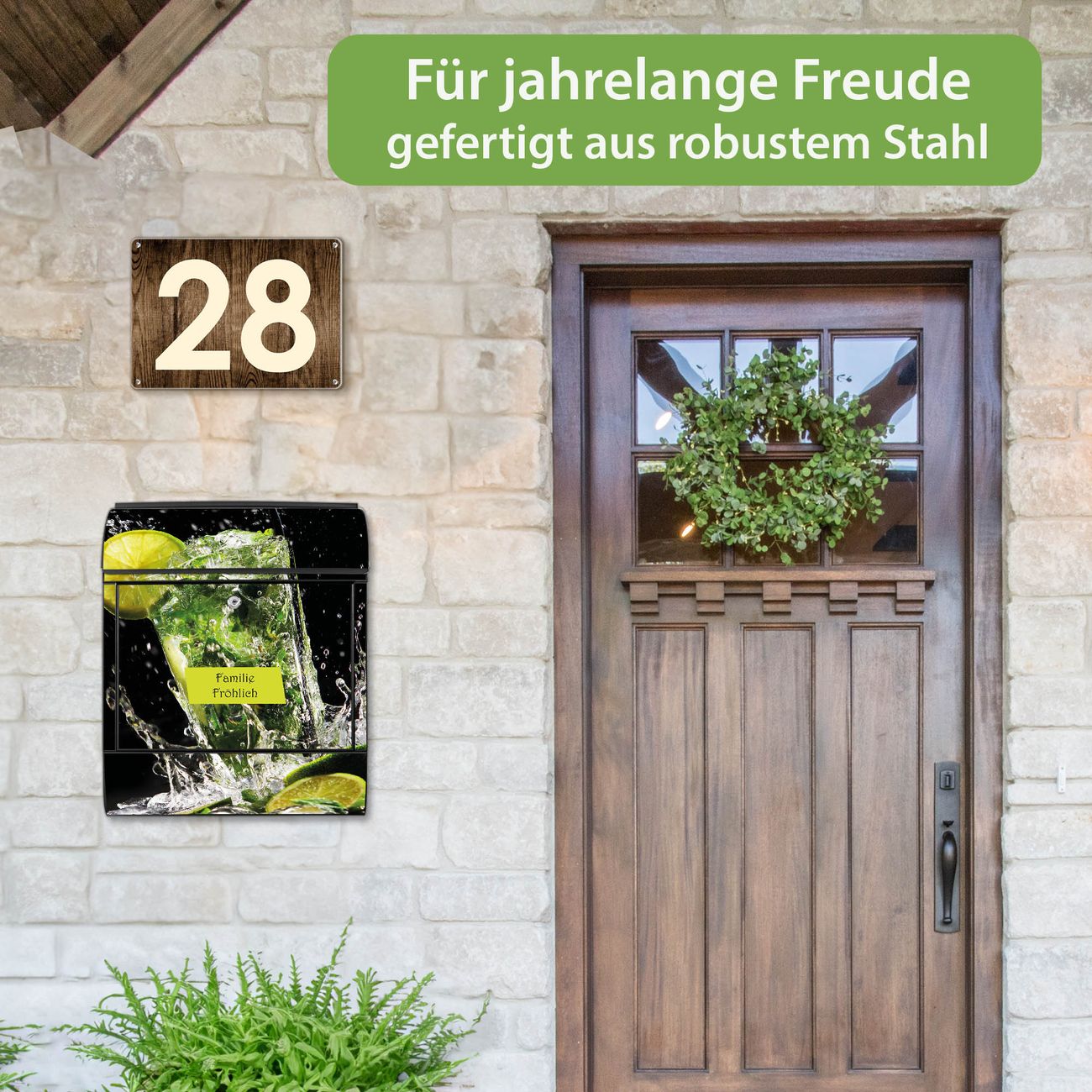 DESIGN: Der Postkasten mit Motiv Motiv Brasilianischer Cocktail hat ein sehr ansprechendes und ausgefallenes Design, damit entlocken Sie Ihren Nachbarn und dem Postboten ein Lächeln. Heben Sie Sich von der tristen grauen Masse ab, ohne auf Funktionalität zu verzichten. DETAILS: Der Postkasten besteht aus pulverbeschichtetem Stahl. Er ist 38x46x12,5cm groß. Das Motiv besteht aus einer wetter- und UV-resistenten Folie, die mit einem Schutzlaminat überzogen ist, sodass der Briefkasten zusätzlich vor Kratzern geschützt ist. Der Briefkasten wird mit Montagematerial, zusätzlich zwei Schlüssel sowie einer Bohrschablone geliefert. NUTZEN: Sie können diesen Briefkasten sowohl als Wandbriefkasten montieren oder einen passenden Ständer kaufen und als Standbriefkasten einbetonieren. Die Größe bietet genügend Platz für Sendungen aller Art, der Einwurf fasst auch größere A4 Sendungen. BANJADO: Ihr Briefkasten wird in Sachsen in einer kleinen Manufaktur von Hand veredelt. Die Motivfolie ist lösungsmittelfrei und schutzlaminiert für einen langen Halt. Wir legen großen Wert auf die Verbindung von Funktionalität und Design. Sie erhalten Handarbeit aus Sachsen.