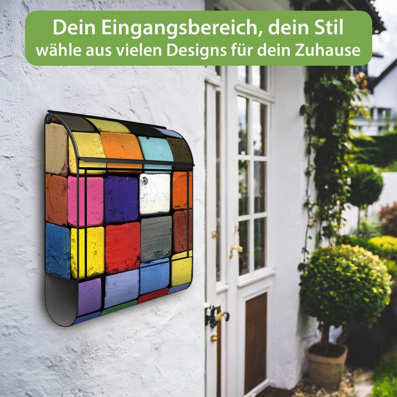 DESIGN: Der Postkasten mit Motiv Motiv Bunte Kreide hat ein sehr ansprechendes und ausgefallenes Design, damit entlocken Sie Ihren Nachbarn und dem Postboten ein Lächeln. Heben Sie Sich von der tristen grauen Masse ab, ohne auf Funktionalität zu verzichten.