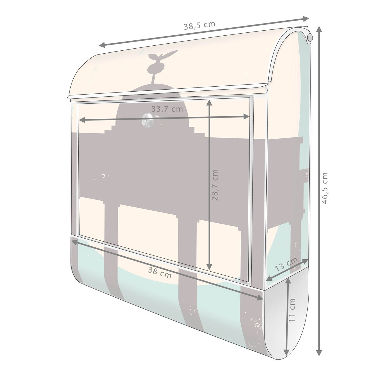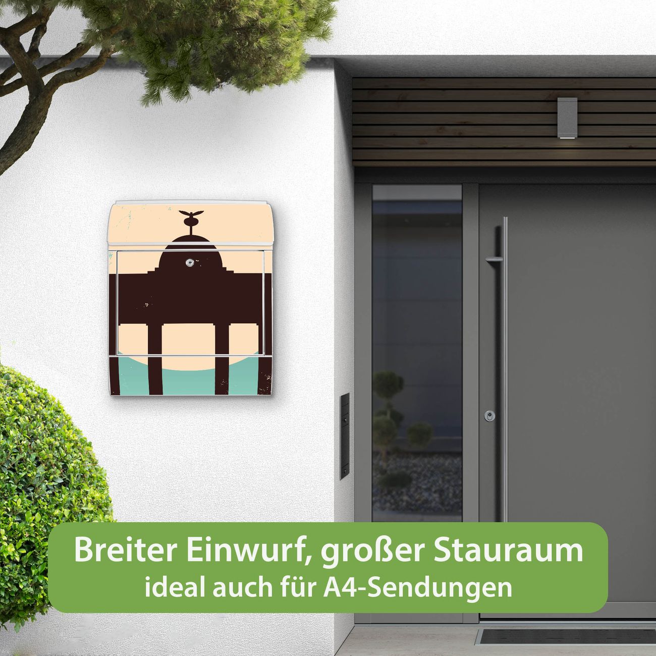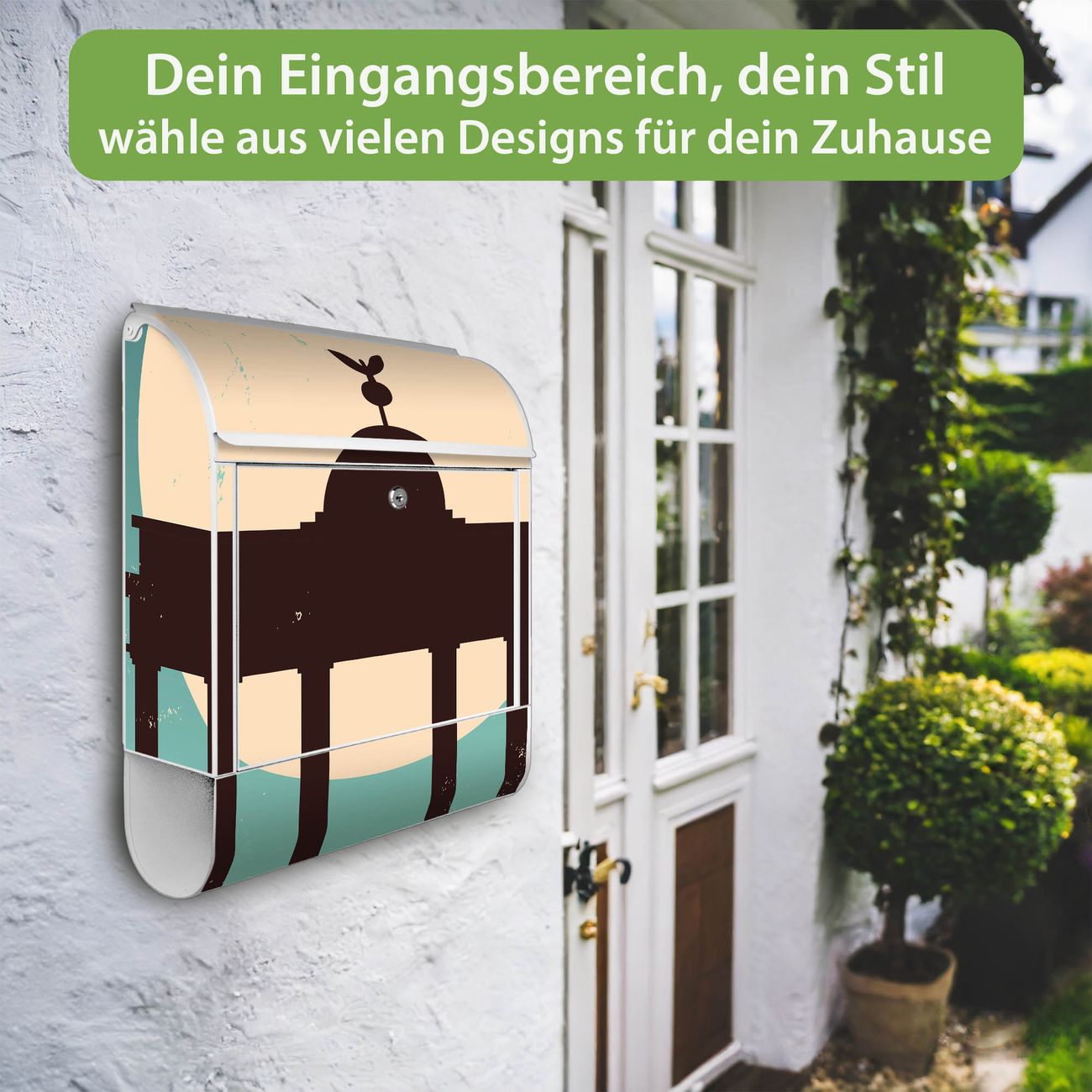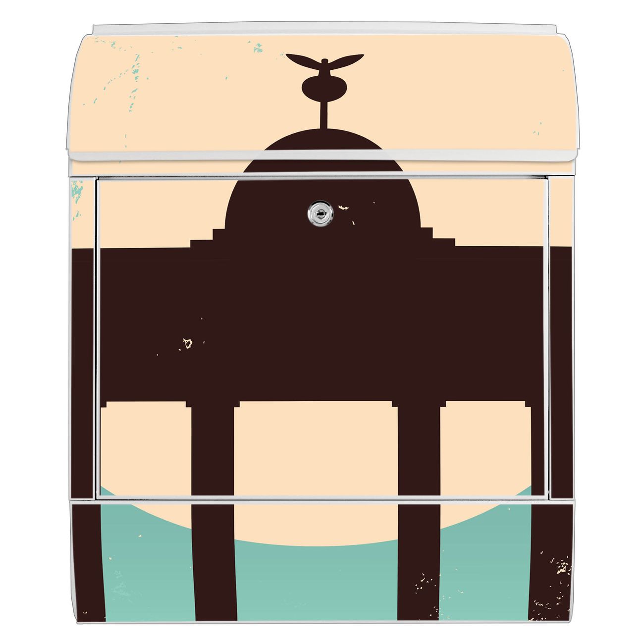 DESIGN: Der Postkasten mit Motiv Motiv City Poster Berlin hat ein sehr ansprechendes und ausgefallenes Design, damit entlocken Sie Ihren Nachbarn und dem Postboten ein Lächeln. Heben Sie Sich von der tristen grauen Masse ab, ohne auf Funktionalität zu verzichten. DETAILS: Der Postkasten besteht aus pulverbeschichtetem Stahl. Er ist 38x46x12,5cm groß. Das Motiv besteht aus einer wetter- und UV-resistenten Folie, die mit einem Schutzlaminat überzogen ist, sodass der Briefkasten zusätzlich vor Kratzern geschützt ist. Der Briefkasten wird mit Montagematerial, zusätzlich zwei Schlüssel sowie einer Bohrschablone geliefert. NUTZEN: Sie können diesen Briefkasten sowohl als Wandbriefkasten montieren oder einen passenden Ständer kaufen und als Standbriefkasten einbetonieren. Die Größe bietet genügend Platz für Sendungen aller Art, der Einwurf fasst auch größere A4 Sendungen. BANJADO: Ihr Briefkasten wird in Sachsen in einer kleinen Manufaktur von Hand veredelt. Die Motivfolie ist lösungsmittelfrei und schutzlaminiert für einen langen Halt. Wir legen großen Wert auf die Verbindung von Funktionalität und Design. Sie erhalten Handarbeit aus Sachsen.