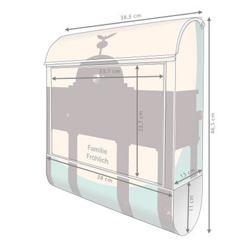 DESIGN: Der Postkasten mit Motiv Motiv City Poster Berlin hat ein sehr ansprechendes und ausgefallenes Design, damit entlocken Sie Ihren Nachbarn und dem Postboten ein Lächeln. Heben Sie Sich von der tristen grauen Masse ab, ohne auf Funktionalität zu verzichten. DETAILS: Der Postkasten besteht aus pulverbeschichtetem Stahl. Er ist 38x46x12,5cm groß. Das Motiv besteht aus einer wetter- und UV-resistenten Folie, die mit einem Schutzlaminat überzogen ist, sodass der Briefkasten zusätzlich vor Kratzern geschützt ist. Der Briefkasten wird mit Montagematerial, zusätzlich zwei Schlüssel sowie einer Bohrschablone geliefert. NUTZEN: Sie können diesen Briefkasten sowohl als Wandbriefkasten montieren oder einen passenden Ständer kaufen und als Standbriefkasten einbetonieren. Die Größe bietet genügend Platz für Sendungen aller Art, der Einwurf fasst auch größere A4 Sendungen. BANJADO: Ihr Briefkasten wird in Sachsen in einer kleinen Manufaktur von Hand veredelt. Die Motivfolie ist lösungsmittelfrei und schutzlaminiert für einen langen Halt. Wir legen großen Wert auf die Verbindung von Funktionalität und Design. Sie erhalten Handarbeit aus Sachsen.