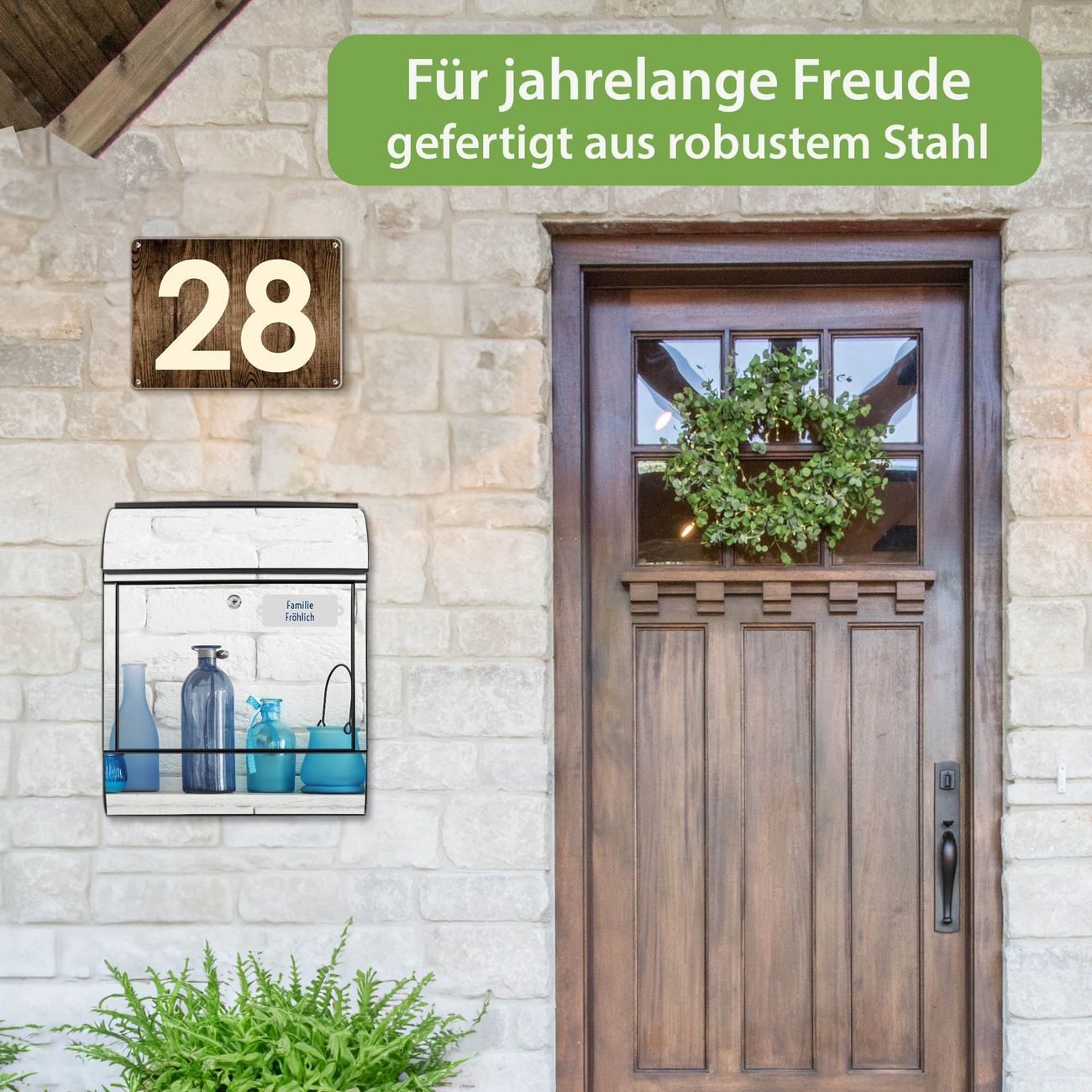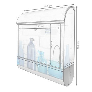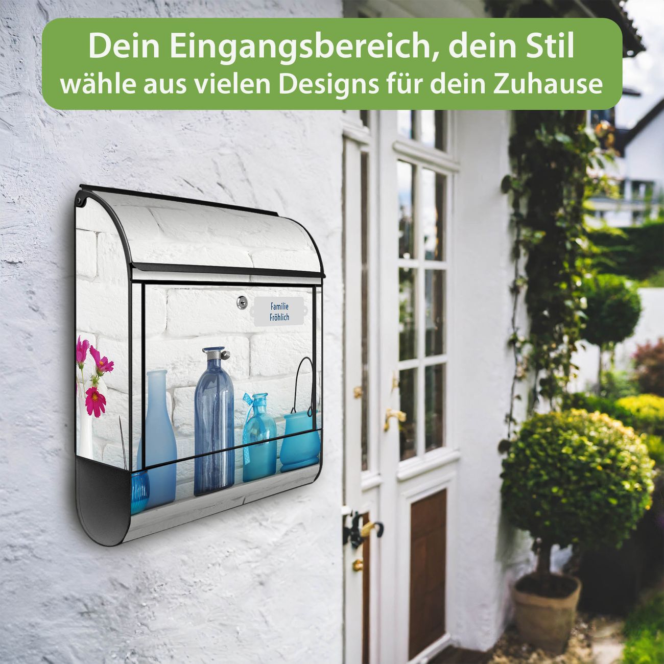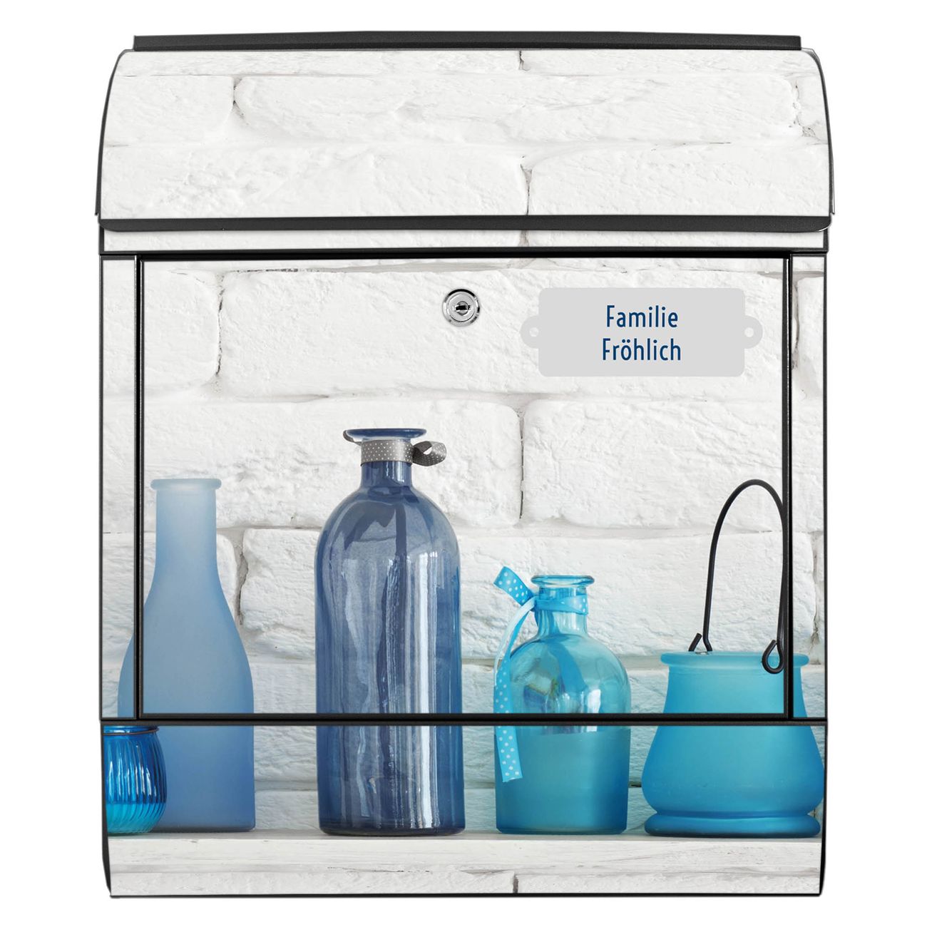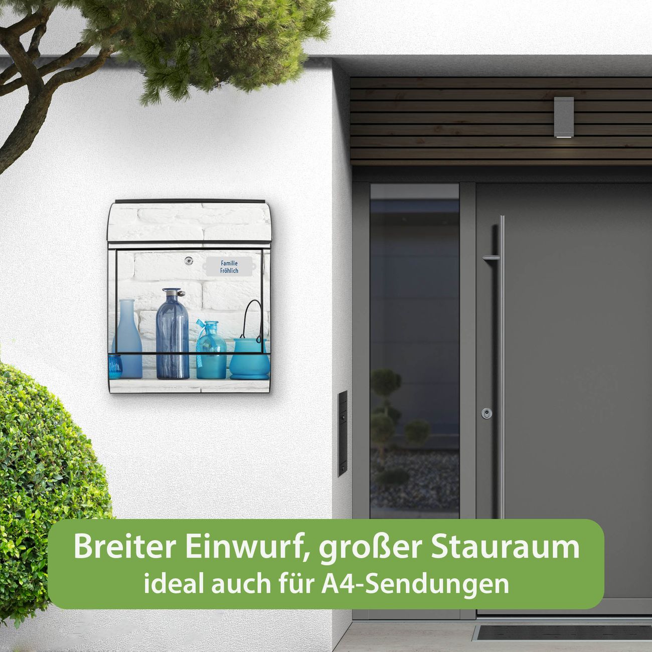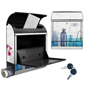 DESIGN: Der Postkasten mit Motiv Motiv Dekoartikel Blau hat ein sehr ansprechendes und ausgefallenes Design, damit entlocken Sie Ihren Nachbarn und dem Postboten ein Lächeln. Heben Sie Sich von der tristen grauen Masse ab, ohne auf Funktionalität zu verzichten. DETAILS: Der Postkasten besteht aus pulverbeschichtetem Stahl. Er ist 38x46x12,5cm groß. Das Motiv besteht aus einer wetter- und UV-resistenten Folie, die mit einem Schutzlaminat überzogen ist, sodass der Briefkasten zusätzlich vor Kratzern geschützt ist. Der Briefkasten wird mit Montagematerial, zusätzlich zwei Schlüssel sowie einer Bohrschablone geliefert. NUTZEN: Sie können diesen Briefkasten sowohl als Wandbriefkasten montieren oder einen passenden Ständer kaufen und als Standbriefkasten einbetonieren. Die Größe bietet genügend Platz für Sendungen aller Art, der Einwurf fasst auch größere A4 Sendungen. BANJADO: Ihr Briefkasten wird in Sachsen in einer kleinen Manufaktur von Hand veredelt. Die Motivfolie ist lösungsmittelfrei und schutzlaminiert für einen langen Halt. Wir legen großen Wert auf die Verbindung von Funktionalität und Design. Sie erhalten Handarbeit aus Sachsen.