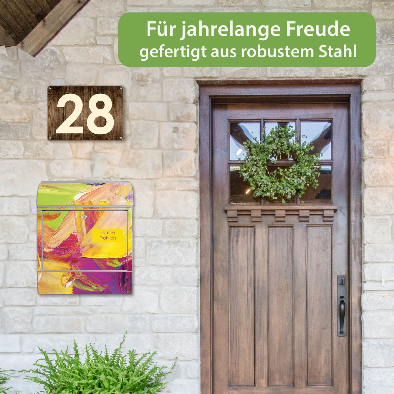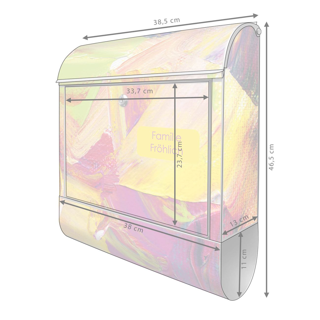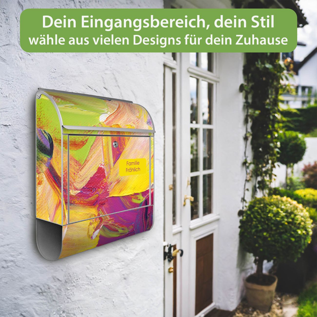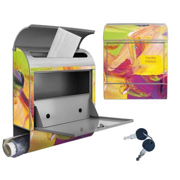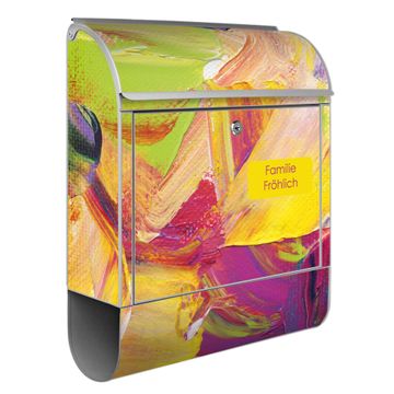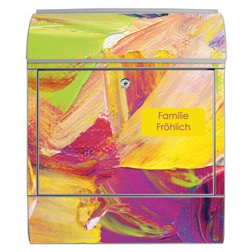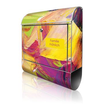 DESIGN: Der Postkasten mit Motiv Motiv Farbe auf Leinwand hat ein sehr ansprechendes und ausgefallenes Design, damit entlocken Sie Ihren Nachbarn und dem Postboten ein Lächeln. Heben Sie Sich von der tristen grauen Masse ab, ohne auf Funktionalität zu verzichten. DETAILS: Der Postkasten besteht aus pulverbeschichtetem Stahl. Er ist 38x46x12,5cm groß. Das Motiv besteht aus einer wetter- und UV-resistenten Folie, die mit einem Schutzlaminat überzogen ist, sodass der Briefkasten zusätzlich vor Kratzern geschützt ist. Der Briefkasten wird mit Montagematerial, zusätzlich zwei Schlüssel sowie einer Bohrschablone geliefert. NUTZEN: Sie können diesen Briefkasten sowohl als Wandbriefkasten montieren oder einen passenden Ständer kaufen und als Standbriefkasten einbetonieren. Die Größe bietet genügend Platz für Sendungen aller Art, der Einwurf fasst auch größere A4 Sendungen. BANJADO: Ihr Briefkasten wird in Sachsen in einer kleinen Manufaktur von Hand veredelt. Die Motivfolie ist lösungsmittelfrei und schutzlaminiert für einen langen Halt. Wir legen großen Wert auf die Verbindung von Funktionalität und Design. Sie erhalten Handarbeit aus Sachsen.