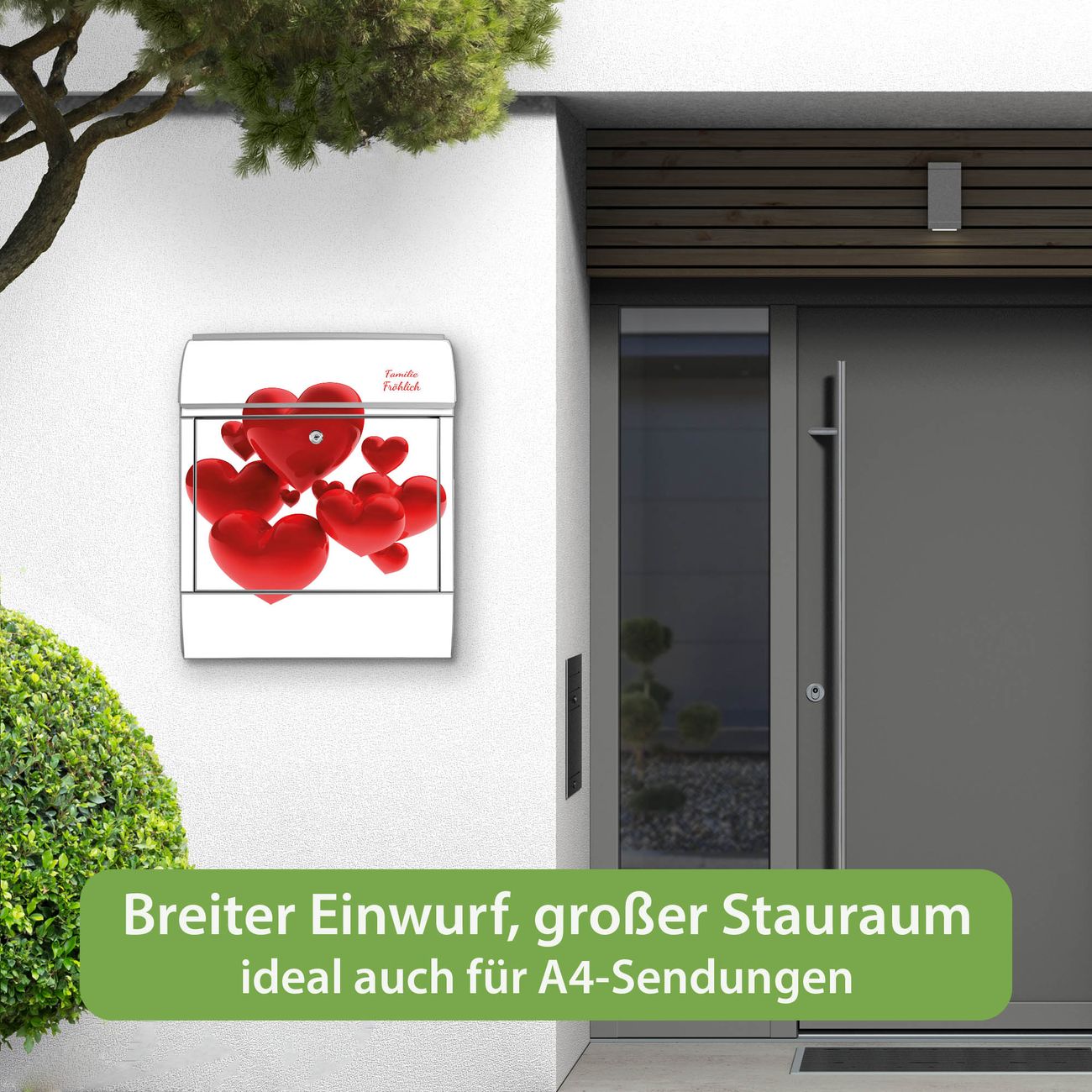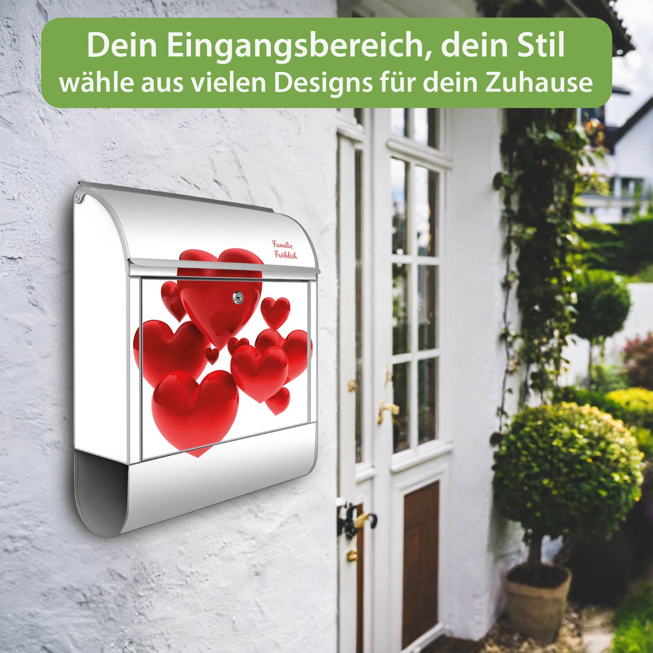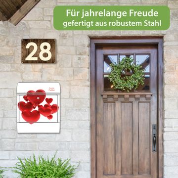DESIGN: Der Postkasten mit Motiv Motiv Fliegende Herzen hat ein sehr ansprechendes und ausgefallenes Design, damit entlocken Sie Ihren Nachbarn und dem Postboten ein Lächeln. Heben Sie Sich von der tristen grauen Masse ab, ohne auf Funktionalität zu verzichten.