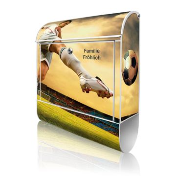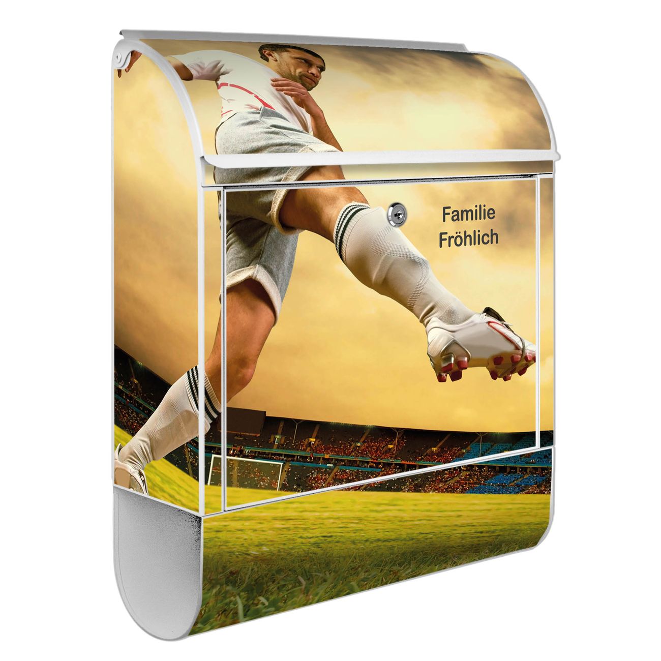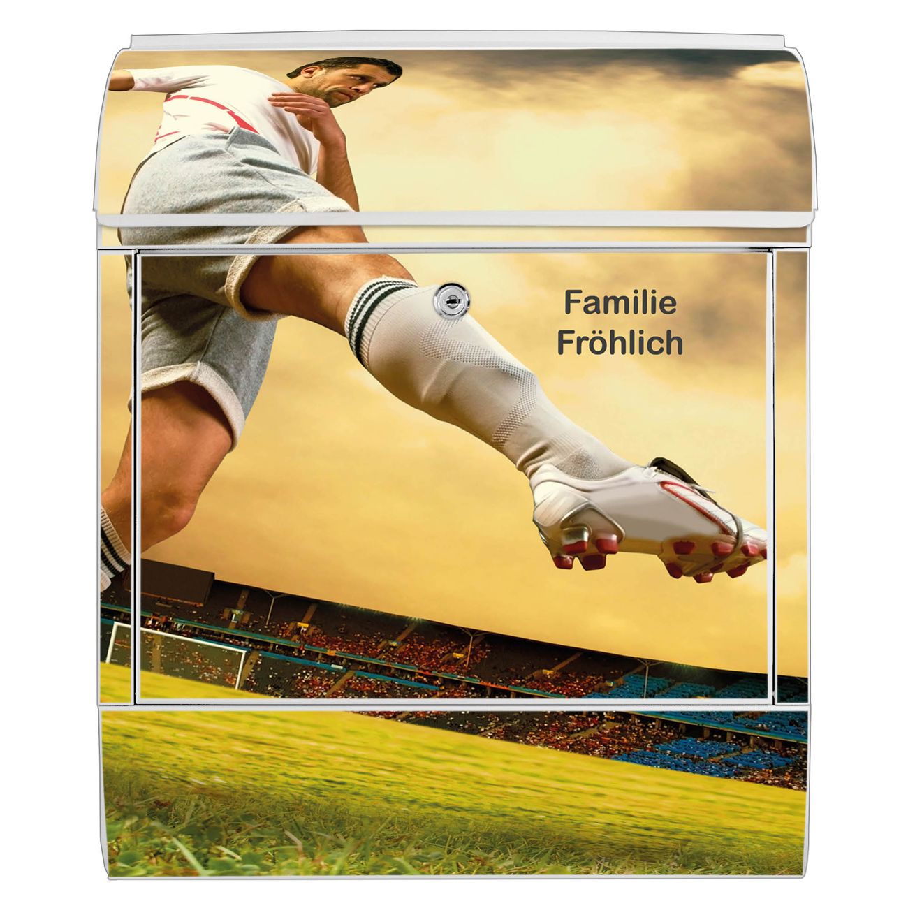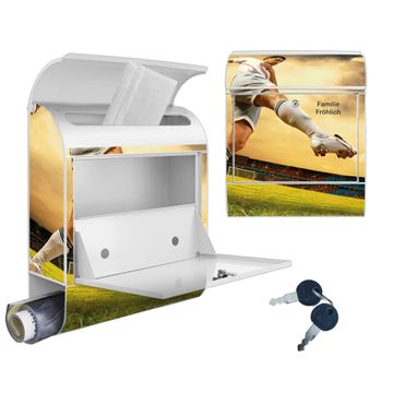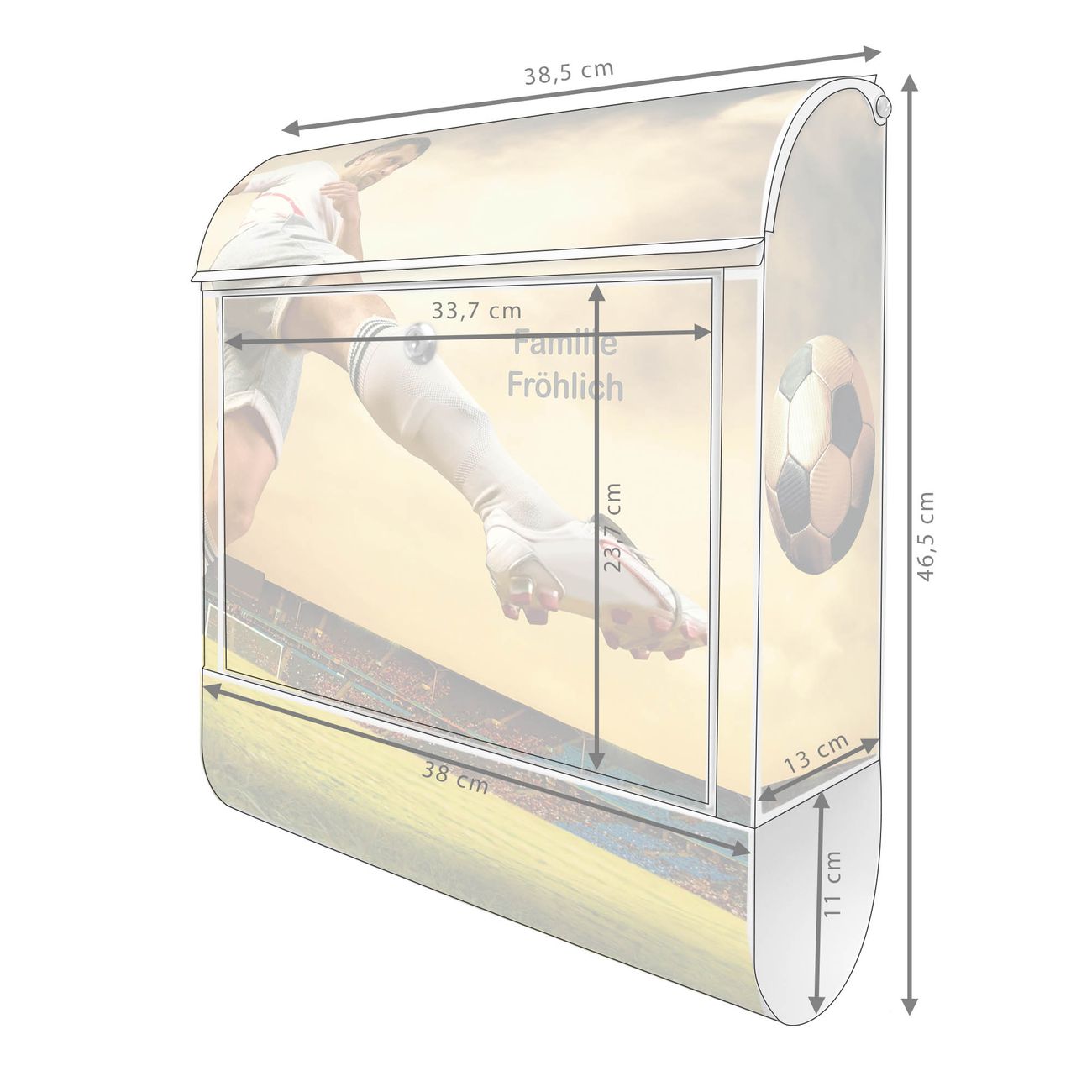 DESIGN: Der Postkasten mit Motiv Motiv Football hat ein sehr ansprechendes und ausgefallenes Design, damit entlocken Sie Ihren Nachbarn und dem Postboten ein Lächeln. Heben Sie Sich von der tristen grauen Masse ab, ohne auf Funktionalität zu verzichten. DETAILS: Der Postkasten besteht aus pulverbeschichtetem Stahl. Er ist 38x46x12,5cm groß. Das Motiv besteht aus einer wetter- und UV-resistenten Folie, die mit einem Schutzlaminat überzogen ist, sodass der Briefkasten zusätzlich vor Kratzern geschützt ist. Der Briefkasten wird mit Montagematerial, zusätzlich zwei Schlüssel sowie einer Bohrschablone geliefert. NUTZEN: Sie können diesen Briefkasten sowohl als Wandbriefkasten montieren oder einen passenden Ständer kaufen und als Standbriefkasten einbetonieren. Die Größe bietet genügend Platz für Sendungen aller Art, der Einwurf fasst auch größere A4 Sendungen. BANJADO: Ihr Briefkasten wird in Sachsen in einer kleinen Manufaktur von Hand veredelt. Die Motivfolie ist lösungsmittelfrei und schutzlaminiert für einen langen Halt. Wir legen großen Wert auf die Verbindung von Funktionalität und Design. Sie erhalten Handarbeit aus Sachsen.