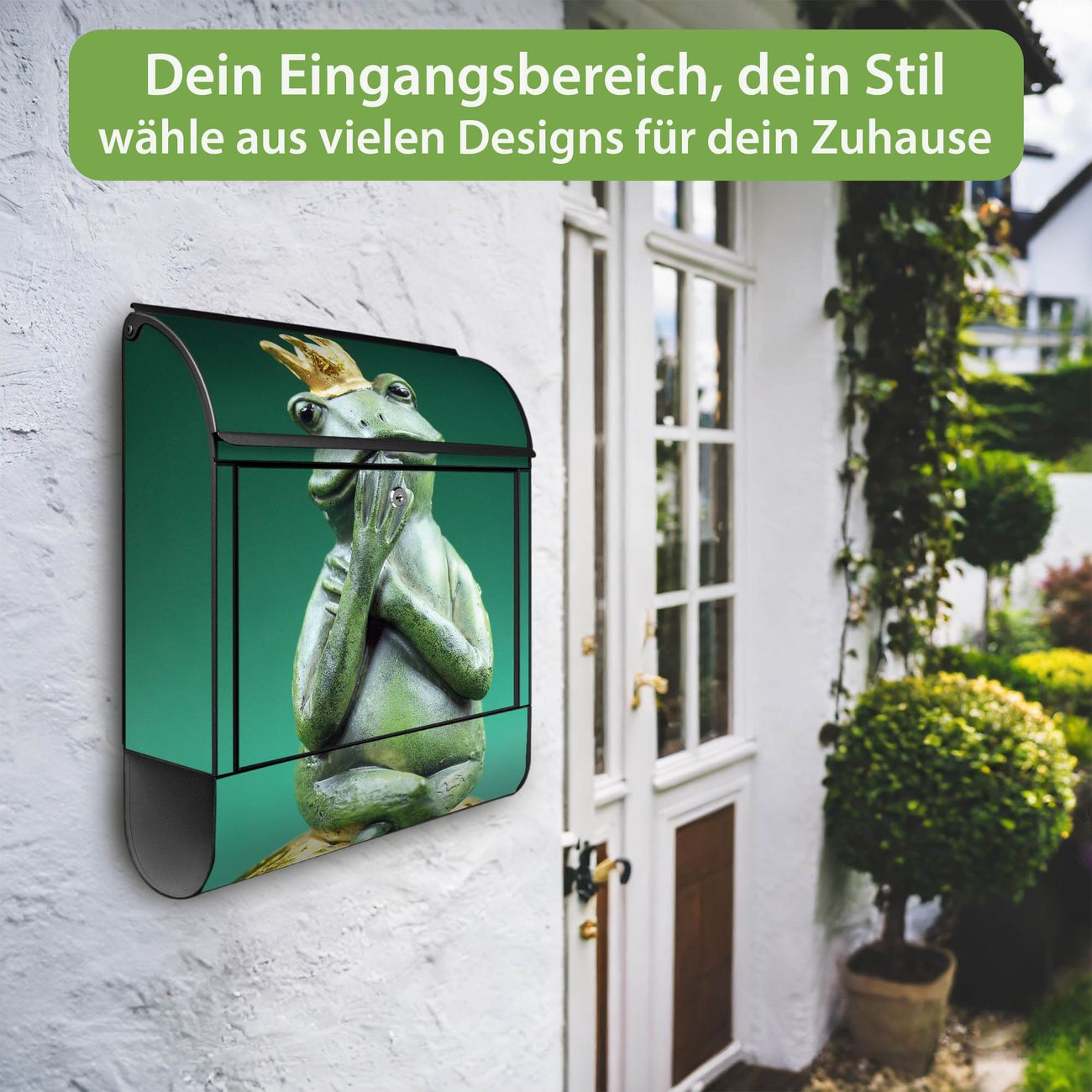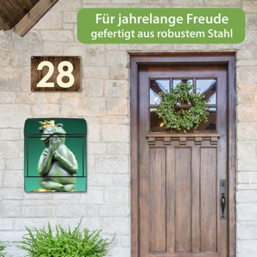 DESIGN: Der Postkasten mit Motiv Motiv Froschkönig hat ein sehr ansprechendes und ausgefallenes Design, damit entlocken Sie Ihren Nachbarn und dem Postboten ein Lächeln. Heben Sie Sich von der tristen grauen Masse ab, ohne auf Funktionalität zu verzichten.