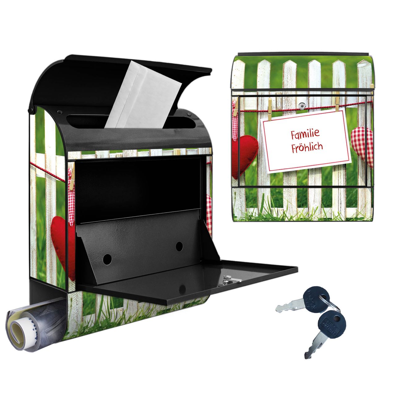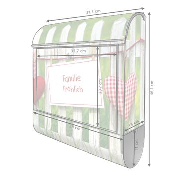DESIGN: Der Postkasten mit Motiv Motiv Gartenzaun hat ein sehr ansprechendes und ausgefallenes Design, damit entlocken Sie Ihren Nachbarn und dem Postboten ein Lächeln. Heben Sie Sich von der tristen grauen Masse ab, ohne auf Funktionalität zu verzichten. DETAILS: Der Postkasten besteht aus pulverbeschichtetem Stahl. Er ist 38x46x12,5cm groß. Das Motiv besteht aus einer wetter- und UV-resistenten Folie, die mit einem Schutzlaminat überzogen ist, sodass der Briefkasten zusätzlich vor Kratzern geschützt ist. Der Briefkasten wird mit Montagematerial, zusätzlich zwei Schlüssel sowie einer Bohrschablone geliefert. NUTZEN: Sie können diesen Briefkasten sowohl als Wandbriefkasten montieren oder einen passenden Ständer kaufen und als Standbriefkasten einbetonieren. Die Größe bietet genügend Platz für Sendungen aller Art, der Einwurf fasst auch größere A4 Sendungen. BANJADO: Ihr Briefkasten wird in Sachsen in einer kleinen Manufaktur von Hand veredelt. Die Motivfolie ist lösungsmittelfrei und schutzlaminiert für einen langen Halt. Wir legen großen Wert auf die Verbindung von Funktionalität und Design. Sie erhalten Handarbeit aus Sachsen.