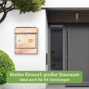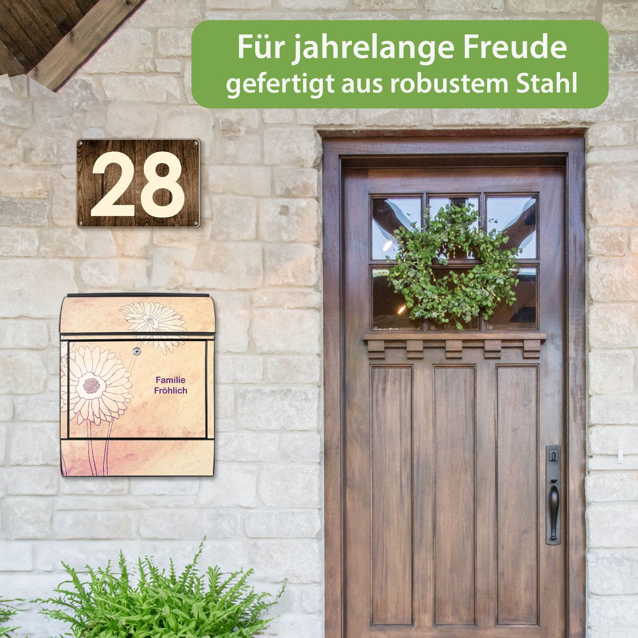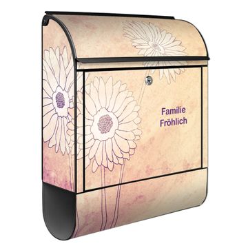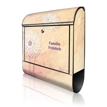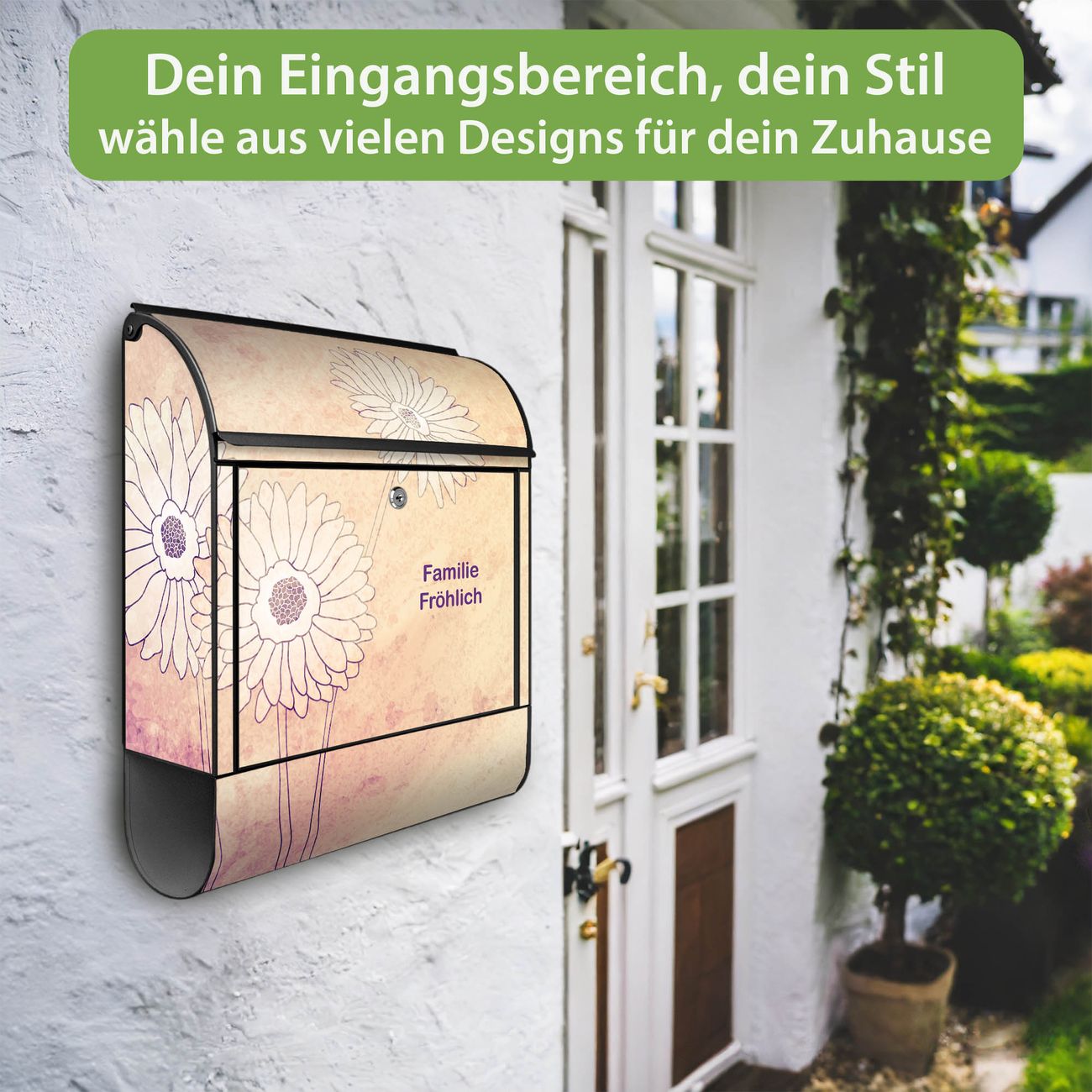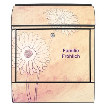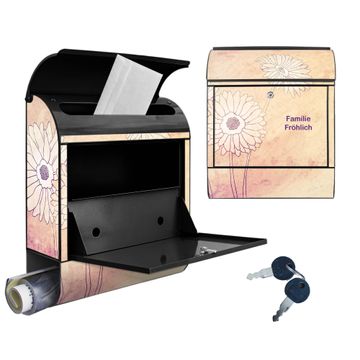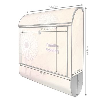 DESIGN: Der Postkasten mit Motiv Motiv Gerbera hat ein sehr ansprechendes und ausgefallenes Design, damit entlocken Sie Ihren Nachbarn und dem Postboten ein Lächeln. Heben Sie Sich von der tristen grauen Masse ab, ohne auf Funktionalität zu verzichten. DETAILS: Der Postkasten besteht aus pulverbeschichtetem Stahl. Er ist 38x46x12,5cm groß. Das Motiv besteht aus einer wetter- und UV-resistenten Folie, die mit einem Schutzlaminat überzogen ist, sodass der Briefkasten zusätzlich vor Kratzern geschützt ist. Der Briefkasten wird mit Montagematerial, zusätzlich zwei Schlüssel sowie einer Bohrschablone geliefert. NUTZEN: Sie können diesen Briefkasten sowohl als Wandbriefkasten montieren oder einen passenden Ständer kaufen und als Standbriefkasten einbetonieren. Die Größe bietet genügend Platz für Sendungen aller Art, der Einwurf fasst auch größere A4 Sendungen. BANJADO: Ihr Briefkasten wird in Sachsen in einer kleinen Manufaktur von Hand veredelt. Die Motivfolie ist lösungsmittelfrei und schutzlaminiert für einen langen Halt. Wir legen großen Wert auf die Verbindung von Funktionalität und Design. Sie erhalten Handarbeit aus Sachsen.
