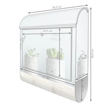 DESIGN: Der Postkasten mit Motiv Motiv Kakteen in Beton hat ein sehr ansprechendes und ausgefallenes Design, damit entlocken Sie Ihren Nachbarn und dem Postboten ein Lächeln. Heben Sie Sich von der tristen grauen Masse ab, ohne auf Funktionalität zu verzichten. DETAILS: Der Postkasten besteht aus pulverbeschichtetem Stahl. Er ist 38x46x12,5cm groß. Das Motiv besteht aus einer wetter- und UV-resistenten Folie, die mit einem Schutzlaminat überzogen ist, sodass der Briefkasten zusätzlich vor Kratzern geschützt ist. Der Briefkasten wird mit Montagematerial, zusätzlich zwei Schlüssel sowie einer Bohrschablone geliefert. NUTZEN: Sie können diesen Briefkasten sowohl als Wandbriefkasten montieren oder einen passenden Ständer kaufen und als Standbriefkasten einbetonieren. Die Größe bietet genügend Platz für Sendungen aller Art, der Einwurf fasst auch größere A4 Sendungen. BANJADO: Ihr Briefkasten wird in Sachsen in einer kleinen Manufaktur von Hand veredelt. Die Motivfolie ist lösungsmittelfrei und schutzlaminiert für einen langen Halt. Wir legen großen Wert auf die Verbindung von Funktionalität und Design. Sie erhalten Handarbeit aus Sachsen.