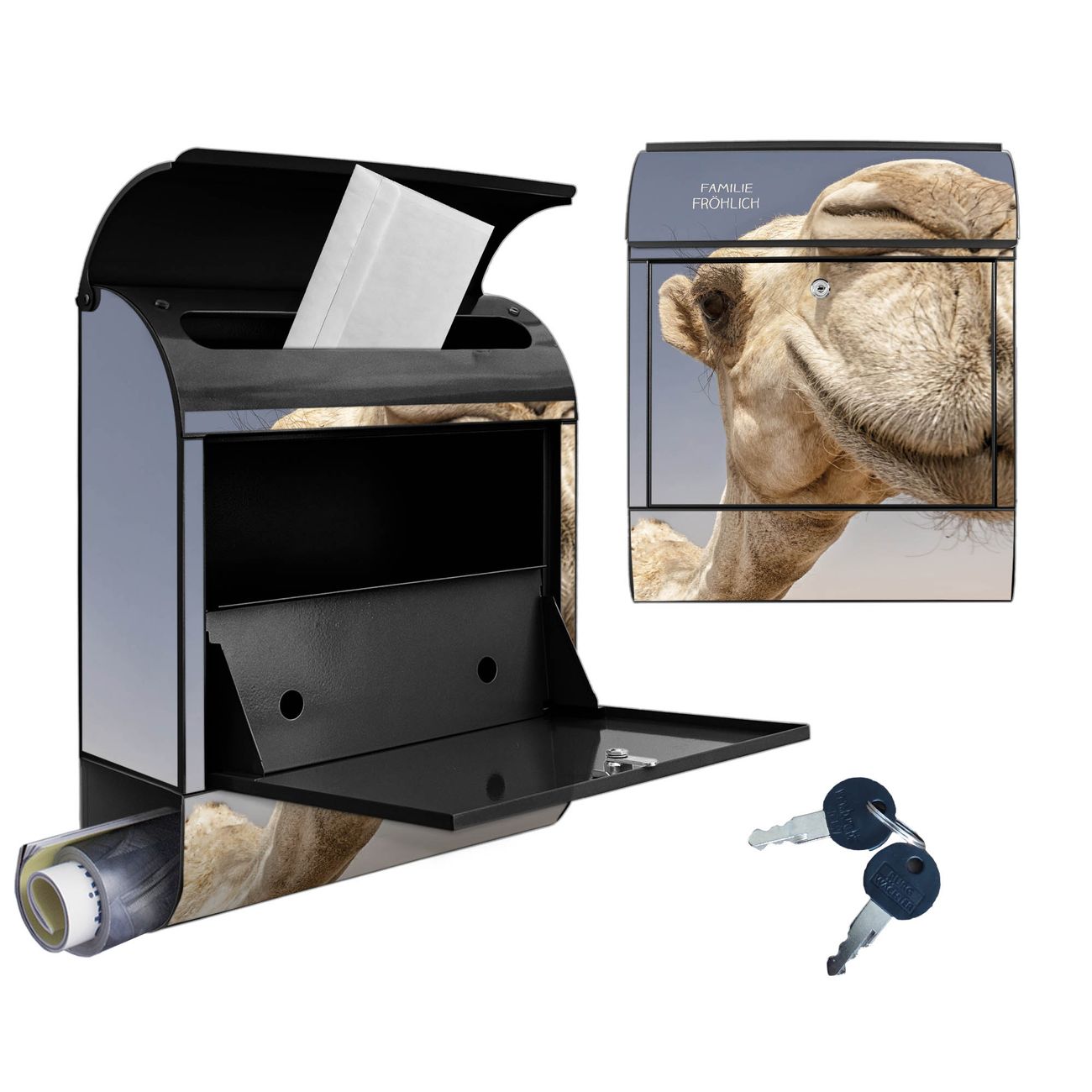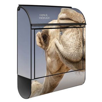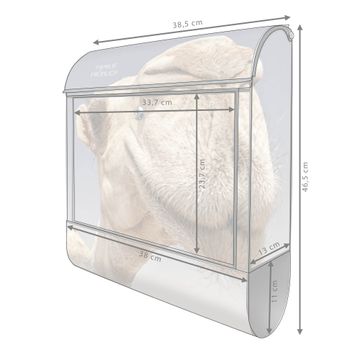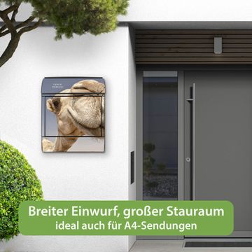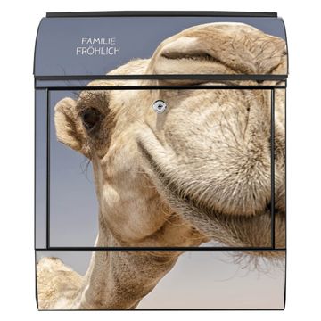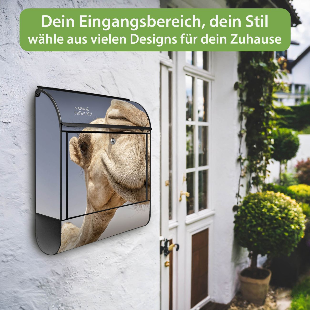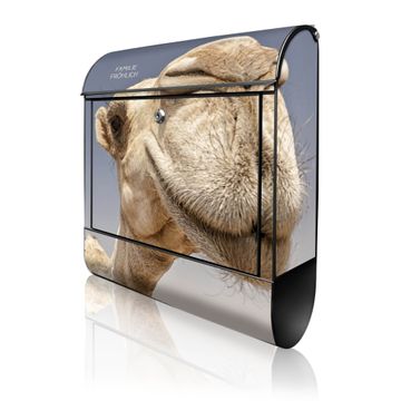 DESIGN: Der Postkasten mit Motiv Motiv Kamele hat ein sehr ansprechendes und ausgefallenes Design, damit entlocken Sie Ihren Nachbarn und dem Postboten ein Lächeln. Heben Sie Sich von der tristen grauen Masse ab, ohne auf Funktionalität zu verzichten. DETAILS: Der Postkasten besteht aus pulverbeschichtetem Stahl. Er ist 38x46x12,5cm groß. Das Motiv besteht aus einer wetter- und UV-resistenten Folie, die mit einem Schutzlaminat überzogen ist, sodass der Briefkasten zusätzlich vor Kratzern geschützt ist. Der Briefkasten wird mit Montagematerial, zusätzlich zwei Schlüssel sowie einer Bohrschablone geliefert. NUTZEN: Sie können diesen Briefkasten sowohl als Wandbriefkasten montieren oder einen passenden Ständer kaufen und als Standbriefkasten einbetonieren. Die Größe bietet genügend Platz für Sendungen aller Art, der Einwurf fasst auch größere A4 Sendungen. BANJADO: Ihr Briefkasten wird in Sachsen in einer kleinen Manufaktur von Hand veredelt. Die Motivfolie ist lösungsmittelfrei und schutzlaminiert für einen langen Halt. Wir legen großen Wert auf die Verbindung von Funktionalität und Design. Sie erhalten Handarbeit aus Sachsen.