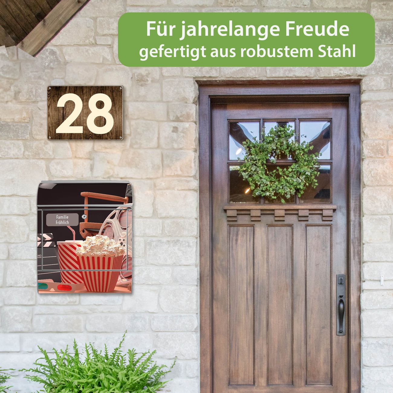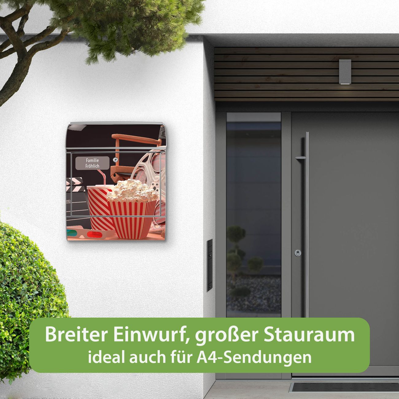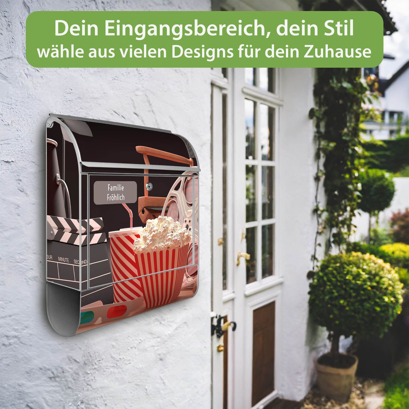 DESIGN: Der Postkasten mit Motiv Motiv Kino hat ein sehr ansprechendes und ausgefallenes Design, damit entlocken Sie Ihren Nachbarn und dem Postboten ein Lächeln. Heben Sie Sich von der tristen grauen Masse ab, ohne auf Funktionalität zu verzichten. DETAILS: Der Postkasten besteht aus pulverbeschichtetem Stahl. Er ist 38x46x12,5cm groß. Das Motiv besteht aus einer wetter- und UV-resistenten Folie, die mit einem Schutzlaminat überzogen ist, sodass der Briefkasten zusätzlich vor Kratzern geschützt ist. Der Briefkasten wird mit Montagematerial, zusätzlich zwei Schlüssel sowie einer Bohrschablone geliefert. NUTZEN: Sie können diesen Briefkasten sowohl als Wandbriefkasten montieren oder einen passenden Ständer kaufen und als Standbriefkasten einbetonieren. Die Größe bietet genügend Platz für Sendungen aller Art, der Einwurf fasst auch größere A4 Sendungen. BANJADO: Ihr Briefkasten wird in Sachsen in einer kleinen Manufaktur von Hand veredelt. Die Motivfolie ist lösungsmittelfrei und schutzlaminiert für einen langen Halt. Wir legen großen Wert auf die Verbindung von Funktionalität und Design. Sie erhalten Handarbeit aus Sachsen.