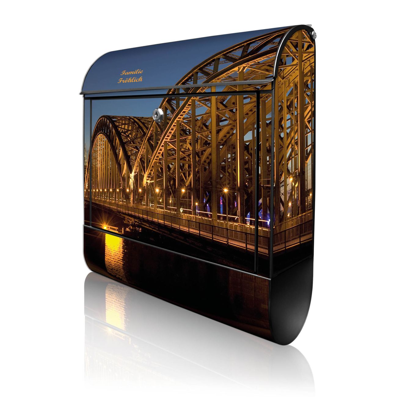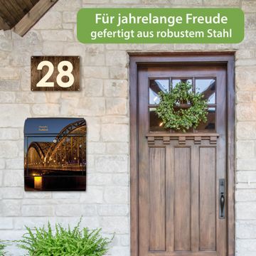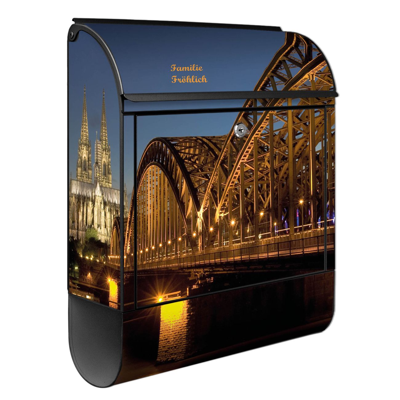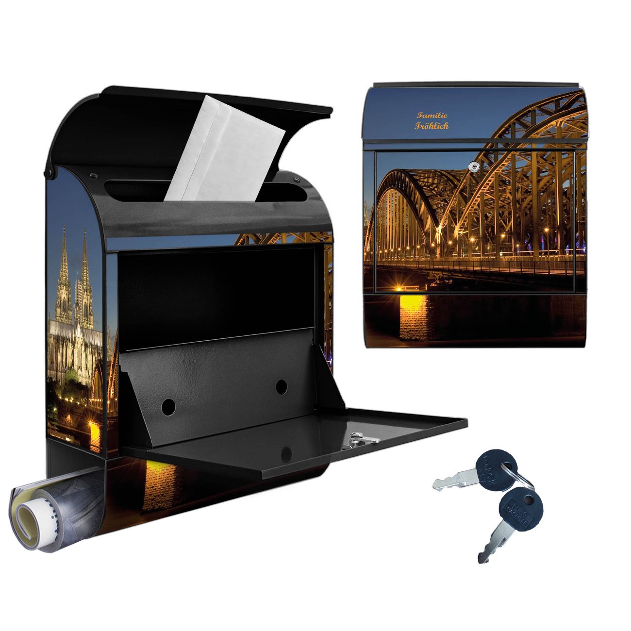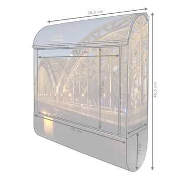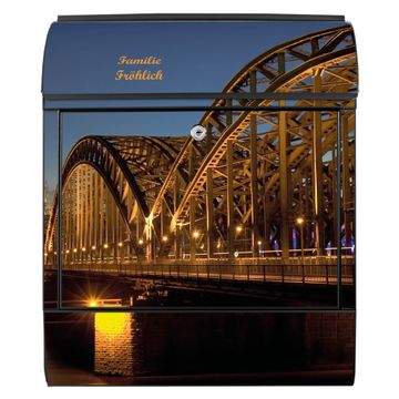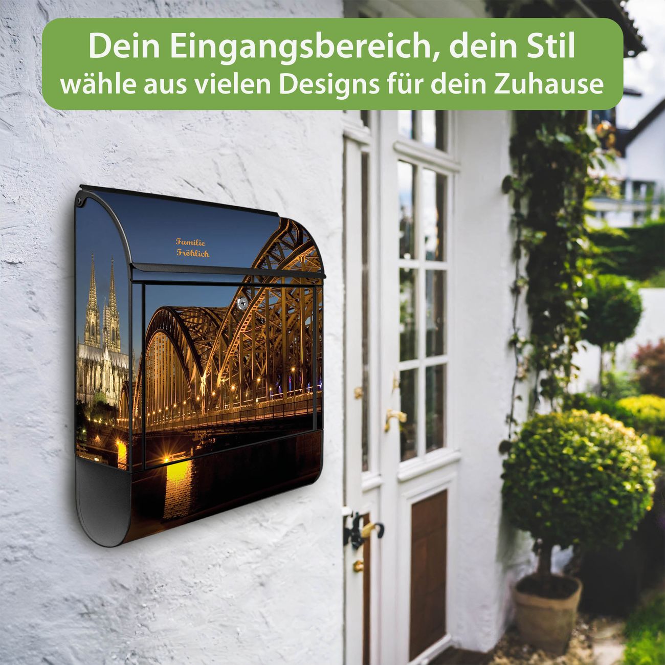 DESIGN: Der Postkasten mit Motiv Motiv Köln hat ein sehr ansprechendes und ausgefallenes Design, damit entlocken Sie Ihren Nachbarn und dem Postboten ein Lächeln. Heben Sie Sich von der tristen grauen Masse ab, ohne auf Funktionalität zu verzichten. DETAILS: Der Postkasten besteht aus pulverbeschichtetem Stahl. Er ist 38x46x12,5cm groß. Das Motiv besteht aus einer wetter- und UV-resistenten Folie, die mit einem Schutzlaminat überzogen ist, sodass der Briefkasten zusätzlich vor Kratzern geschützt ist. Der Briefkasten wird mit Montagematerial, zusätzlich zwei Schlüssel sowie einer Bohrschablone geliefert. NUTZEN: Sie können diesen Briefkasten sowohl als Wandbriefkasten montieren oder einen passenden Ständer kaufen und als Standbriefkasten einbetonieren. Die Größe bietet genügend Platz für Sendungen aller Art, der Einwurf fasst auch größere A4 Sendungen. BANJADO: Ihr Briefkasten wird in Sachsen in einer kleinen Manufaktur von Hand veredelt. Die Motivfolie ist lösungsmittelfrei und schutzlaminiert für einen langen Halt. Wir legen großen Wert auf die Verbindung von Funktionalität und Design. Sie erhalten Handarbeit aus Sachsen.