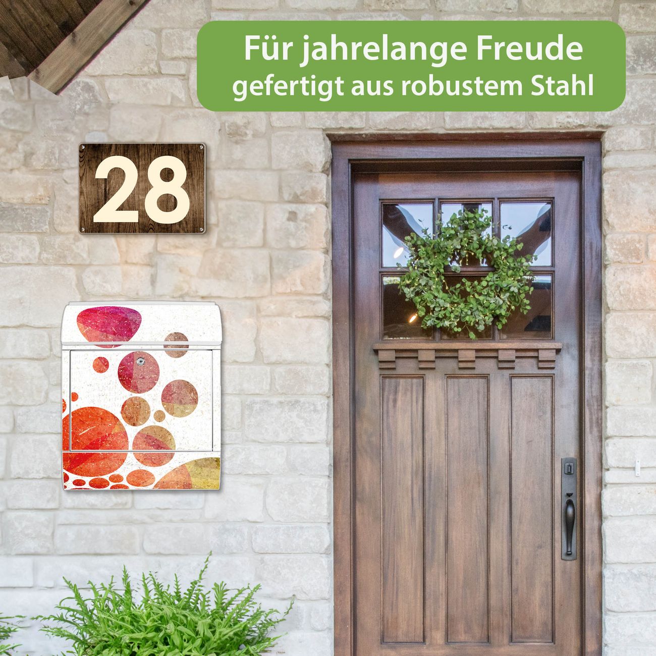 DESIGN: Der Postkasten mit Motiv Motiv Kreise hat ein sehr ansprechendes und ausgefallenes Design, damit entlocken Sie Ihren Nachbarn und dem Postboten ein Lächeln. Heben Sie Sich von der tristen grauen Masse ab, ohne auf Funktionalität zu verzichten.