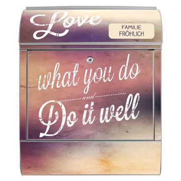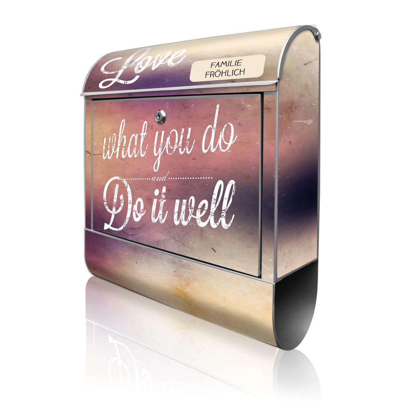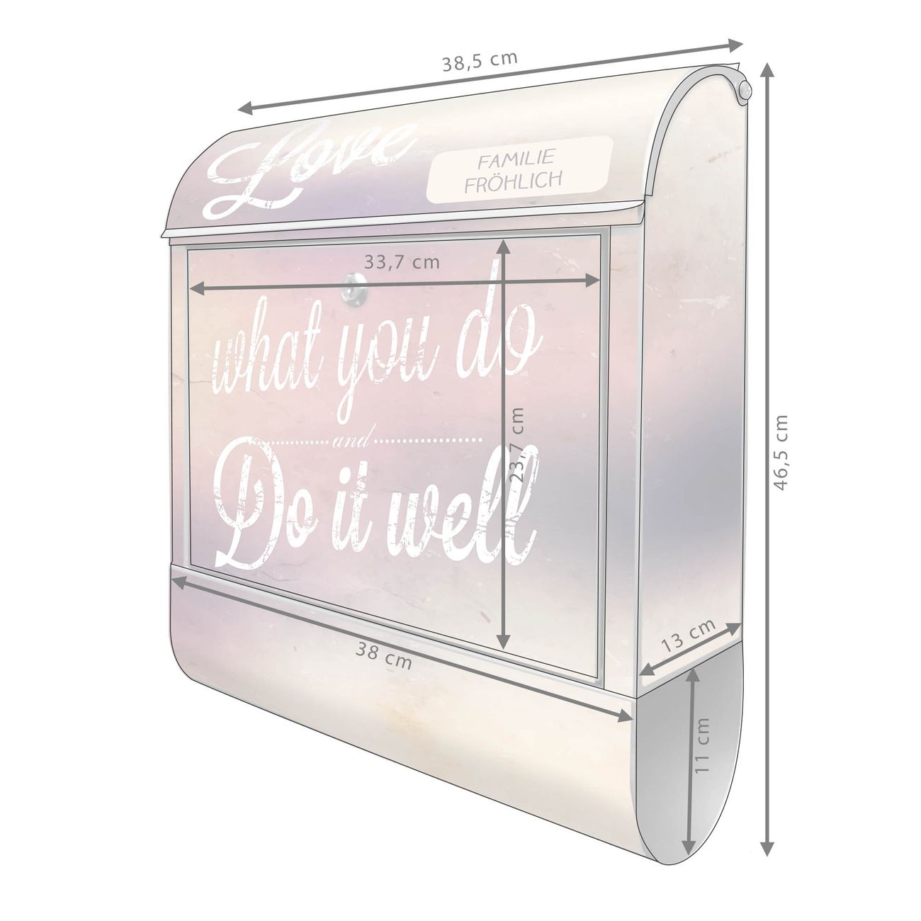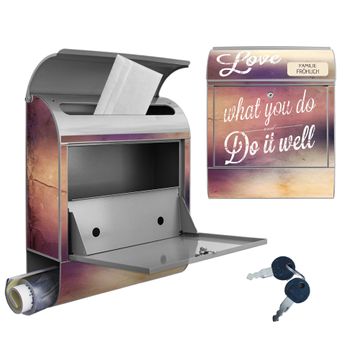 DESIGN: Der Postkasten mit Motiv Motiv Love What You Do hat ein sehr ansprechendes und ausgefallenes Design, damit entlocken Sie Ihren Nachbarn und dem Postboten ein Lächeln. Heben Sie Sich von der tristen grauen Masse ab, ohne auf Funktionalität zu verzichten. DETAILS: Der Postkasten besteht aus pulverbeschichtetem Stahl. Er ist 38x46x12,5cm groß. Das Motiv besteht aus einer wetter- und UV-resistenten Folie, die mit einem Schutzlaminat überzogen ist, sodass der Briefkasten zusätzlich vor Kratzern geschützt ist. Der Briefkasten wird mit Montagematerial, zusätzlich zwei Schlüssel sowie einer Bohrschablone geliefert. NUTZEN: Sie können diesen Briefkasten sowohl als Wandbriefkasten montieren oder einen passenden Ständer kaufen und als Standbriefkasten einbetonieren. Die Größe bietet genügend Platz für Sendungen aller Art, der Einwurf fasst auch größere A4 Sendungen. BANJADO: Ihr Briefkasten wird in Sachsen in einer kleinen Manufaktur von Hand veredelt. Die Motivfolie ist lösungsmittelfrei und schutzlaminiert für einen langen Halt. Wir legen großen Wert auf die Verbindung von Funktionalität und Design. Sie erhalten Handarbeit aus Sachsen.