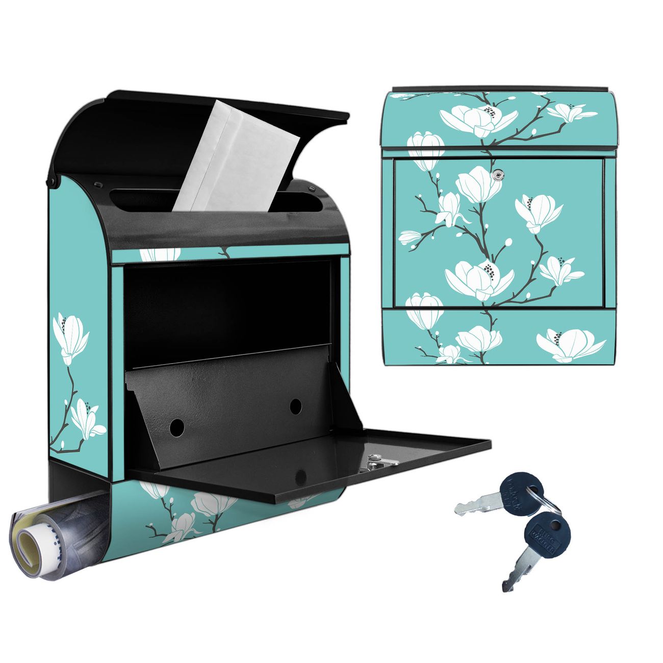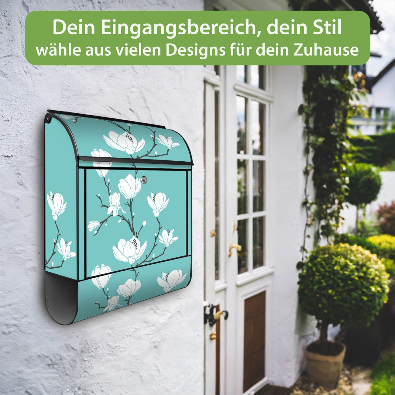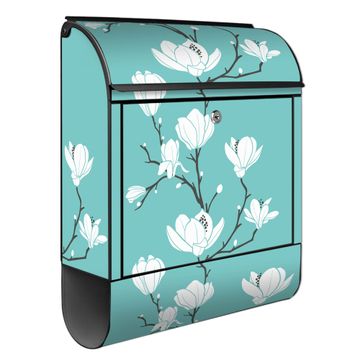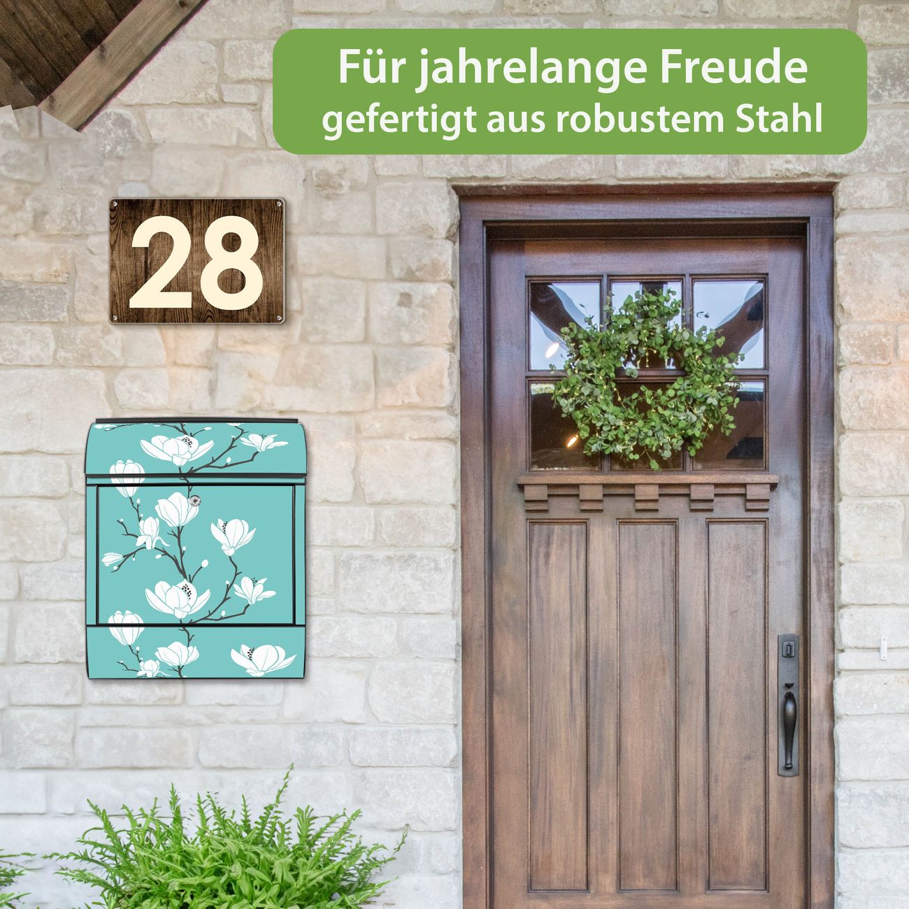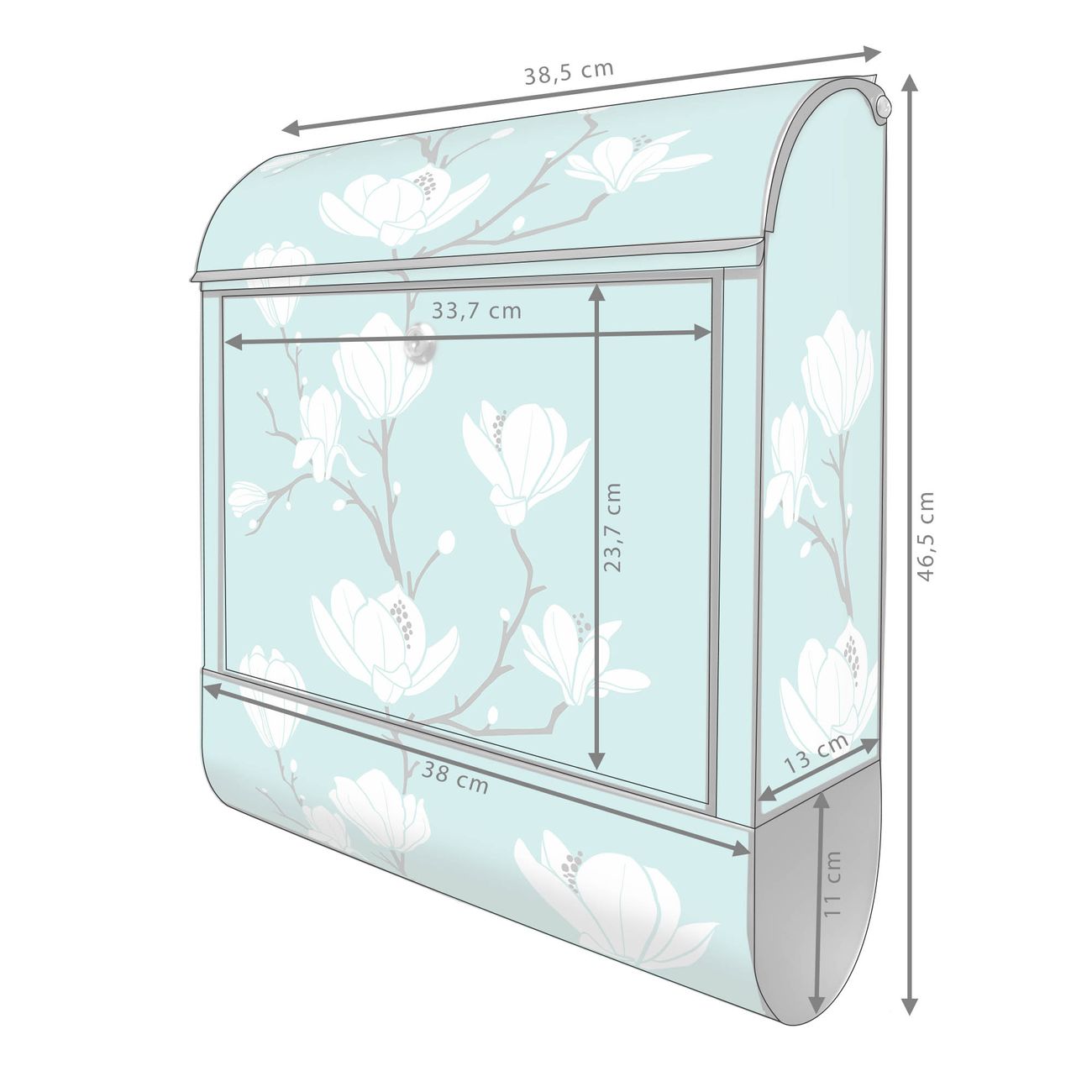 DESIGN: Der Postkasten mit Motiv Motiv Magnolien hat ein sehr ansprechendes und ausgefallenes Design, damit entlocken Sie Ihren Nachbarn und dem Postboten ein Lächeln. Heben Sie Sich von der tristen grauen Masse ab, ohne auf Funktionalität zu verzichten. DETAILS: Der Postkasten besteht aus pulverbeschichtetem Stahl. Er ist 38x46x12,5cm groß. Das Motiv besteht aus einer wetter- und UV-resistenten Folie, die mit einem Schutzlaminat überzogen ist, sodass der Briefkasten zusätzlich vor Kratzern geschützt ist. Der Briefkasten wird mit Montagematerial, zusätzlich zwei Schlüssel sowie einer Bohrschablone geliefert. NUTZEN: Sie können diesen Briefkasten sowohl als Wandbriefkasten montieren oder einen passenden Ständer kaufen und als Standbriefkasten einbetonieren. Die Größe bietet genügend Platz für Sendungen aller Art, der Einwurf fasst auch größere A4 Sendungen. BANJADO: Ihr Briefkasten wird in Sachsen in einer kleinen Manufaktur von Hand veredelt. Die Motivfolie ist lösungsmittelfrei und schutzlaminiert für einen langen Halt. Wir legen großen Wert auf die Verbindung von Funktionalität und Design. Sie erhalten Handarbeit aus Sachsen.