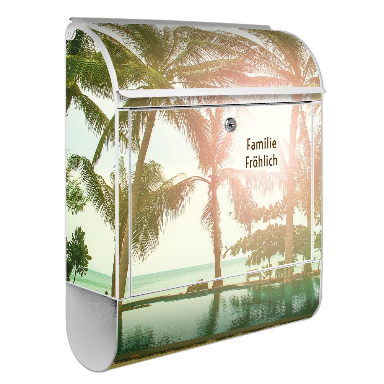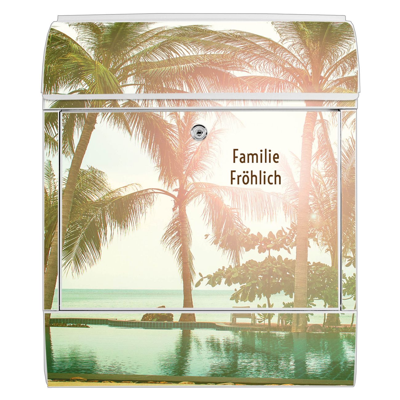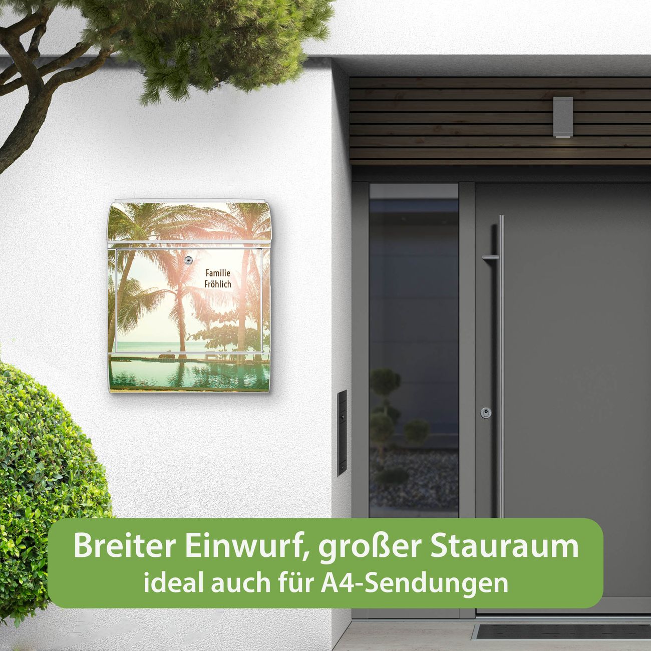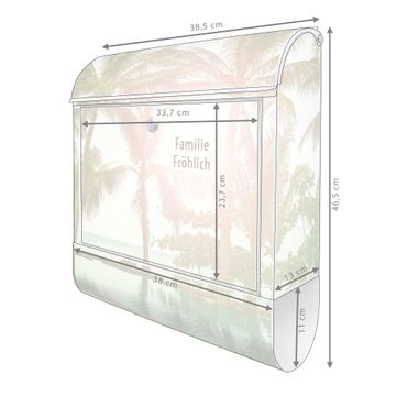DESIGN: Der Postkasten mit Motiv Motiv Palmen hat ein sehr ansprechendes und ausgefallenes Design, damit entlocken Sie Ihren Nachbarn und dem Postboten ein Lächeln. Heben Sie Sich von der tristen grauen Masse ab, ohne auf Funktionalität zu verzichten. DETAILS: Der Postkasten besteht aus pulverbeschichtetem Stahl. Er ist 38x46x12,5cm groß. Das Motiv besteht aus einer wetter- und UV-resistenten Folie, die mit einem Schutzlaminat überzogen ist, sodass der Briefkasten zusätzlich vor Kratzern geschützt ist. Der Briefkasten wird mit Montagematerial, zusätzlich zwei Schlüssel sowie einer Bohrschablone geliefert. NUTZEN: Sie können diesen Briefkasten sowohl als Wandbriefkasten montieren oder einen passenden Ständer kaufen und als Standbriefkasten einbetonieren. Die Größe bietet genügend Platz für Sendungen aller Art, der Einwurf fasst auch größere A4 Sendungen. BANJADO: Ihr Briefkasten wird in Sachsen in einer kleinen Manufaktur von Hand veredelt. Die Motivfolie ist lösungsmittelfrei und schutzlaminiert für einen langen Halt. Wir legen großen Wert auf die Verbindung von Funktionalität und Design. Sie erhalten Handarbeit aus Sachsen.