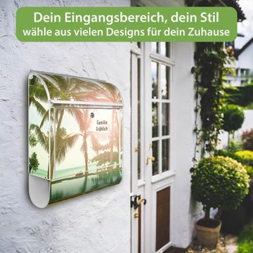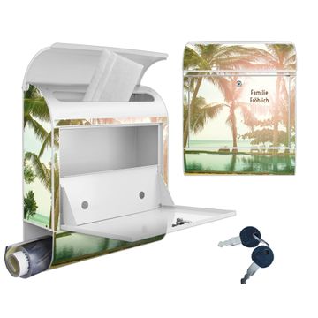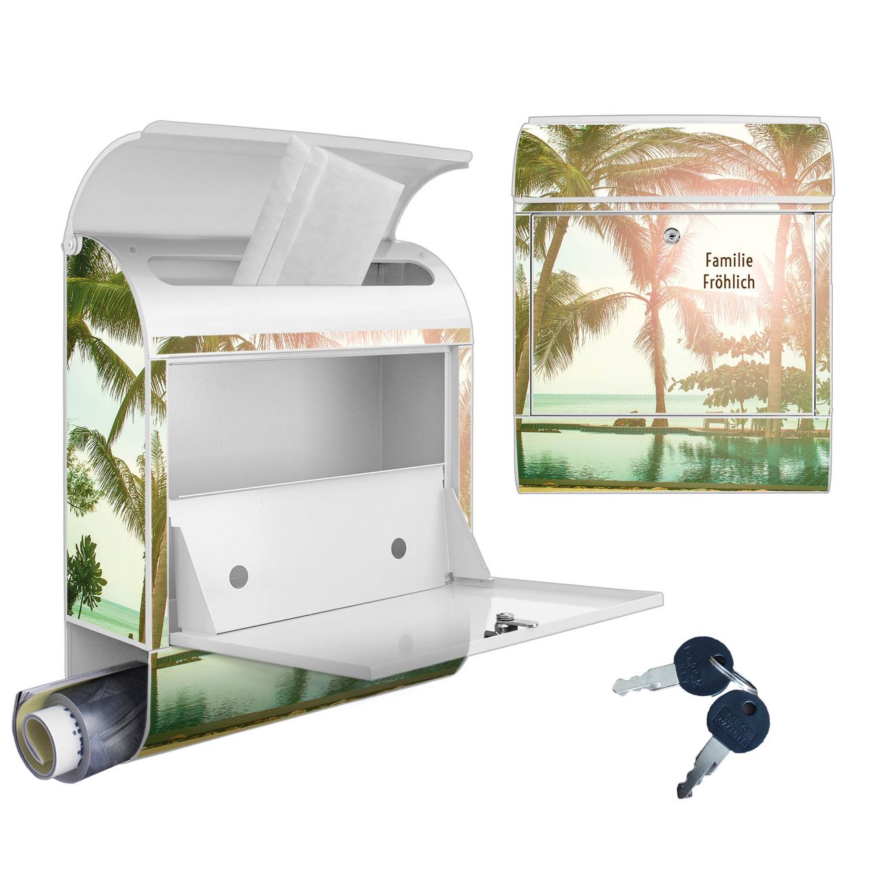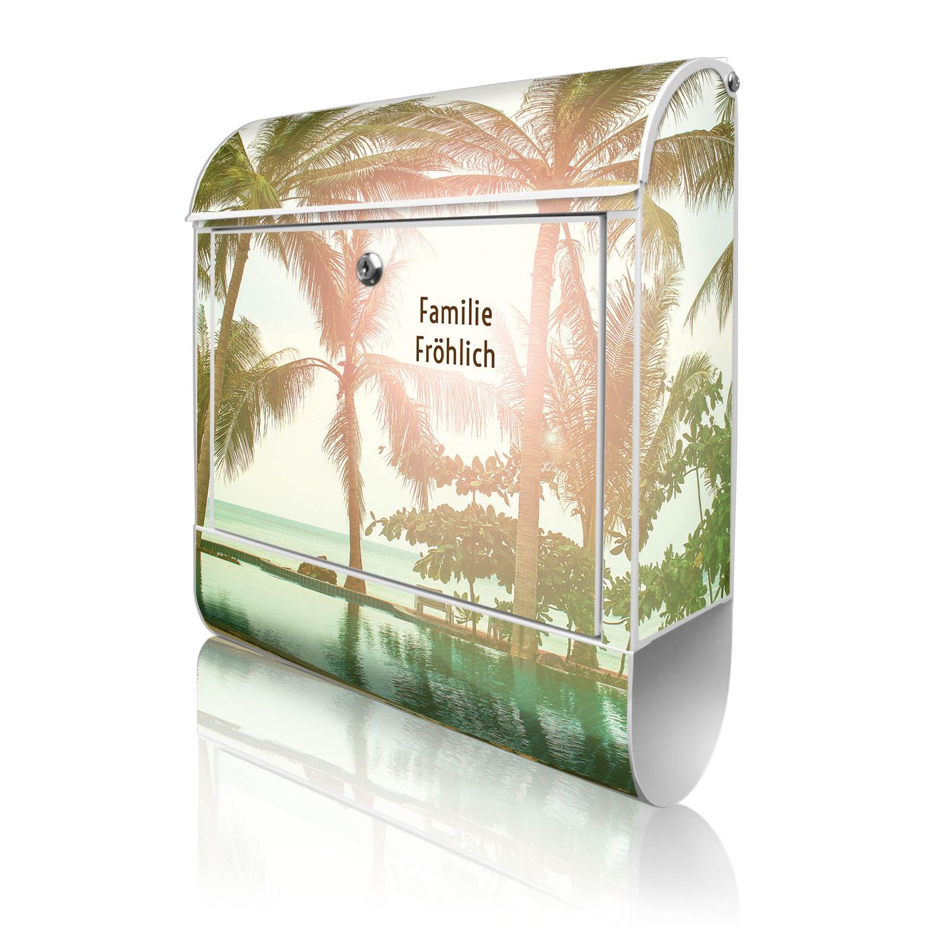 DESIGN: Der Postkasten mit Motiv Motiv Palmen hat ein sehr ansprechendes und ausgefallenes Design, damit entlocken Sie Ihren Nachbarn und dem Postboten ein Lächeln. Heben Sie Sich von der tristen grauen Masse ab, ohne auf Funktionalität zu verzichten. DETAILS: Der Postkasten besteht aus pulverbeschichtetem Stahl. Er ist 38x46x12,5cm groß. Das Motiv besteht aus einer wetter- und UV-resistenten Folie, die mit einem Schutzlaminat überzogen ist, sodass der Briefkasten zusätzlich vor Kratzern geschützt ist. Der Briefkasten wird mit Montagematerial, zusätzlich zwei Schlüssel sowie einer Bohrschablone geliefert. NUTZEN: Sie können diesen Briefkasten sowohl als Wandbriefkasten montieren oder einen passenden Ständer kaufen und als Standbriefkasten einbetonieren. Die Größe bietet genügend Platz für Sendungen aller Art, der Einwurf fasst auch größere A4 Sendungen. BANJADO: Ihr Briefkasten wird in Sachsen in einer kleinen Manufaktur von Hand veredelt. Die Motivfolie ist lösungsmittelfrei und schutzlaminiert für einen langen Halt. Wir legen großen Wert auf die Verbindung von Funktionalität und Design. Sie erhalten Handarbeit aus Sachsen.