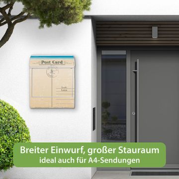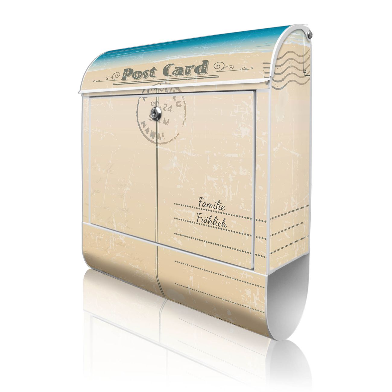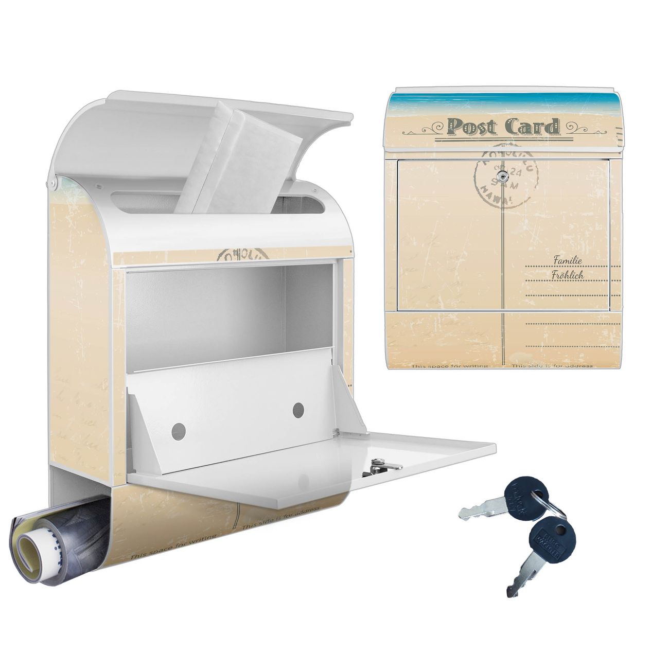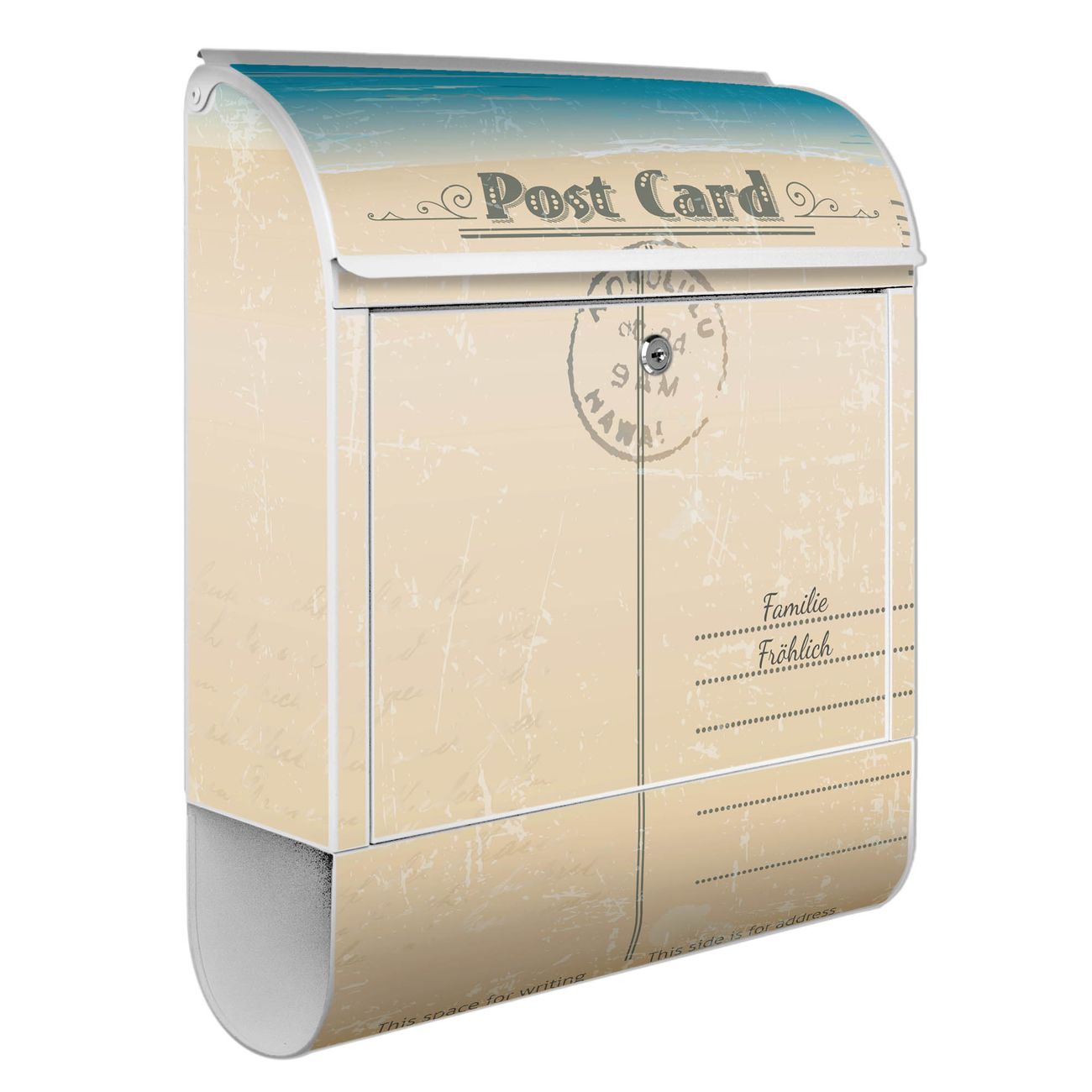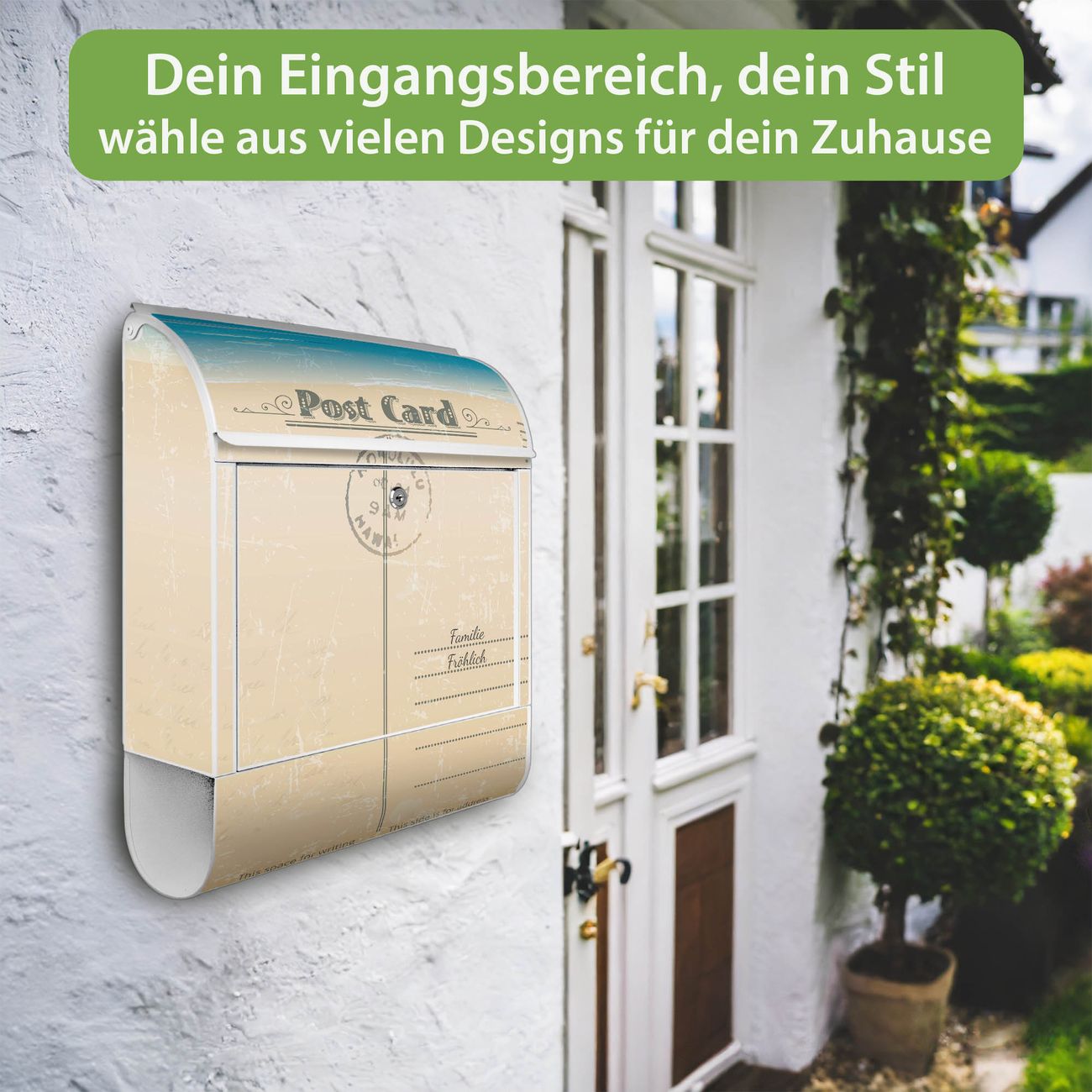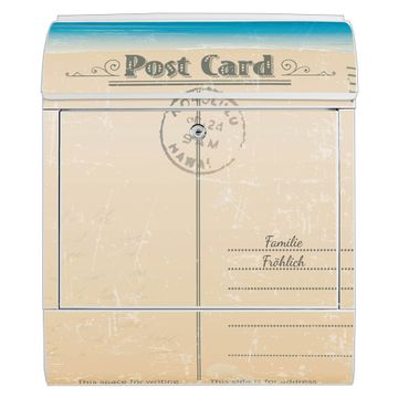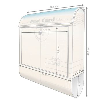 DESIGN: Der Postkasten mit Motiv Motiv Postkarte hat ein sehr ansprechendes und ausgefallenes Design, damit entlocken Sie Ihren Nachbarn und dem Postboten ein Lächeln. Heben Sie Sich von der tristen grauen Masse ab, ohne auf Funktionalität zu verzichten. DETAILS: Der Postkasten besteht aus pulverbeschichtetem Stahl. Er ist 38x46x12,5cm groß. Das Motiv besteht aus einer wetter- und UV-resistenten Folie, die mit einem Schutzlaminat überzogen ist, sodass der Briefkasten zusätzlich vor Kratzern geschützt ist. Der Briefkasten wird mit Montagematerial, zusätzlich zwei Schlüssel sowie einer Bohrschablone geliefert. NUTZEN: Sie können diesen Briefkasten sowohl als Wandbriefkasten montieren oder einen passenden Ständer kaufen und als Standbriefkasten einbetonieren. Die Größe bietet genügend Platz für Sendungen aller Art, der Einwurf fasst auch größere A4 Sendungen. BANJADO: Ihr Briefkasten wird in Sachsen in einer kleinen Manufaktur von Hand veredelt. Die Motivfolie ist lösungsmittelfrei und schutzlaminiert für einen langen Halt. Wir legen großen Wert auf die Verbindung von Funktionalität und Design. Sie erhalten Handarbeit aus Sachsen.