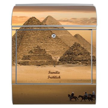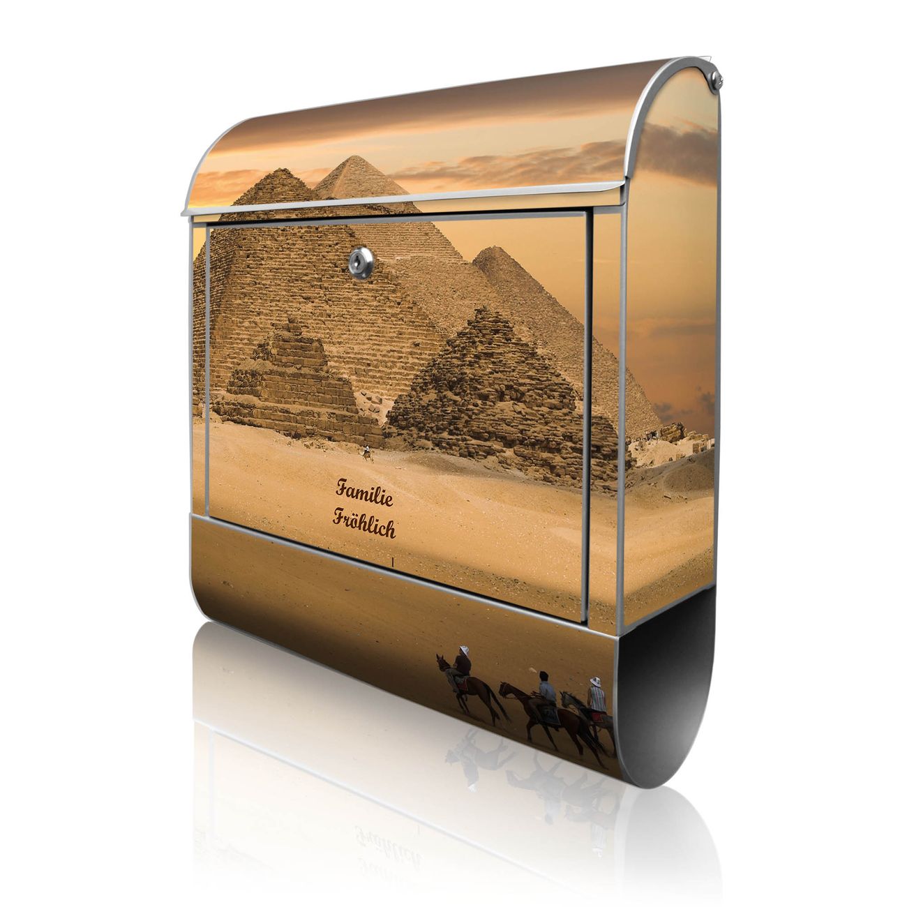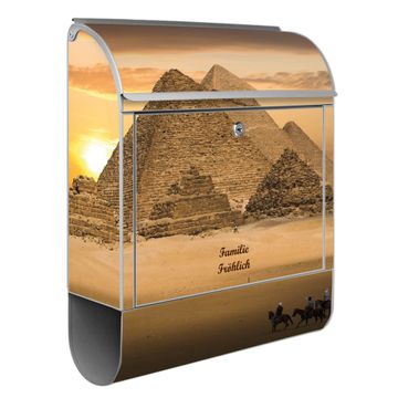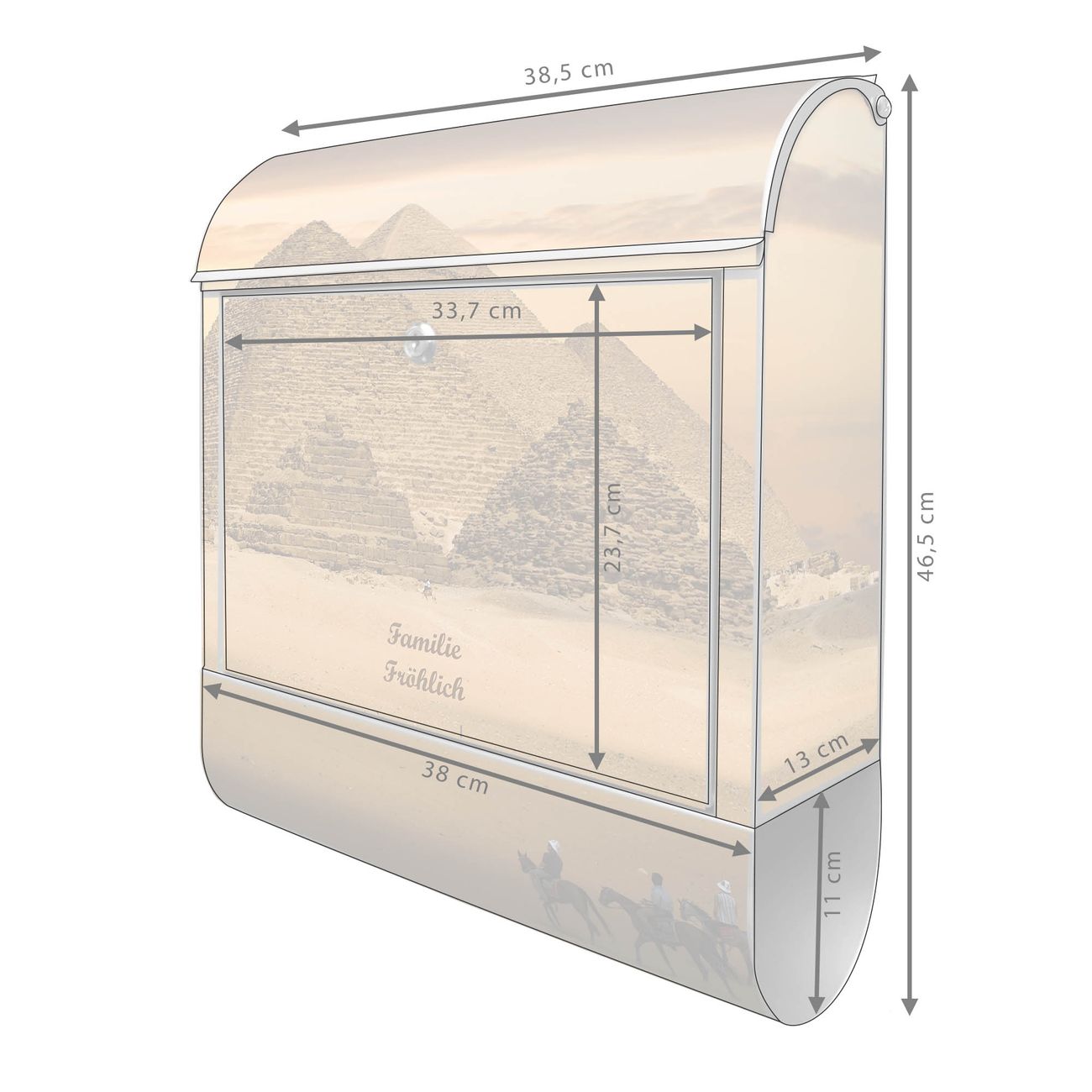 DESIGN: Der Postkasten mit Motiv Motiv Pyramiden hat ein sehr ansprechendes und ausgefallenes Design, damit entlocken Sie Ihren Nachbarn und dem Postboten ein Lächeln. Heben Sie Sich von der tristen grauen Masse ab, ohne auf Funktionalität zu verzichten. DETAILS: Der Postkasten besteht aus pulverbeschichtetem Stahl. Er ist 38x46x12,5cm groß. Das Motiv besteht aus einer wetter- und UV-resistenten Folie, die mit einem Schutzlaminat überzogen ist, sodass der Briefkasten zusätzlich vor Kratzern geschützt ist. Der Briefkasten wird mit Montagematerial, zusätzlich zwei Schlüssel sowie einer Bohrschablone geliefert. NUTZEN: Sie können diesen Briefkasten sowohl als Wandbriefkasten montieren oder einen passenden Ständer kaufen und als Standbriefkasten einbetonieren. Die Größe bietet genügend Platz für Sendungen aller Art, der Einwurf fasst auch größere A4 Sendungen. BANJADO: Ihr Briefkasten wird in Sachsen in einer kleinen Manufaktur von Hand veredelt. Die Motivfolie ist lösungsmittelfrei und schutzlaminiert für einen langen Halt. Wir legen großen Wert auf die Verbindung von Funktionalität und Design. Sie erhalten Handarbeit aus Sachsen.