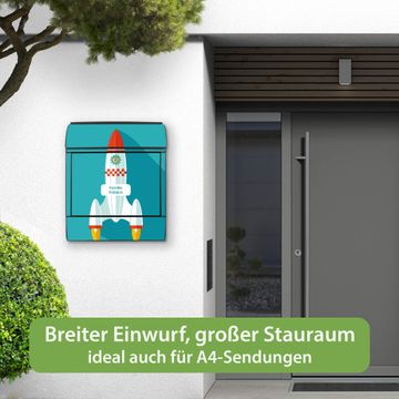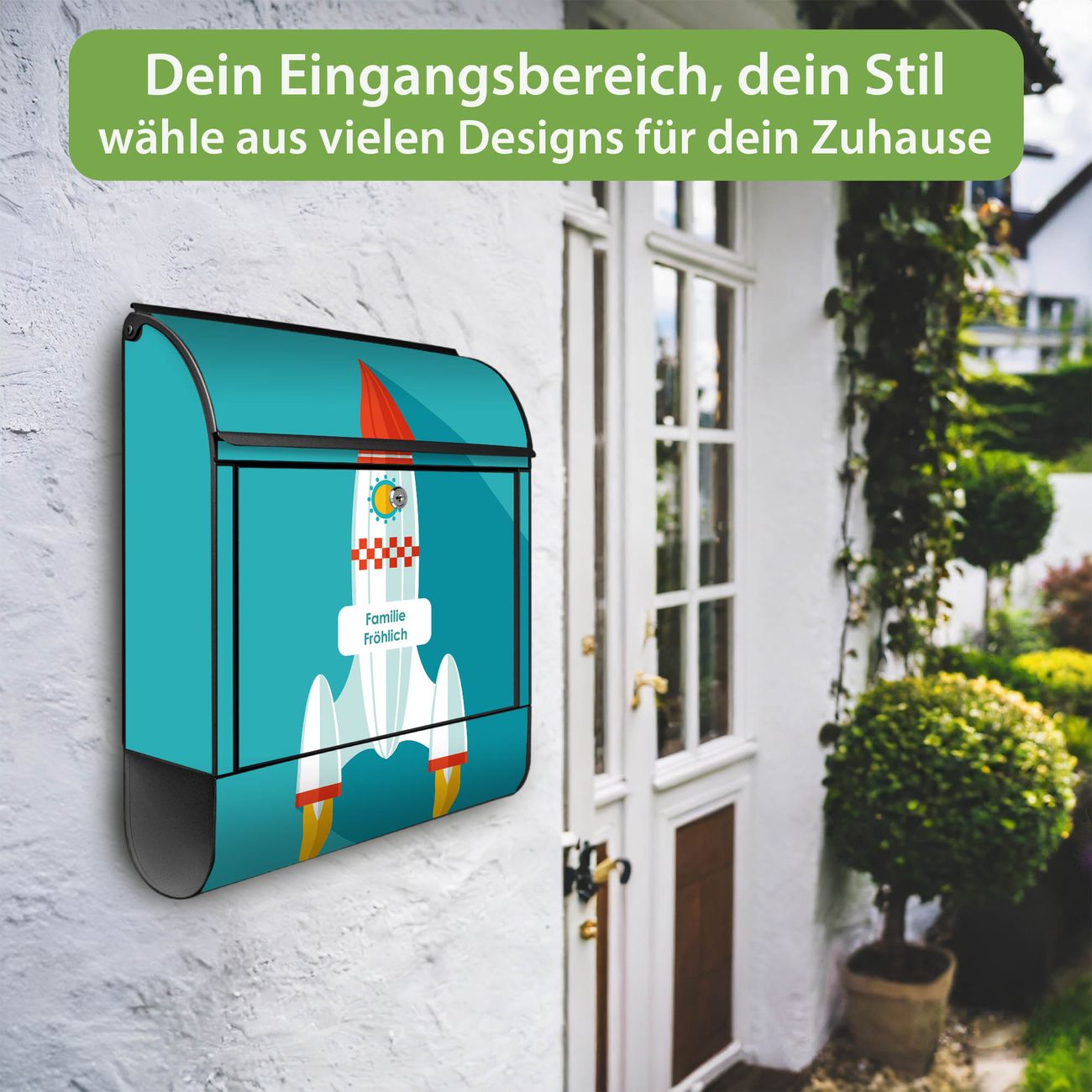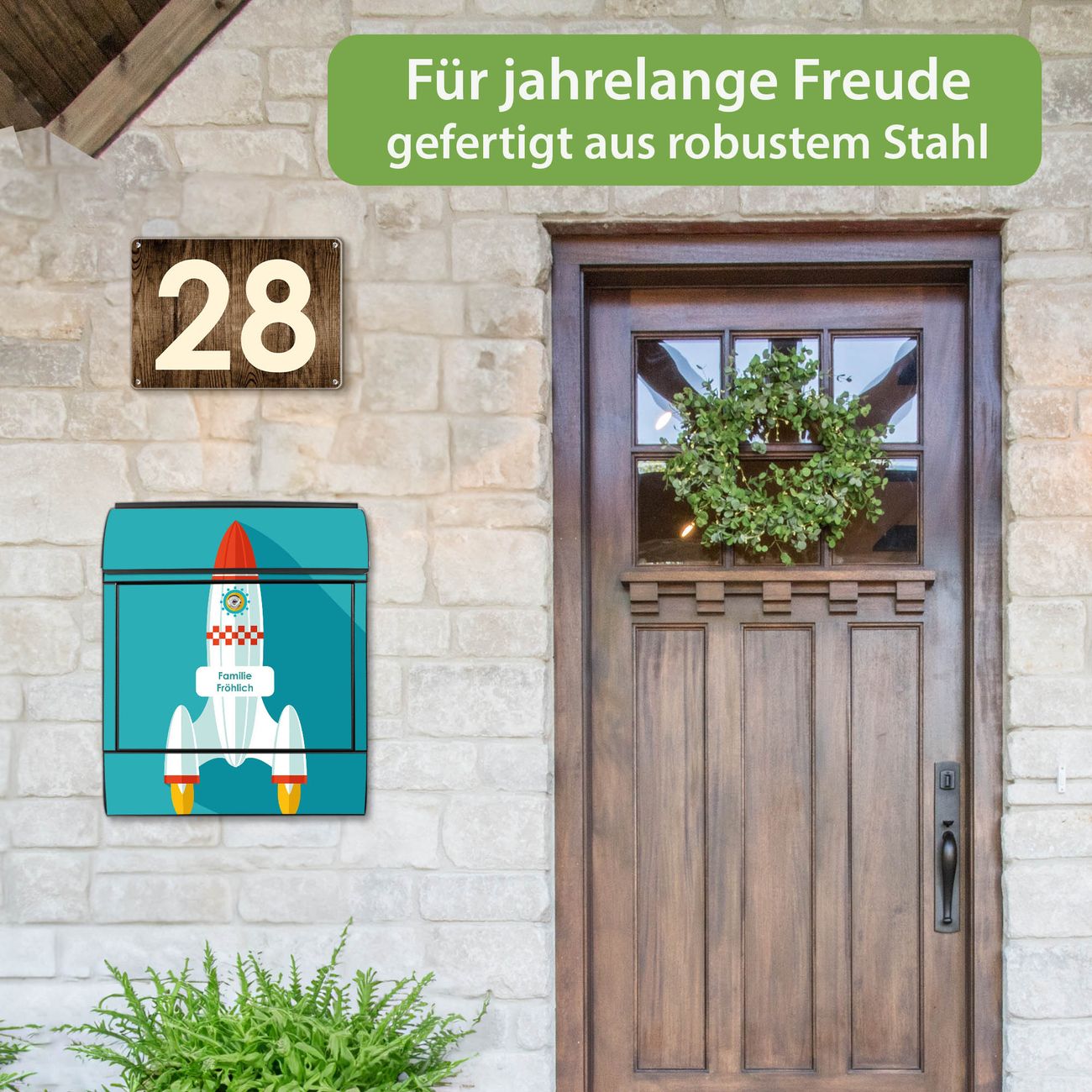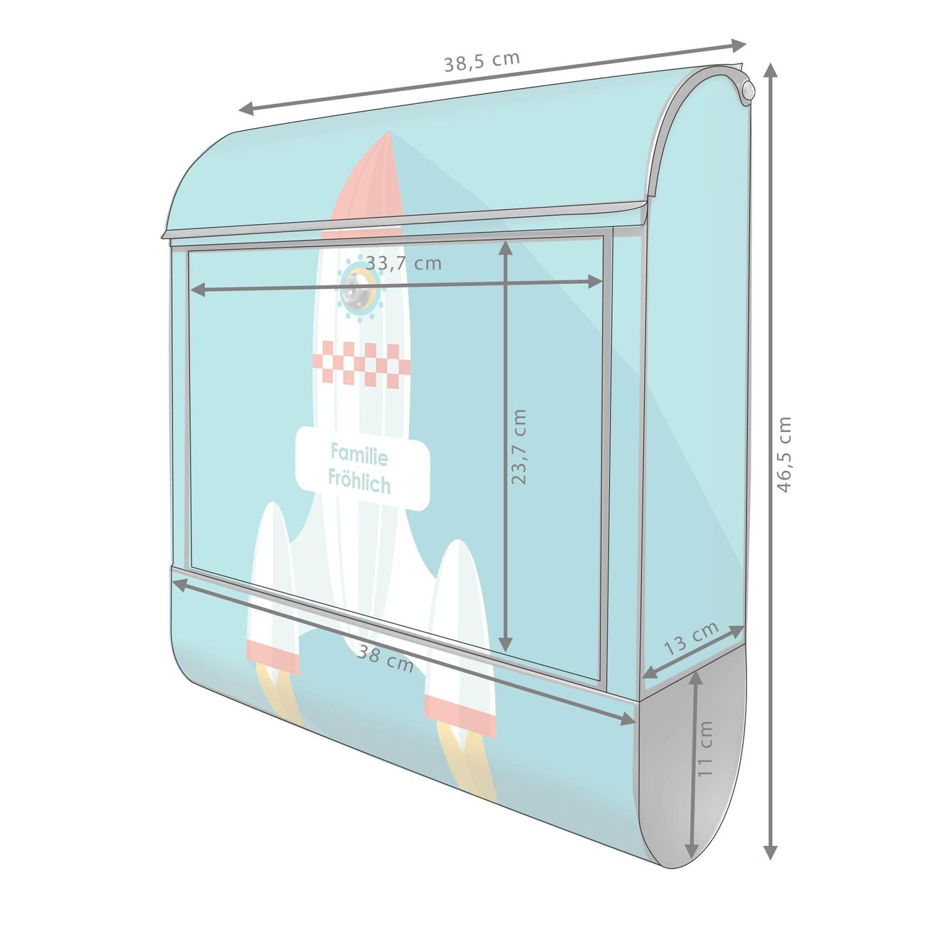 DESIGN: Der Postkasten mit Motiv Motiv Rakete hat ein sehr ansprechendes und ausgefallenes Design, damit entlocken Sie Ihren Nachbarn und dem Postboten ein Lächeln. Heben Sie Sich von der tristen grauen Masse ab, ohne auf Funktionalität zu verzichten. DETAILS: Der Postkasten besteht aus pulverbeschichtetem Stahl. Er ist 38x46x12,5cm groß. Das Motiv besteht aus einer wetter- und UV-resistenten Folie, die mit einem Schutzlaminat überzogen ist, sodass der Briefkasten zusätzlich vor Kratzern geschützt ist. Der Briefkasten wird mit Montagematerial, zusätzlich zwei Schlüssel sowie einer Bohrschablone geliefert. NUTZEN: Sie können diesen Briefkasten sowohl als Wandbriefkasten montieren oder einen passenden Ständer kaufen und als Standbriefkasten einbetonieren. Die Größe bietet genügend Platz für Sendungen aller Art, der Einwurf fasst auch größere A4 Sendungen. BANJADO: Ihr Briefkasten wird in Sachsen in einer kleinen Manufaktur von Hand veredelt. Die Motivfolie ist lösungsmittelfrei und schutzlaminiert für einen langen Halt. Wir legen großen Wert auf die Verbindung von Funktionalität und Design. Sie erhalten Handarbeit aus Sachsen.