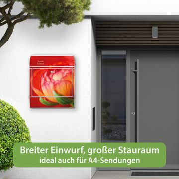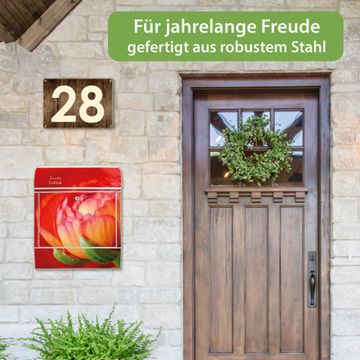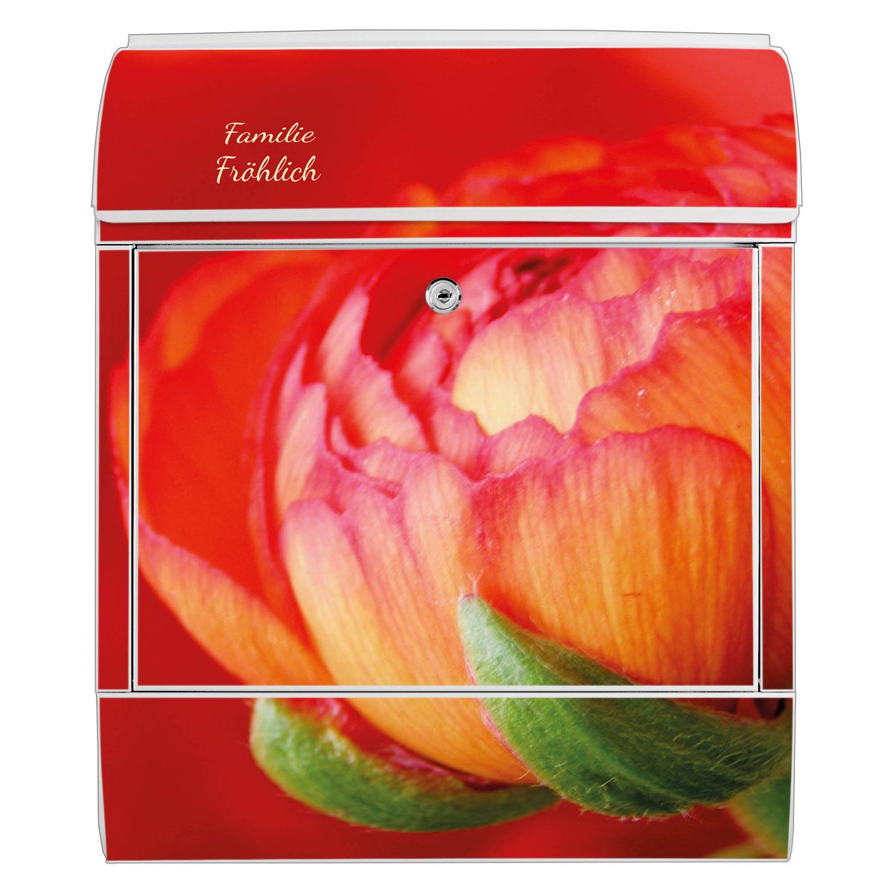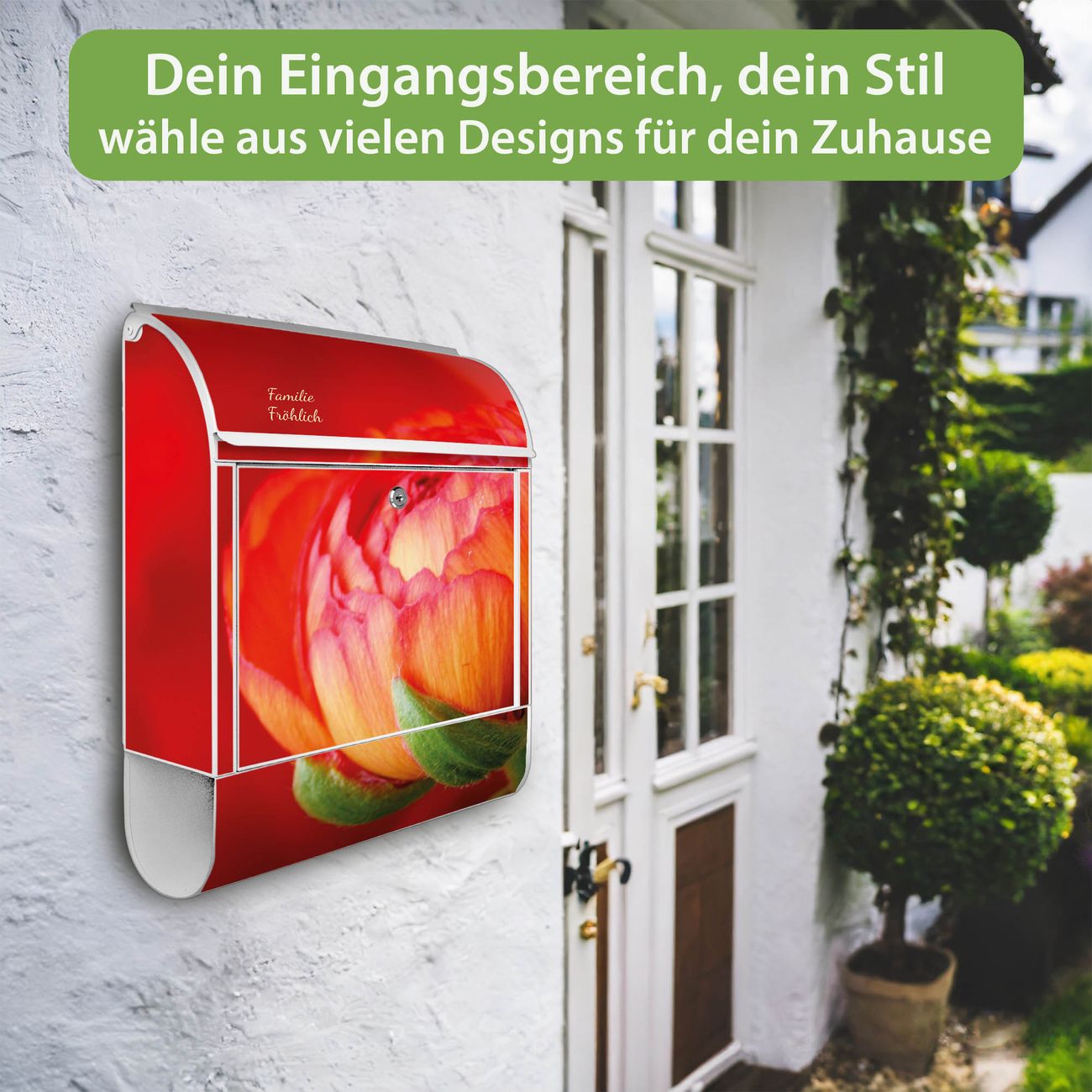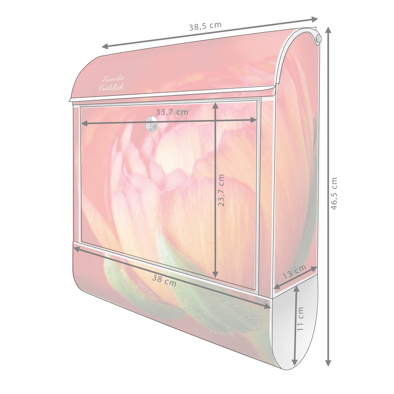 DESIGN: Der Postkasten mit Motiv Motiv Ranunkel hat ein sehr ansprechendes und ausgefallenes Design, damit entlocken Sie Ihren Nachbarn und dem Postboten ein Lächeln. Heben Sie Sich von der tristen grauen Masse ab, ohne auf Funktionalität zu verzichten. DETAILS: Der Postkasten besteht aus pulverbeschichtetem Stahl. Er ist 38x46x12,5cm groß. Das Motiv besteht aus einer wetter- und UV-resistenten Folie, die mit einem Schutzlaminat überzogen ist, sodass der Briefkasten zusätzlich vor Kratzern geschützt ist. Der Briefkasten wird mit Montagematerial, zusätzlich zwei Schlüssel sowie einer Bohrschablone geliefert. NUTZEN: Sie können diesen Briefkasten sowohl als Wandbriefkasten montieren oder einen passenden Ständer kaufen und als Standbriefkasten einbetonieren. Die Größe bietet genügend Platz für Sendungen aller Art, der Einwurf fasst auch größere A4 Sendungen. BANJADO: Ihr Briefkasten wird in Sachsen in einer kleinen Manufaktur von Hand veredelt. Die Motivfolie ist lösungsmittelfrei und schutzlaminiert für einen langen Halt. Wir legen großen Wert auf die Verbindung von Funktionalität und Design. Sie erhalten Handarbeit aus Sachsen.