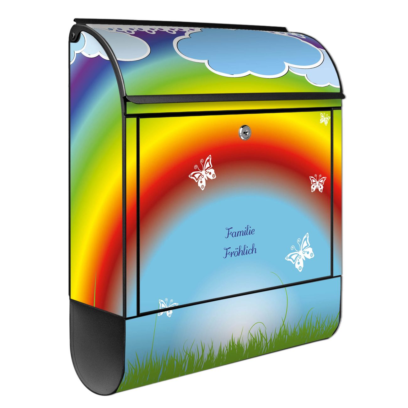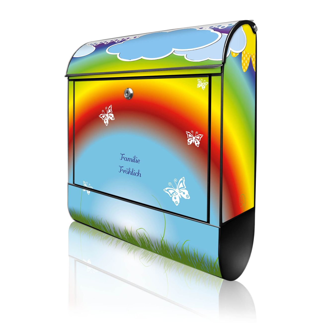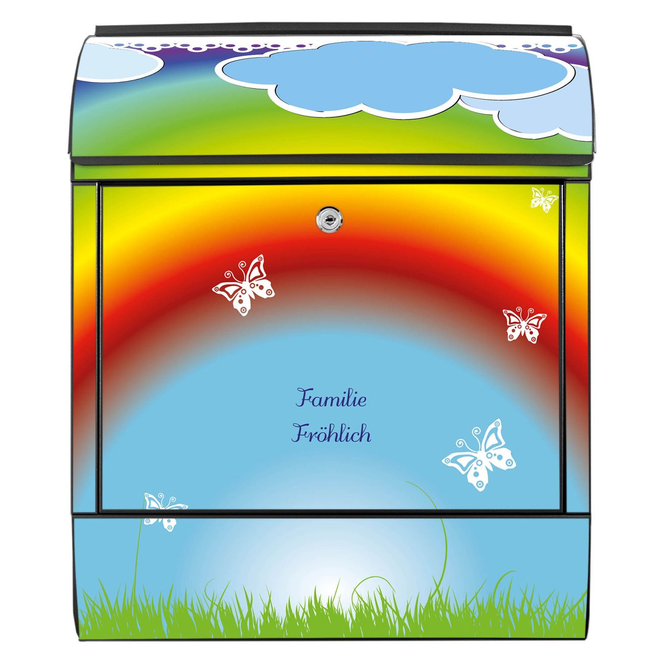 DESIGN: Der Postkasten mit Motiv Motiv Regenbogen hat ein sehr ansprechendes und ausgefallenes Design, damit entlocken Sie Ihren Nachbarn und dem Postboten ein Lächeln. Heben Sie Sich von der tristen grauen Masse ab, ohne auf Funktionalität zu verzichten. DETAILS: Der Postkasten besteht aus pulverbeschichtetem Stahl. Er ist 38x46x12,5cm groß. Das Motiv besteht aus einer wetter- und UV-resistenten Folie, die mit einem Schutzlaminat überzogen ist, sodass der Briefkasten zusätzlich vor Kratzern geschützt ist. Der Briefkasten wird mit Montagematerial, zusätzlich zwei Schlüssel sowie einer Bohrschablone geliefert. NUTZEN: Sie können diesen Briefkasten sowohl als Wandbriefkasten montieren oder einen passenden Ständer kaufen und als Standbriefkasten einbetonieren. Die Größe bietet genügend Platz für Sendungen aller Art, der Einwurf fasst auch größere A4 Sendungen. BANJADO: Ihr Briefkasten wird in Sachsen in einer kleinen Manufaktur von Hand veredelt. Die Motivfolie ist lösungsmittelfrei und schutzlaminiert für einen langen Halt. Wir legen großen Wert auf die Verbindung von Funktionalität und Design. Sie erhalten Handarbeit aus Sachsen.