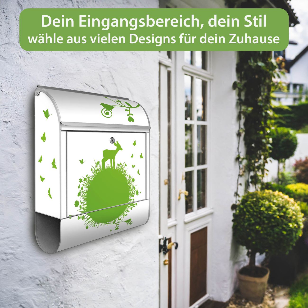 DESIGN: Der Postkasten mit Motiv Motiv Rehkitz hat ein sehr ansprechendes und ausgefallenes Design, damit entlocken Sie Ihren Nachbarn und dem Postboten ein Lächeln. Heben Sie Sich von der tristen grauen Masse ab, ohne auf Funktionalität zu verzichten. DETAILS: Der Postkasten besteht aus pulverbeschichtetem Stahl. Er ist 38x46x12,5cm groß. Das Motiv besteht aus einer wetter- und UV-resistenten Folie, die mit einem Schutzlaminat überzogen ist, sodass der Briefkasten zusätzlich vor Kratzern geschützt ist. Der Briefkasten wird mit Montagematerial, zusätzlich zwei Schlüssel sowie einer Bohrschablone geliefert. NUTZEN: Sie können diesen Briefkasten sowohl als Wandbriefkasten montieren oder einen passenden Ständer kaufen und als Standbriefkasten einbetonieren. Die Größe bietet genügend Platz für Sendungen aller Art, der Einwurf fasst auch größere A4 Sendungen. BANJADO: Ihr Briefkasten wird in Sachsen in einer kleinen Manufaktur von Hand veredelt. Die Motivfolie ist lösungsmittelfrei und schutzlaminiert für einen langen Halt. Wir legen großen Wert auf die Verbindung von Funktionalität und Design. Sie erhalten Handarbeit aus Sachsen.