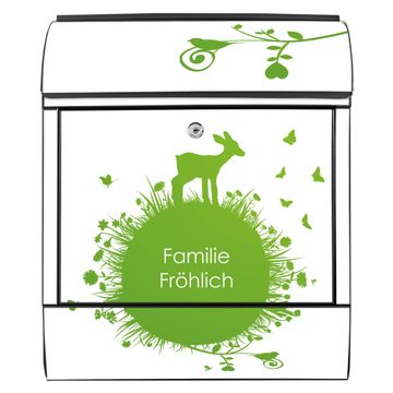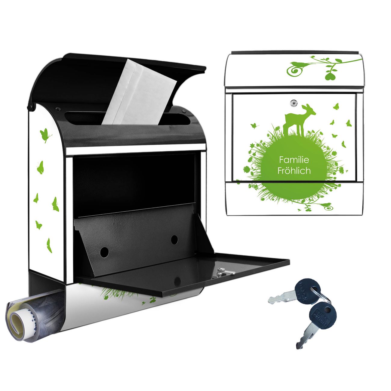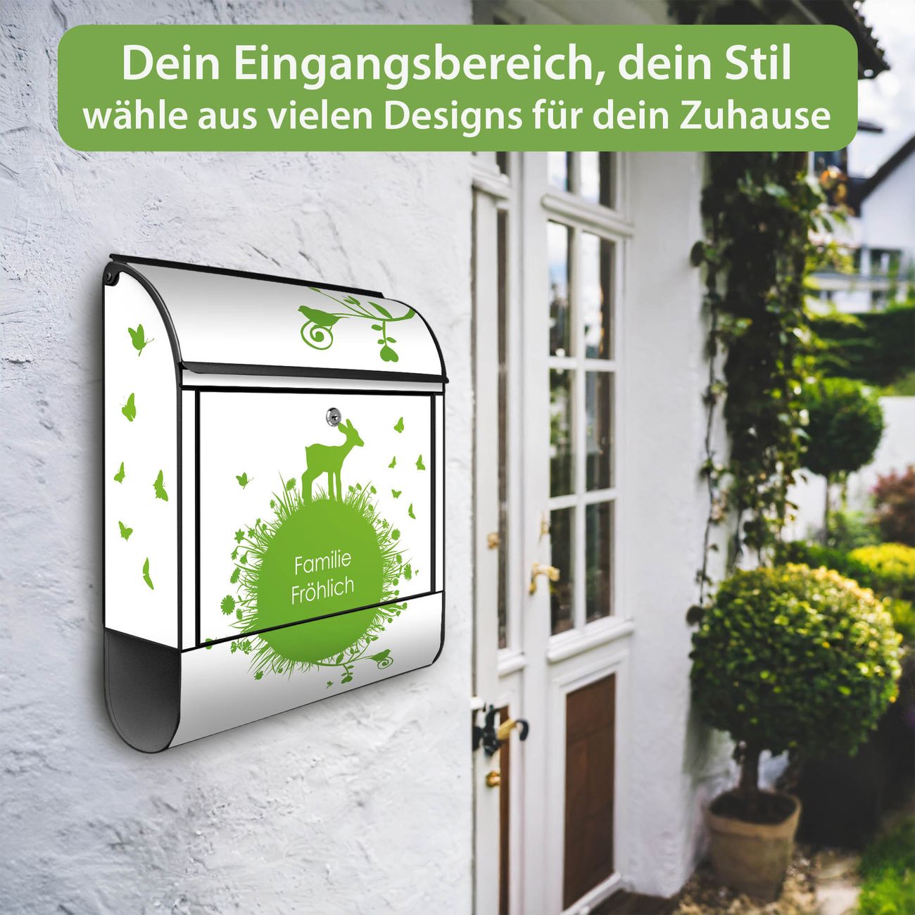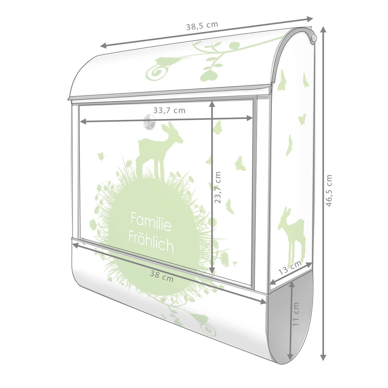DESIGN: Der Postkasten mit Motiv Motiv Rehkitz hat ein sehr ansprechendes und ausgefallenes Design, damit entlocken Sie Ihren Nachbarn und dem Postboten ein Lächeln. Heben Sie Sich von der tristen grauen Masse ab, ohne auf Funktionalität zu verzichten. DETAILS: Der Postkasten besteht aus pulverbeschichtetem Stahl. Er ist 38x46x12,5cm groß. Das Motiv besteht aus einer wetter- und UV-resistenten Folie, die mit einem Schutzlaminat überzogen ist, sodass der Briefkasten zusätzlich vor Kratzern geschützt ist. Der Briefkasten wird mit Montagematerial, zusätzlich zwei Schlüssel sowie einer Bohrschablone geliefert. NUTZEN: Sie können diesen Briefkasten sowohl als Wandbriefkasten montieren oder einen passenden Ständer kaufen und als Standbriefkasten einbetonieren. Die Größe bietet genügend Platz für Sendungen aller Art, der Einwurf fasst auch größere A4 Sendungen. BANJADO: Ihr Briefkasten wird in Sachsen in einer kleinen Manufaktur von Hand veredelt. Die Motivfolie ist lösungsmittelfrei und schutzlaminiert für einen langen Halt. Wir legen großen Wert auf die Verbindung von Funktionalität und Design. Sie erhalten Handarbeit aus Sachsen.