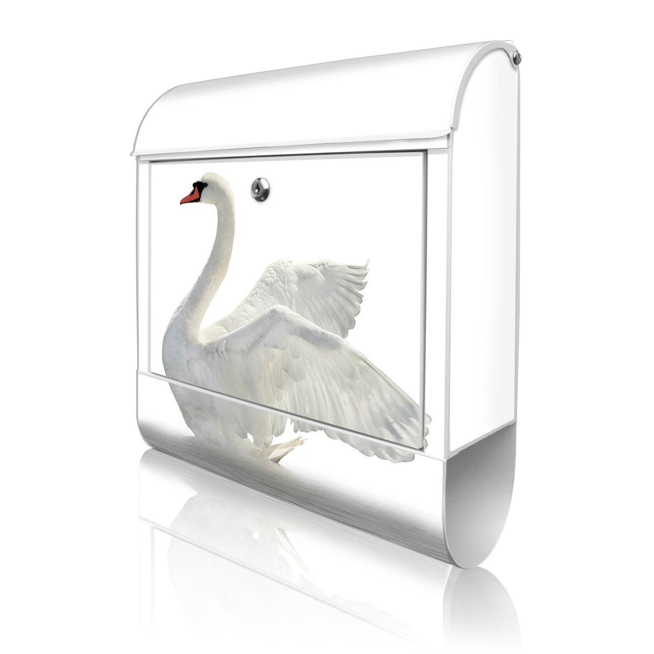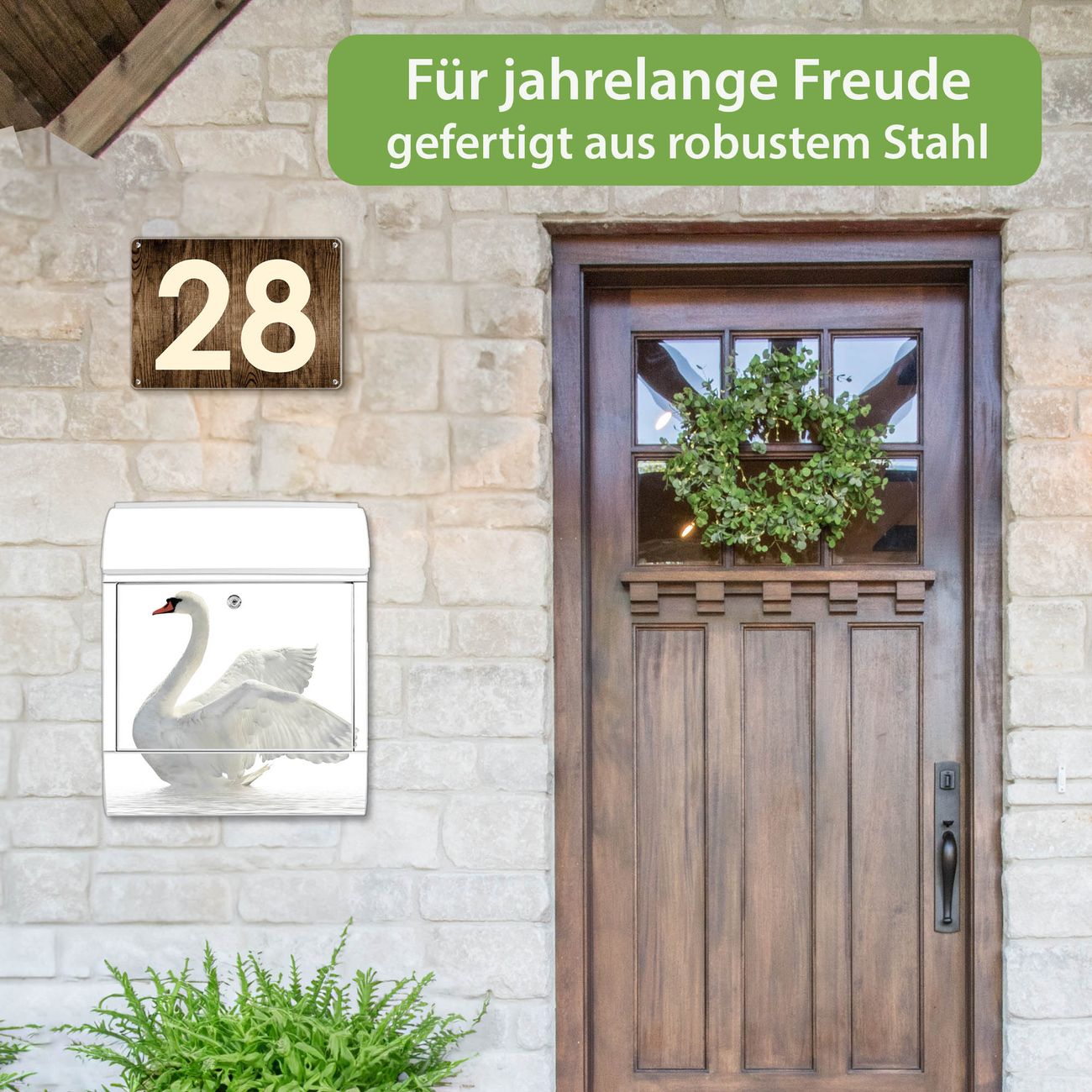 DESIGN: Der Postkasten mit Motiv Motiv Schwan hat ein sehr ansprechendes und ausgefallenes Design, damit entlocken Sie Ihren Nachbarn und dem Postboten ein Lächeln. Heben Sie Sich von der tristen grauen Masse ab, ohne auf Funktionalität zu verzichten. DETAILS: Der Postkasten besteht aus pulverbeschichtetem Stahl. Er ist 38x46x12,5cm groß. Das Motiv besteht aus einer wetter- und UV-resistenten Folie, die mit einem Schutzlaminat überzogen ist, sodass der Briefkasten zusätzlich vor Kratzern geschützt ist. Der Briefkasten wird mit Montagematerial, zusätzlich zwei Schlüssel sowie einer Bohrschablone geliefert. NUTZEN: Sie können diesen Briefkasten sowohl als Wandbriefkasten montieren oder einen passenden Ständer kaufen und als Standbriefkasten einbetonieren. Die Größe bietet genügend Platz für Sendungen aller Art, der Einwurf fasst auch größere A4 Sendungen. BANJADO: Ihr Briefkasten wird in Sachsen in einer kleinen Manufaktur von Hand veredelt. Die Motivfolie ist lösungsmittelfrei und schutzlaminiert für einen langen Halt. Wir legen großen Wert auf die Verbindung von Funktionalität und Design. Sie erhalten Handarbeit aus Sachsen.