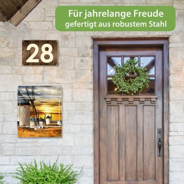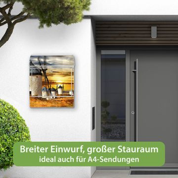 DESIGN: Der Postkasten mit Motiv Motiv Spanische Windmühlen hat ein sehr ansprechendes und ausgefallenes Design, damit entlocken Sie Ihren Nachbarn und dem Postboten ein Lächeln. Heben Sie Sich von der tristen grauen Masse ab, ohne auf Funktionalität zu verzichten. DETAILS: Der Postkasten besteht aus pulverbeschichtetem Stahl. Er ist 38x46x12,5cm groß. Das Motiv besteht aus einer wetter- und UV-resistenten Folie, die mit einem Schutzlaminat überzogen ist, sodass der Briefkasten zusätzlich vor Kratzern geschützt ist. Der Briefkasten wird mit Montagematerial, zusätzlich zwei Schlüssel sowie einer Bohrschablone geliefert. NUTZEN: Sie können diesen Briefkasten sowohl als Wandbriefkasten montieren oder einen passenden Ständer kaufen und als Standbriefkasten einbetonieren. Die Größe bietet genügend Platz für Sendungen aller Art, der Einwurf fasst auch größere A4 Sendungen. BANJADO: Ihr Briefkasten wird in Sachsen in einer kleinen Manufaktur von Hand veredelt. Die Motivfolie ist lösungsmittelfrei und schutzlaminiert für einen langen Halt. Wir legen großen Wert auf die Verbindung von Funktionalität und Design. Sie erhalten Handarbeit aus Sachsen.