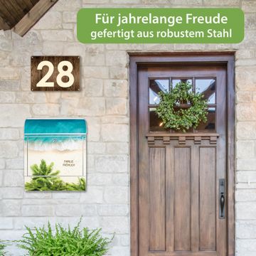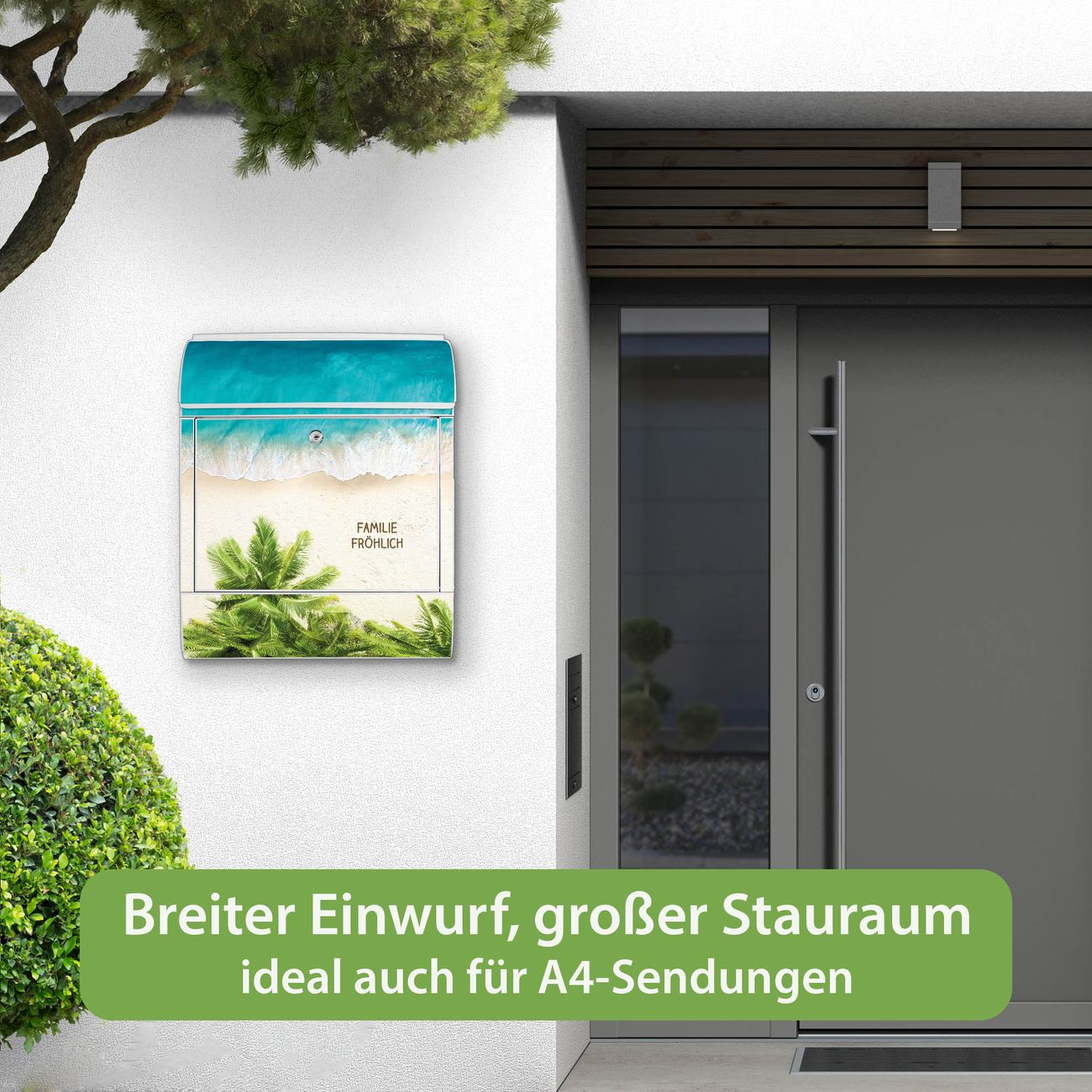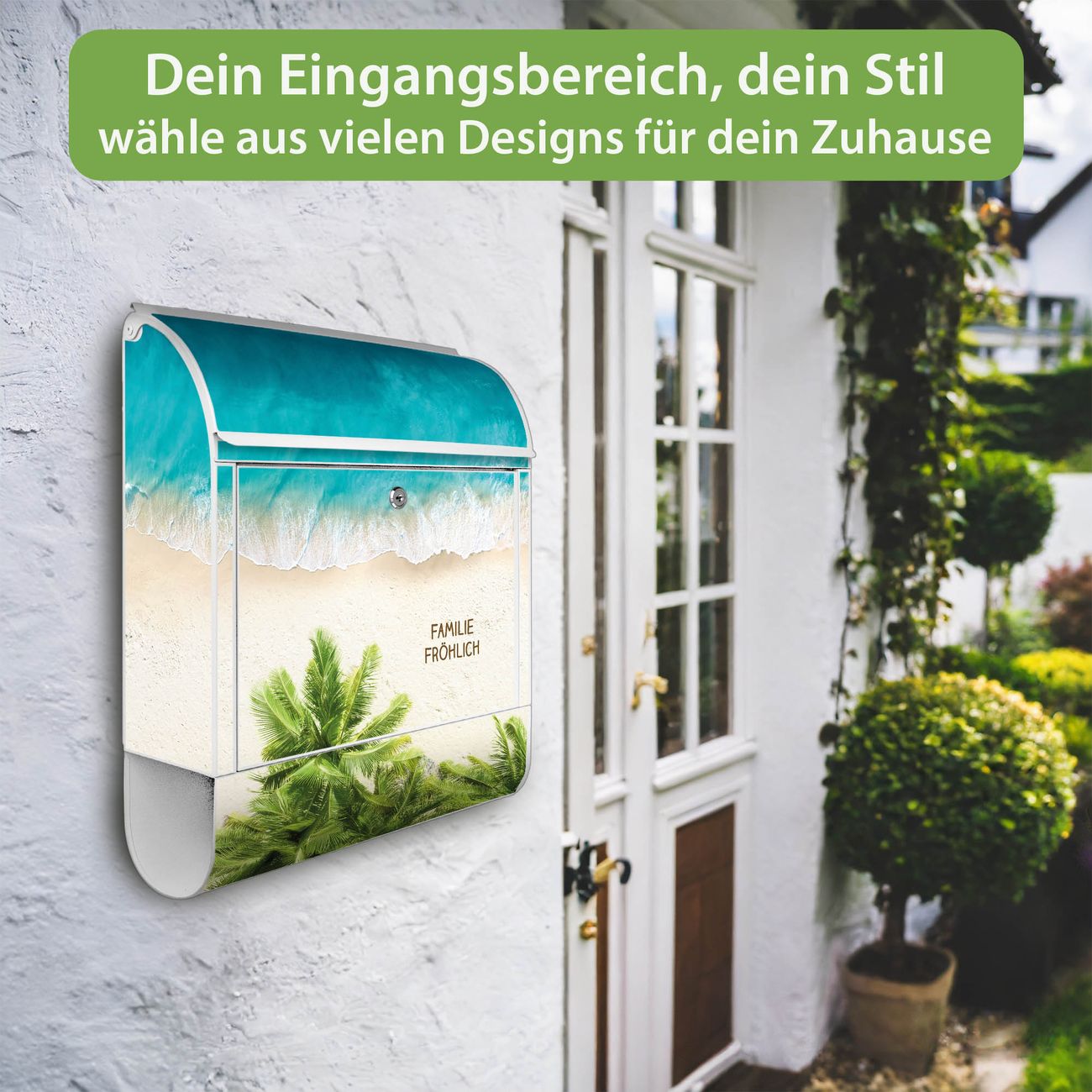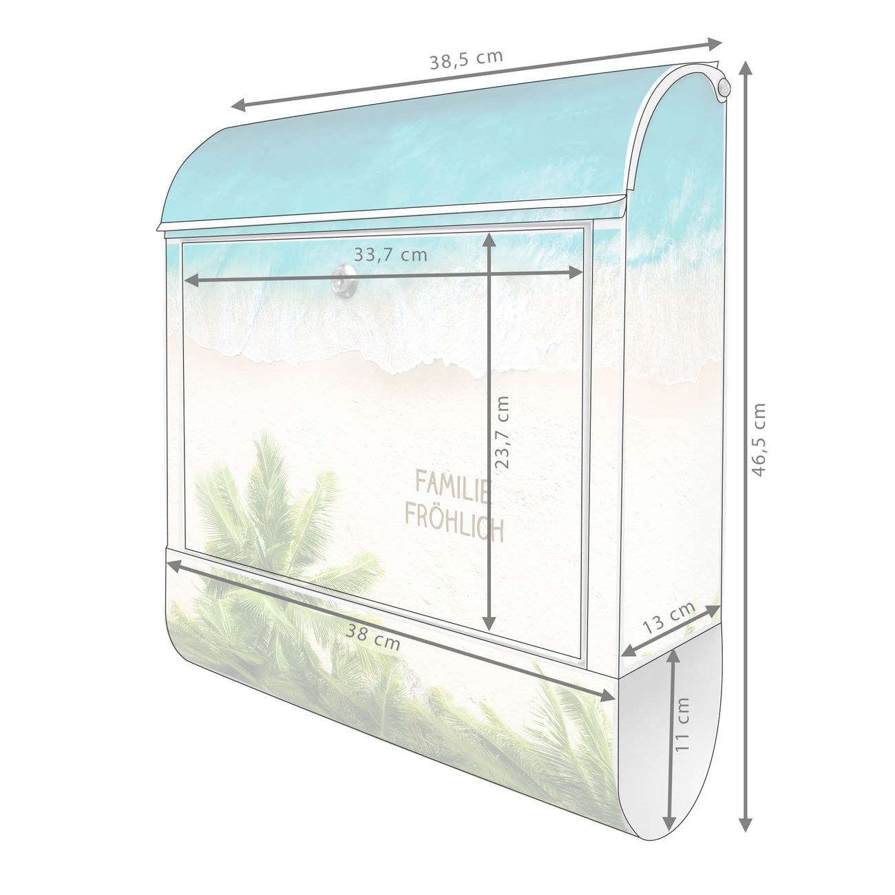 DESIGN: Der Postkasten mit Motiv Motiv Strandtag hat ein sehr ansprechendes und ausgefallenes Design, damit entlocken Sie Ihren Nachbarn und dem Postboten ein Lächeln. Heben Sie Sich von der tristen grauen Masse ab, ohne auf Funktionalität zu verzichten. DETAILS: Der Postkasten besteht aus pulverbeschichtetem Stahl. Er ist 38x46x12,5cm groß. Das Motiv besteht aus einer wetter- und UV-resistenten Folie, die mit einem Schutzlaminat überzogen ist, sodass der Briefkasten zusätzlich vor Kratzern geschützt ist. Der Briefkasten wird mit Montagematerial, zusätzlich zwei Schlüssel sowie einer Bohrschablone geliefert. NUTZEN: Sie können diesen Briefkasten sowohl als Wandbriefkasten montieren oder einen passenden Ständer kaufen und als Standbriefkasten einbetonieren. Die Größe bietet genügend Platz für Sendungen aller Art, der Einwurf fasst auch größere A4 Sendungen. BANJADO: Ihr Briefkasten wird in Sachsen in einer kleinen Manufaktur von Hand veredelt. Die Motivfolie ist lösungsmittelfrei und schutzlaminiert für einen langen Halt. Wir legen großen Wert auf die Verbindung von Funktionalität und Design. Sie erhalten Handarbeit aus Sachsen.