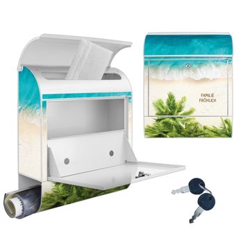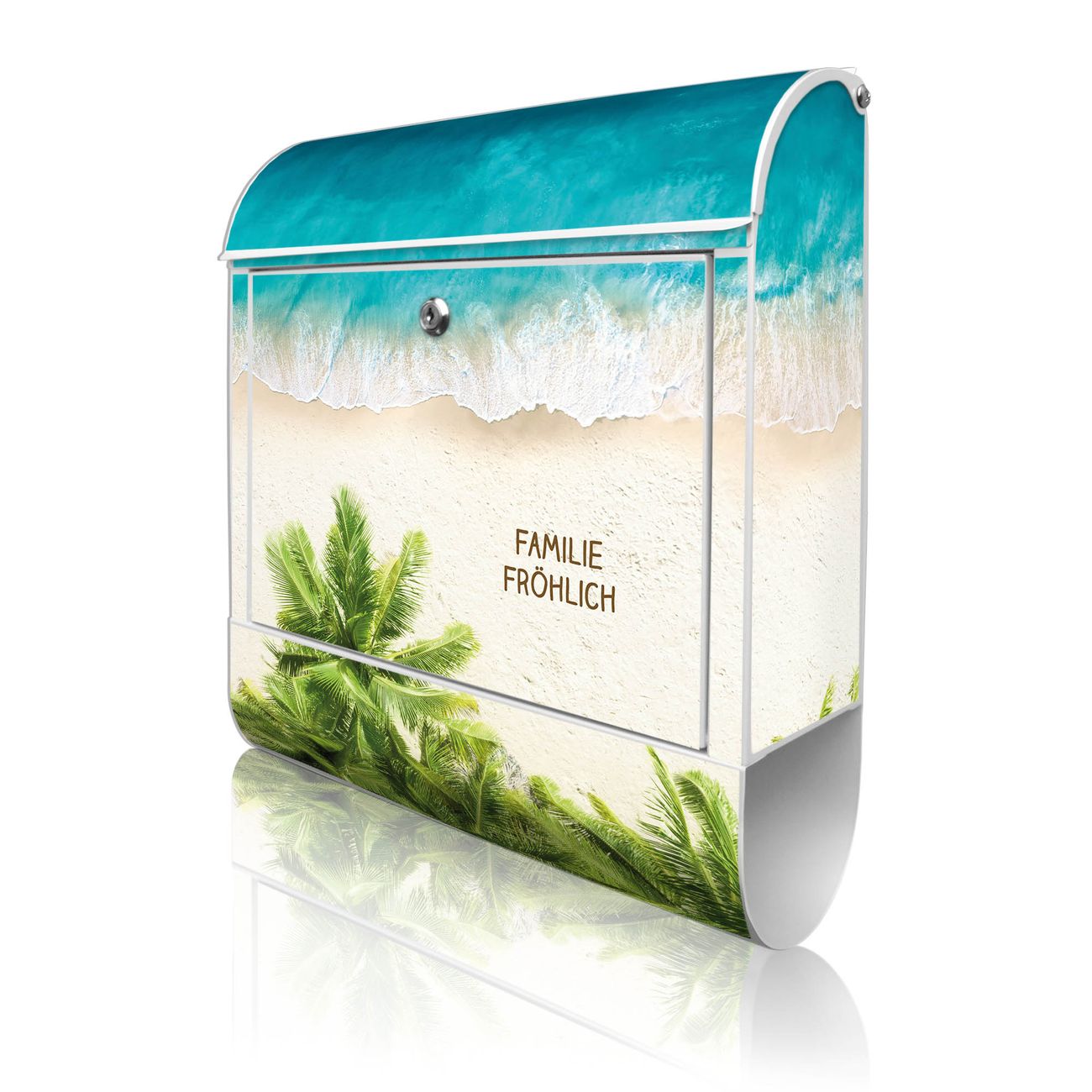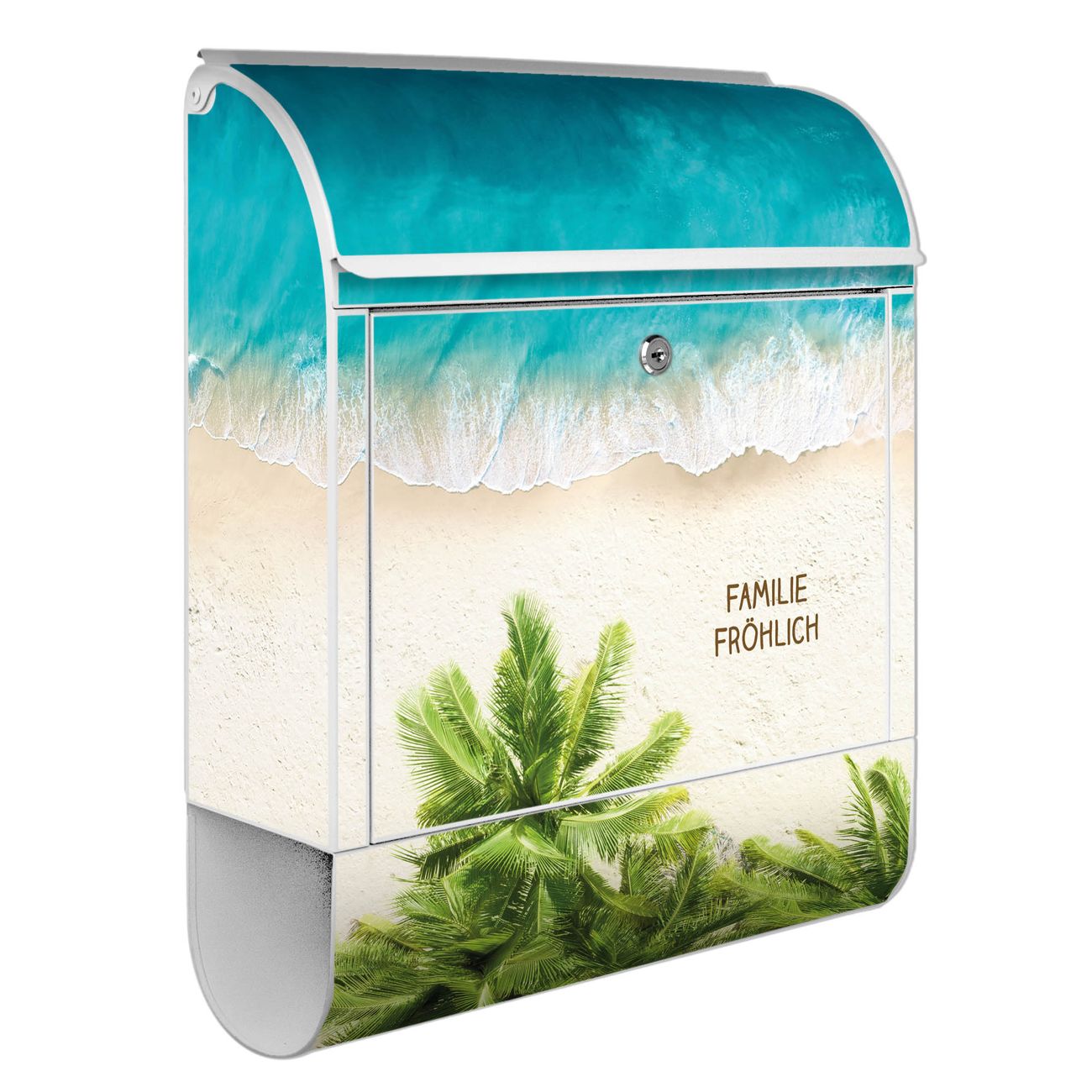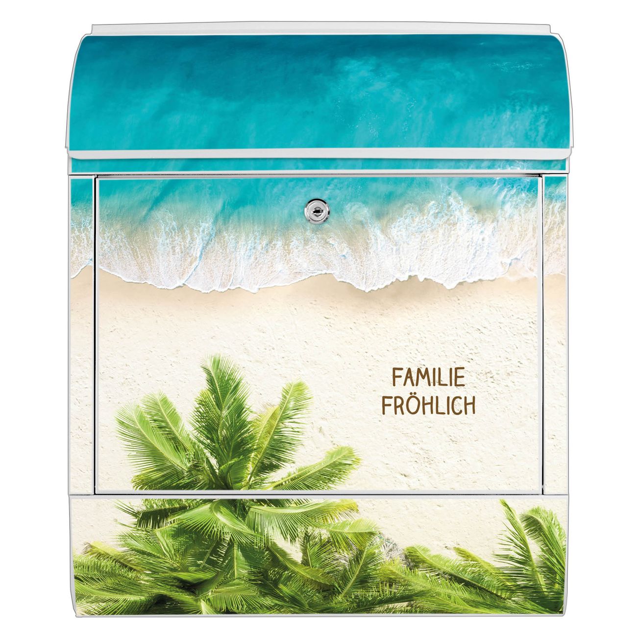 DESIGN: Der Postkasten mit Motiv Motiv Strandtag hat ein sehr ansprechendes und ausgefallenes Design, damit entlocken Sie Ihren Nachbarn und dem Postboten ein Lächeln. Heben Sie Sich von der tristen grauen Masse ab, ohne auf Funktionalität zu verzichten. DETAILS: Der Postkasten besteht aus pulverbeschichtetem Stahl. Er ist 38x46x12,5cm groß. Das Motiv besteht aus einer wetter- und UV-resistenten Folie, die mit einem Schutzlaminat überzogen ist, sodass der Briefkasten zusätzlich vor Kratzern geschützt ist. Der Briefkasten wird mit Montagematerial, zusätzlich zwei Schlüssel sowie einer Bohrschablone geliefert. NUTZEN: Sie können diesen Briefkasten sowohl als Wandbriefkasten montieren oder einen passenden Ständer kaufen und als Standbriefkasten einbetonieren. Die Größe bietet genügend Platz für Sendungen aller Art, der Einwurf fasst auch größere A4 Sendungen. BANJADO: Ihr Briefkasten wird in Sachsen in einer kleinen Manufaktur von Hand veredelt. Die Motivfolie ist lösungsmittelfrei und schutzlaminiert für einen langen Halt. Wir legen großen Wert auf die Verbindung von Funktionalität und Design. Sie erhalten Handarbeit aus Sachsen.