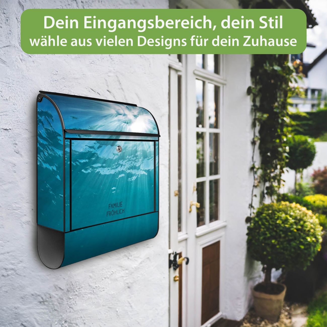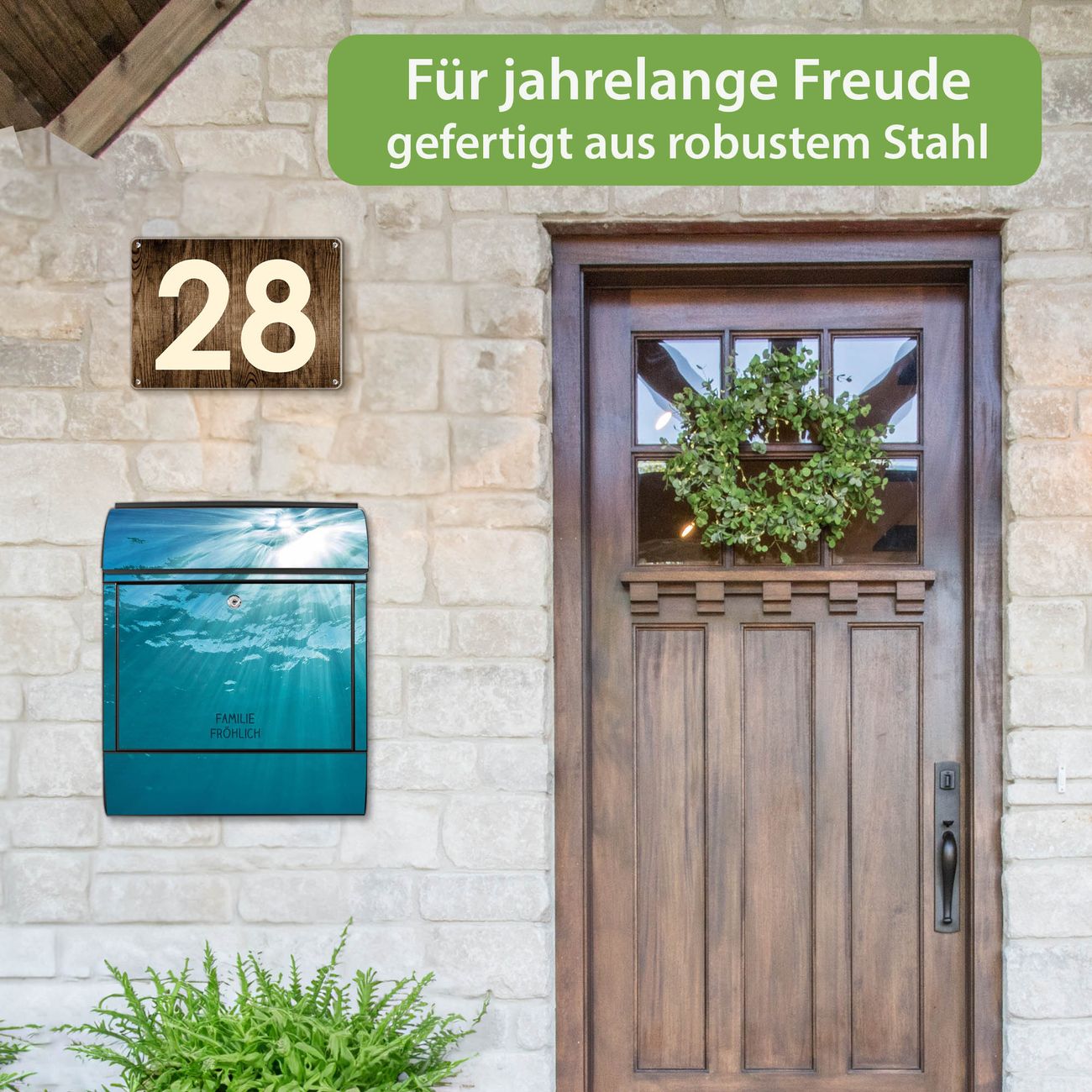 DESIGN: Der Postkasten mit Motiv Motiv Unter der Oberfläche hat ein sehr ansprechendes und ausgefallenes Design, damit entlocken Sie Ihren Nachbarn und dem Postboten ein Lächeln. Heben Sie Sich von der tristen grauen Masse ab, ohne auf Funktionalität zu verzichten. DETAILS: Der Postkasten besteht aus pulverbeschichtetem Stahl. Er ist 38x46x12,5cm groß. Das Motiv besteht aus einer wetter- und UV-resistenten Folie, die mit einem Schutzlaminat überzogen ist, sodass der Briefkasten zusätzlich vor Kratzern geschützt ist. Der Briefkasten wird mit Montagematerial, zusätzlich zwei Schlüssel sowie einer Bohrschablone geliefert. NUTZEN: Sie können diesen Briefkasten sowohl als Wandbriefkasten montieren oder einen passenden Ständer kaufen und als Standbriefkasten einbetonieren. Die Größe bietet genügend Platz für Sendungen aller Art, der Einwurf fasst auch größere A4 Sendungen. BANJADO: Ihr Briefkasten wird in Sachsen in einer kleinen Manufaktur von Hand veredelt. Die Motivfolie ist lösungsmittelfrei und schutzlaminiert für einen langen Halt. Wir legen großen Wert auf die Verbindung von Funktionalität und Design. Sie erhalten Handarbeit aus Sachsen.