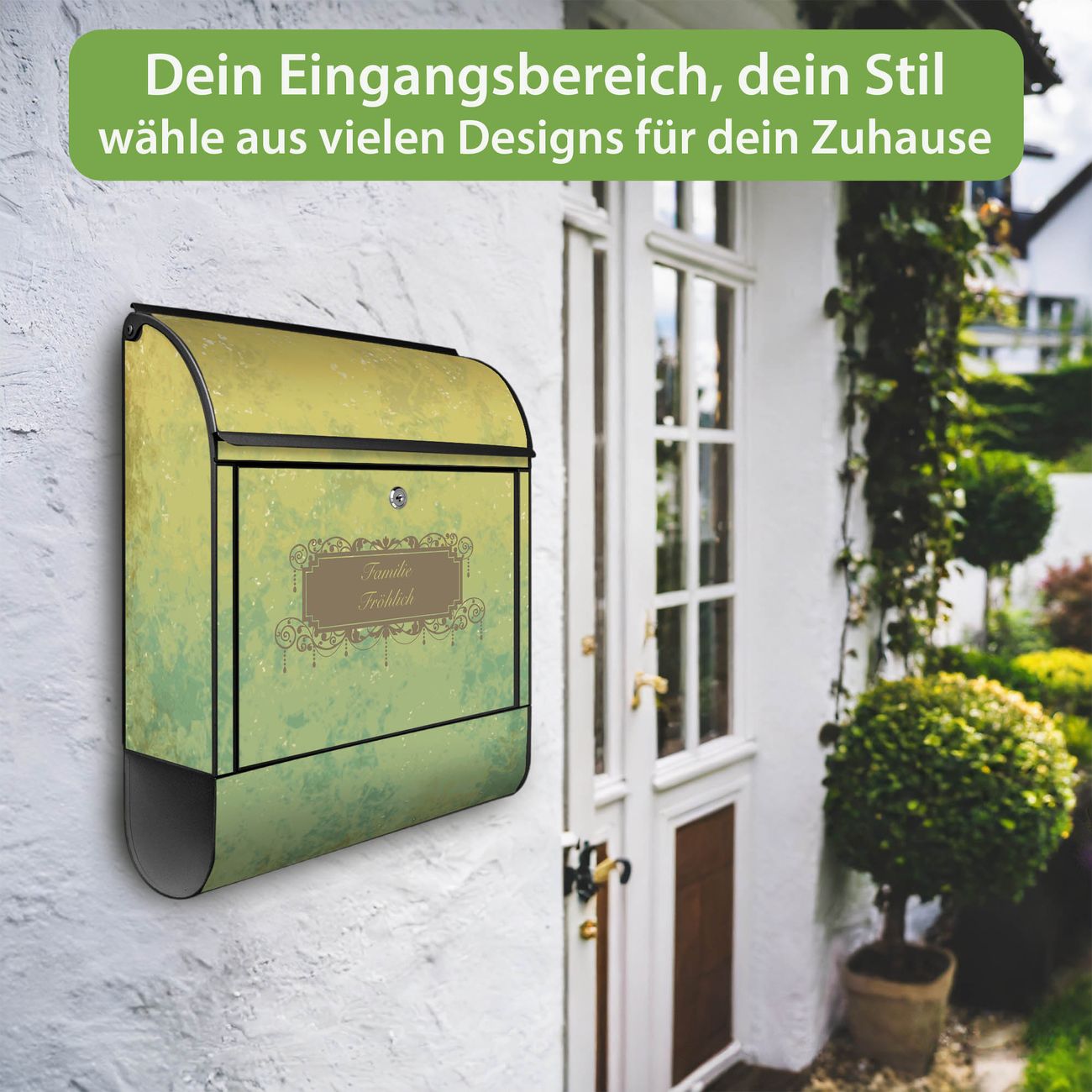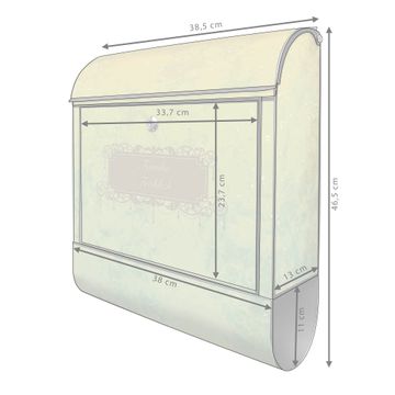 DESIGN: Der Postkasten mit Motiv Motiv Vintage Messing hat ein sehr ansprechendes und ausgefallenes Design, damit entlocken Sie Ihren Nachbarn und dem Postboten ein Lächeln. Heben Sie Sich von der tristen grauen Masse ab, ohne auf Funktionalität zu verzichten. DETAILS: Der Postkasten besteht aus pulverbeschichtetem Stahl. Er ist 38x46x12,5cm groß. Das Motiv besteht aus einer wetter- und UV-resistenten Folie, die mit einem Schutzlaminat überzogen ist, sodass der Briefkasten zusätzlich vor Kratzern geschützt ist. Der Briefkasten wird mit Montagematerial, zusätzlich zwei Schlüssel sowie einer Bohrschablone geliefert. NUTZEN: Sie können diesen Briefkasten sowohl als Wandbriefkasten montieren oder einen passenden Ständer kaufen und als Standbriefkasten einbetonieren. Die Größe bietet genügend Platz für Sendungen aller Art, der Einwurf fasst auch größere A4 Sendungen. BANJADO: Ihr Briefkasten wird in Sachsen in einer kleinen Manufaktur von Hand veredelt. Die Motivfolie ist lösungsmittelfrei und schutzlaminiert für einen langen Halt. Wir legen großen Wert auf die Verbindung von Funktionalität und Design. Sie erhalten Handarbeit aus Sachsen.
