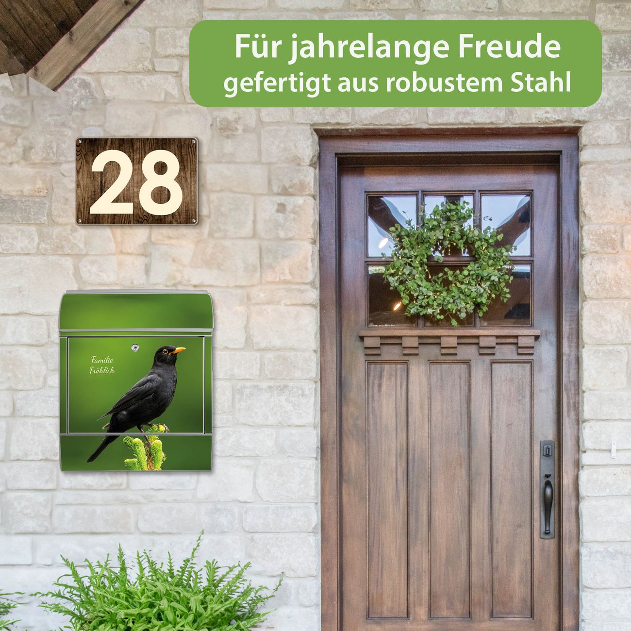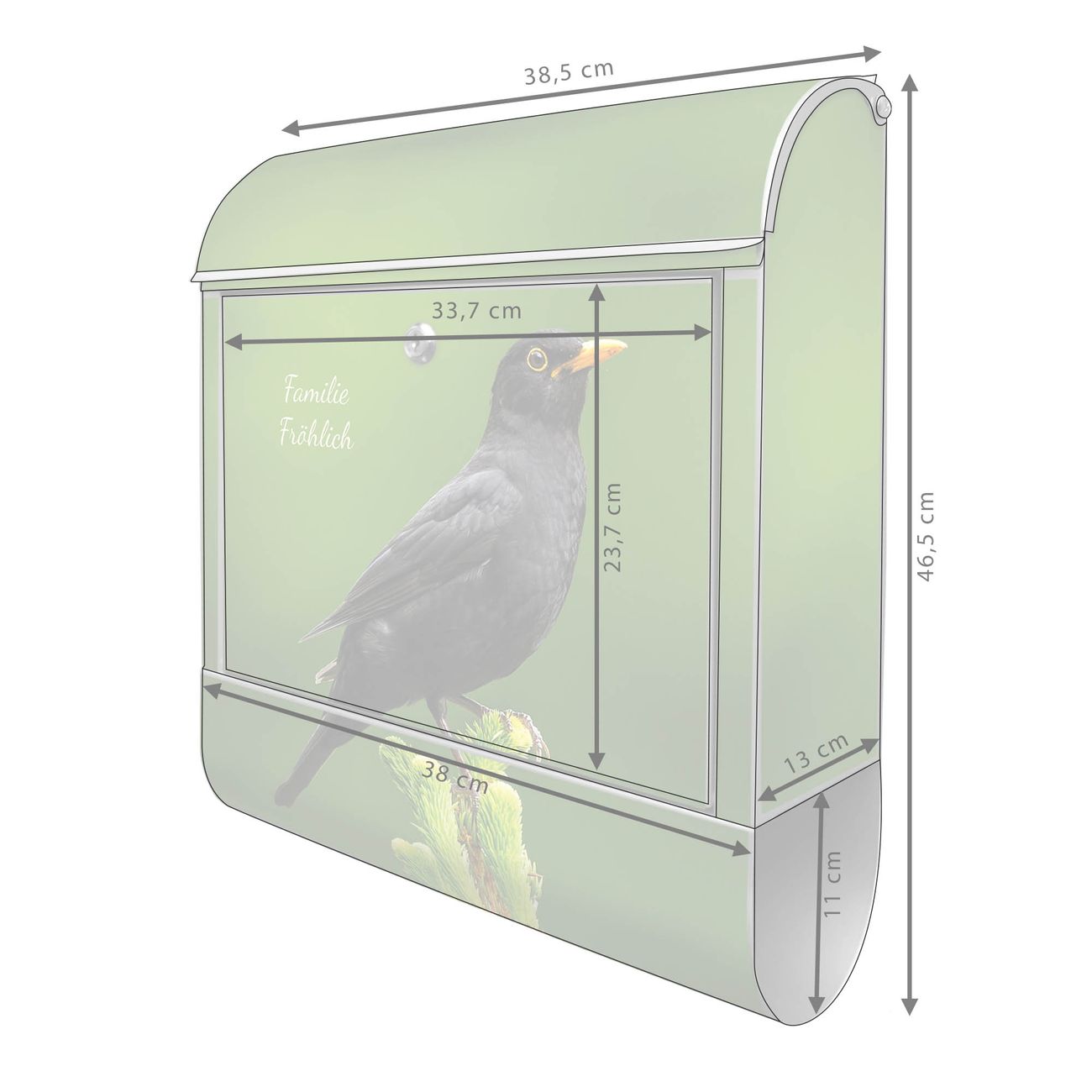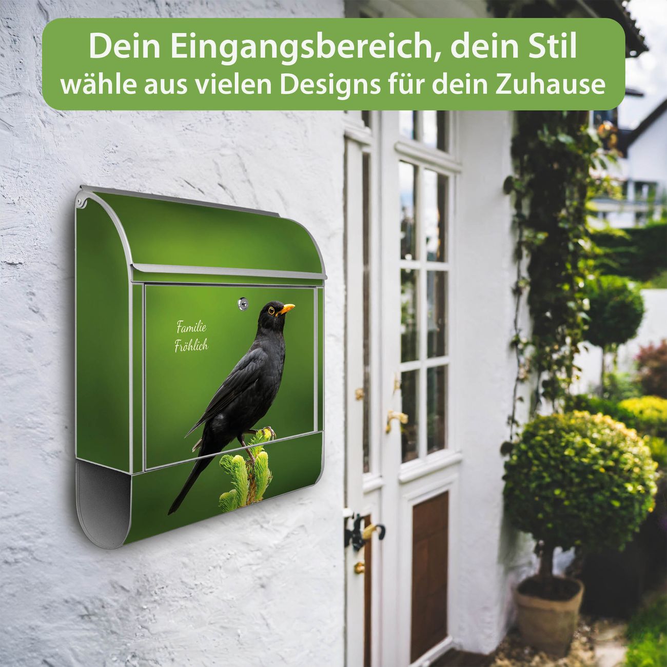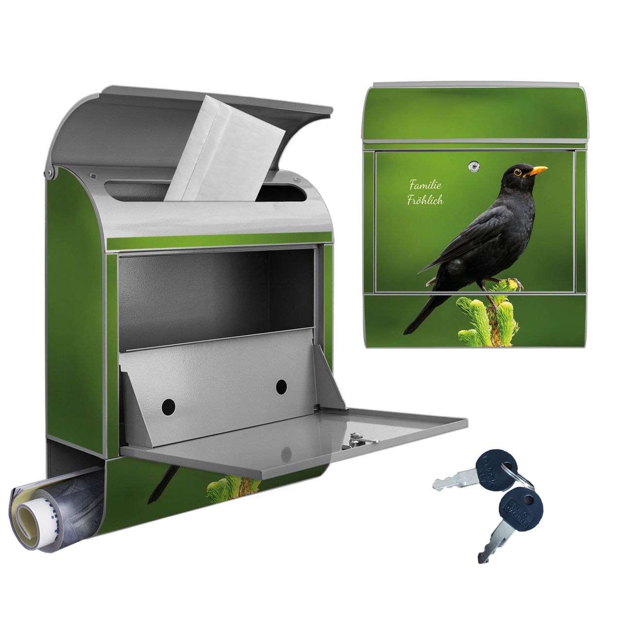 Großer Stahl Briefkasten Motiv Vogel auf Tannenzweig