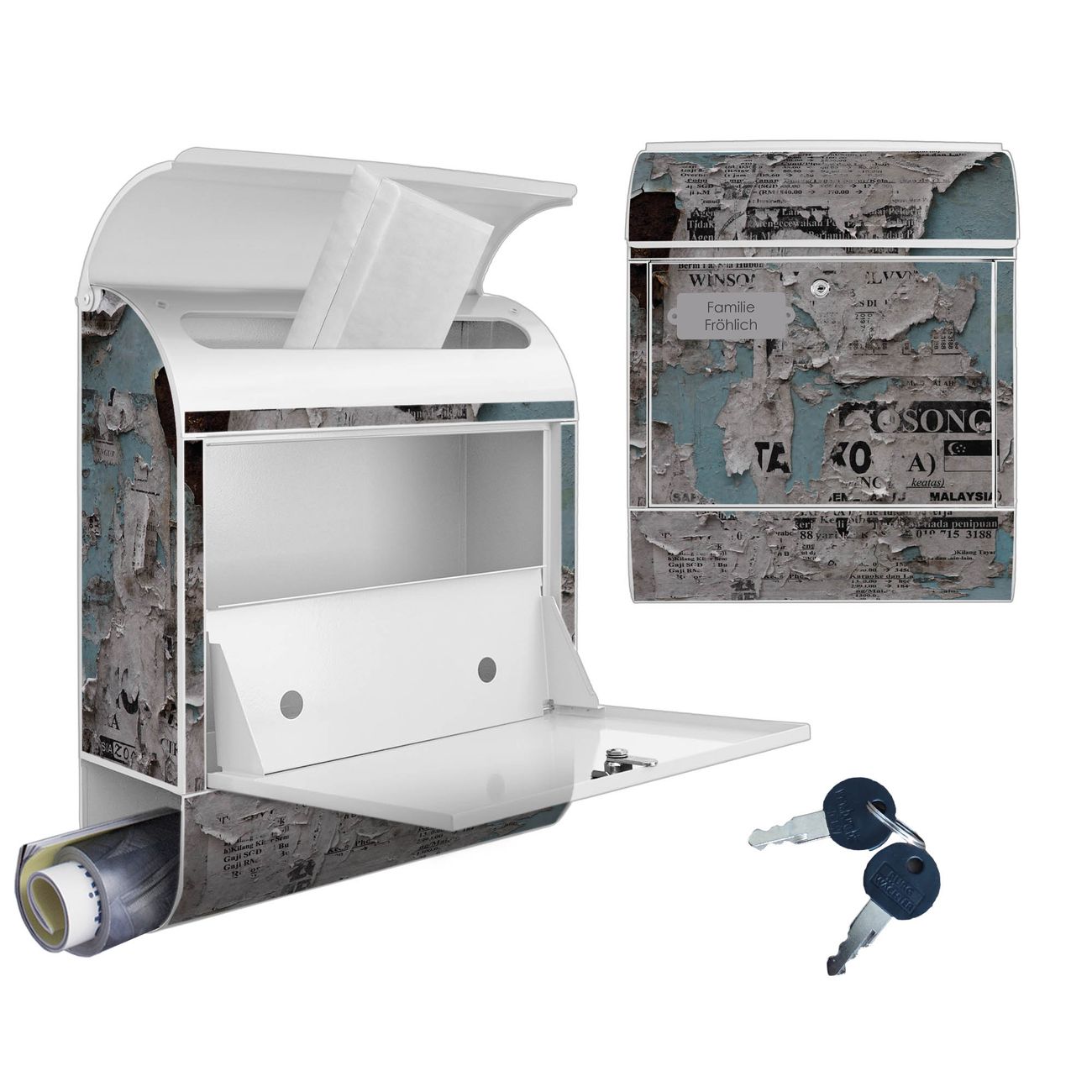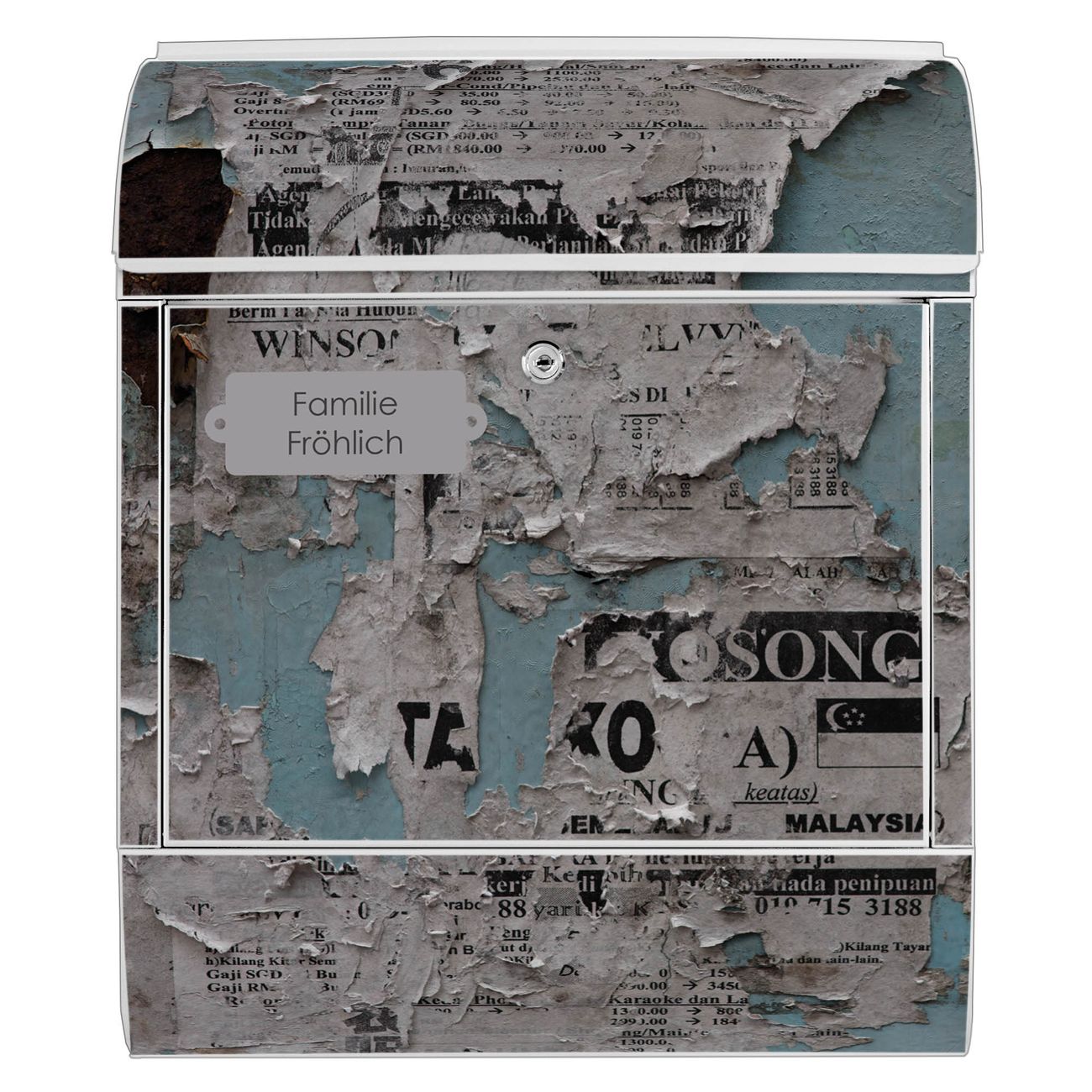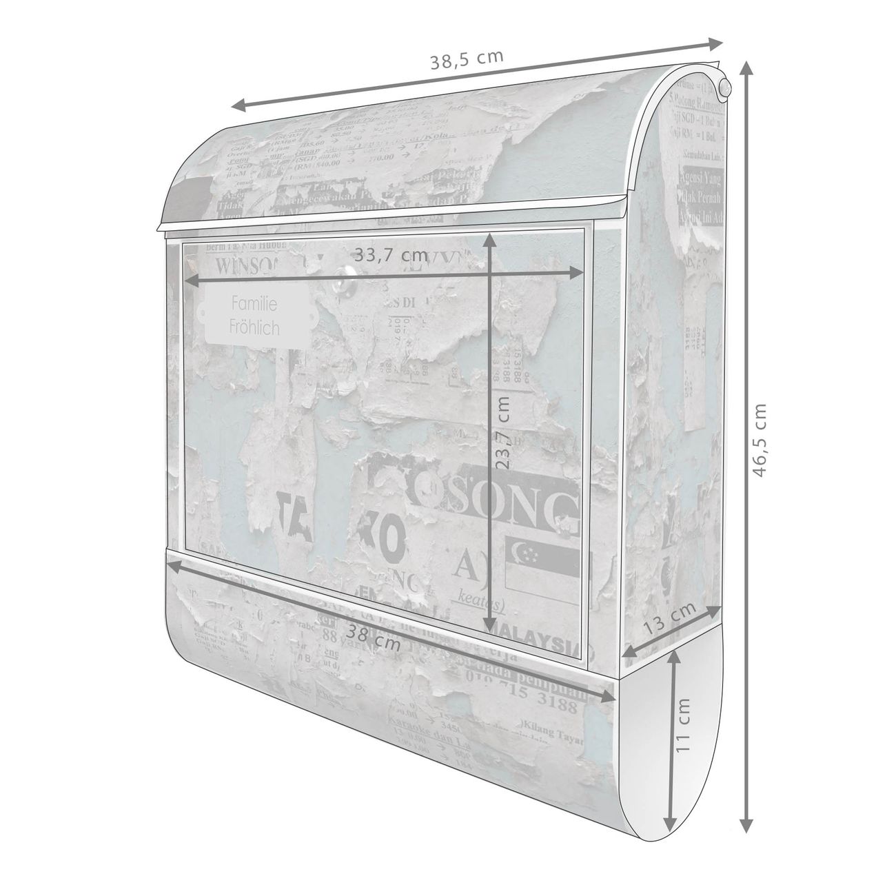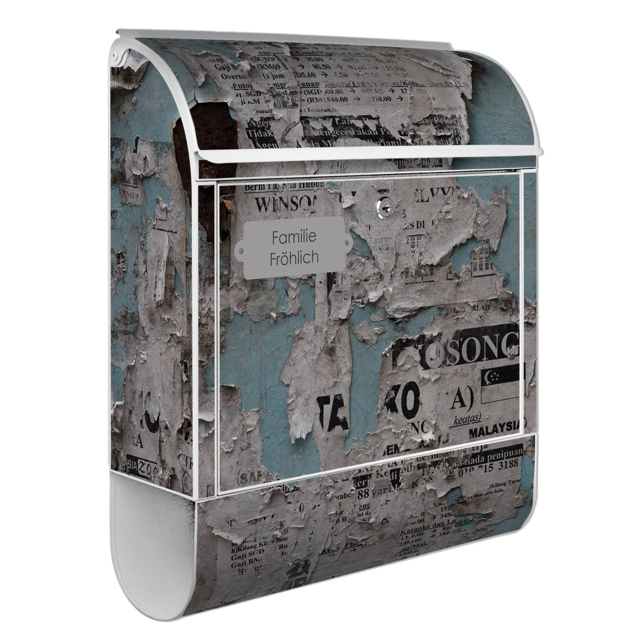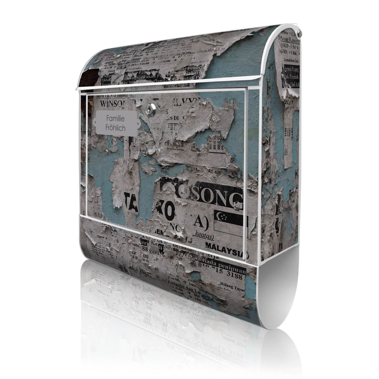 DESIGN: Der Postkasten mit Motiv Motiv Wand mit Zeitungen hat ein sehr ansprechendes und ausgefallenes Design, damit entlocken Sie Ihren Nachbarn und dem Postboten ein Lächeln. Heben Sie Sich von der tristen grauen Masse ab, ohne auf Funktionalität zu verzichten. DETAILS: Der Postkasten besteht aus pulverbeschichtetem Stahl. Er ist 38x46x12,5cm groß. Das Motiv besteht aus einer wetter- und UV-resistenten Folie, die mit einem Schutzlaminat überzogen ist, sodass der Briefkasten zusätzlich vor Kratzern geschützt ist. Der Briefkasten wird mit Montagematerial, zusätzlich zwei Schlüssel sowie einer Bohrschablone geliefert. NUTZEN: Sie können diesen Briefkasten sowohl als Wandbriefkasten montieren oder einen passenden Ständer kaufen und als Standbriefkasten einbetonieren. Die Größe bietet genügend Platz für Sendungen aller Art, der Einwurf fasst auch größere A4 Sendungen. BANJADO: Ihr Briefkasten wird in Sachsen in einer kleinen Manufaktur von Hand veredelt. Die Motivfolie ist lösungsmittelfrei und schutzlaminiert für einen langen Halt. Wir legen großen Wert auf die Verbindung von Funktionalität und Design. Sie erhalten Handarbeit aus Sachsen.