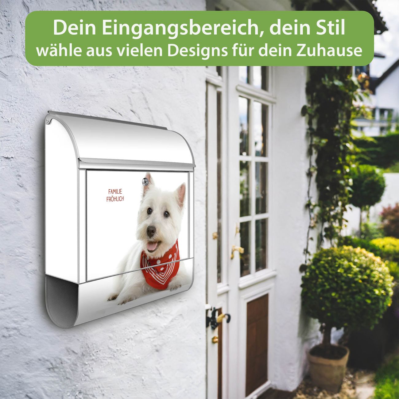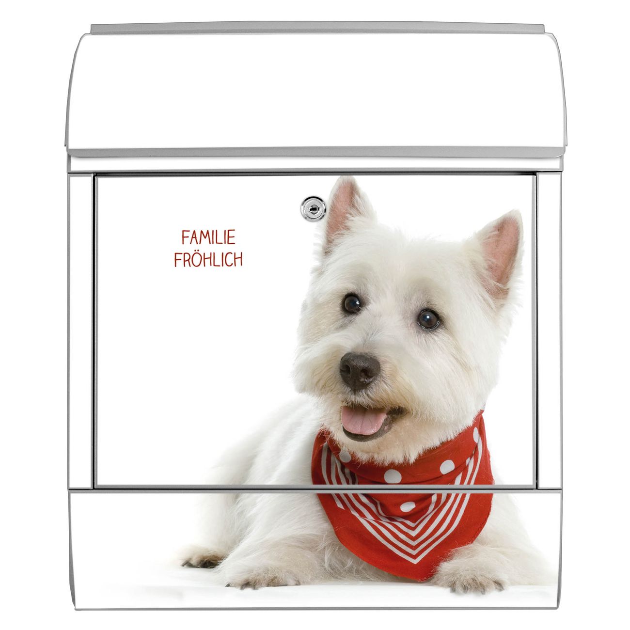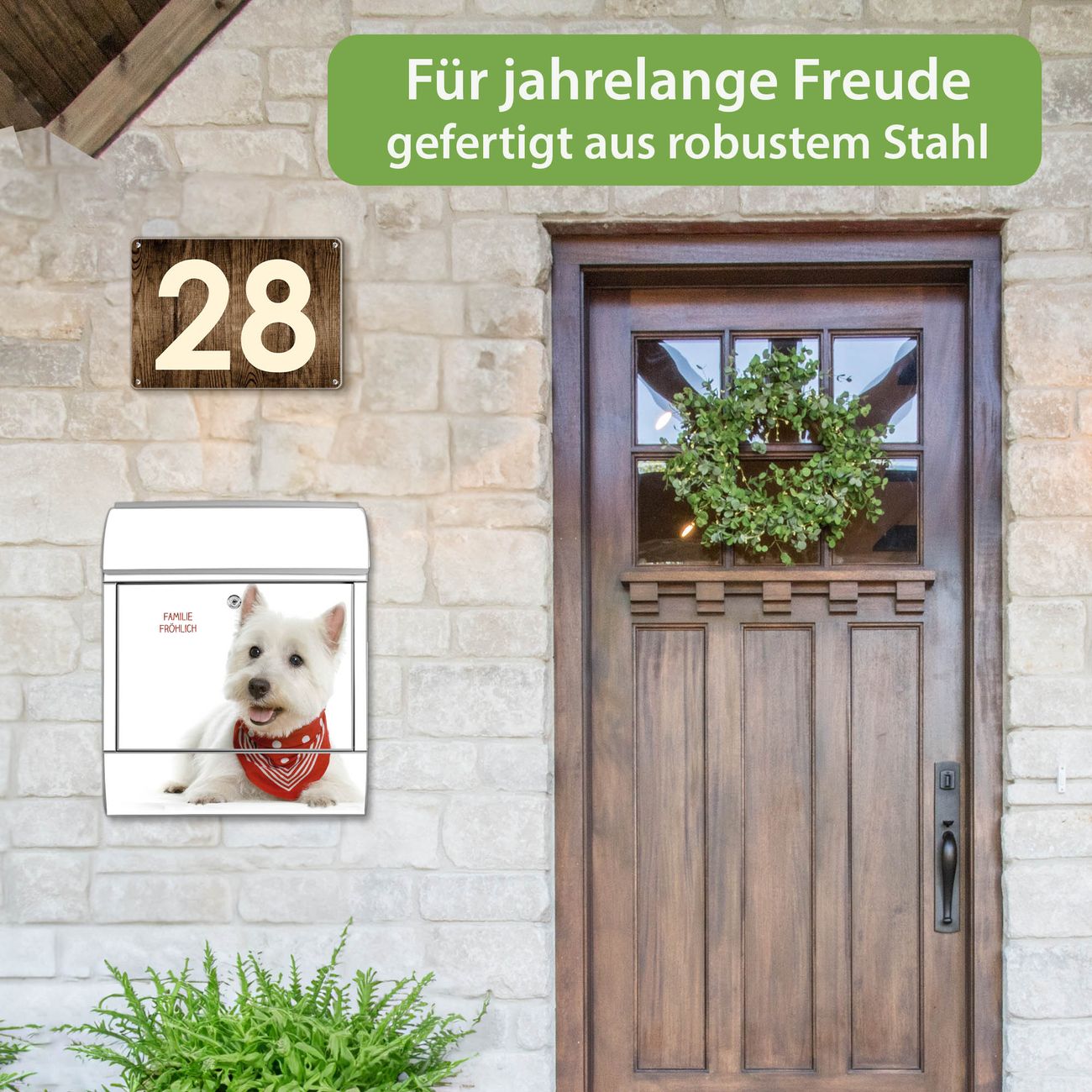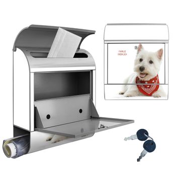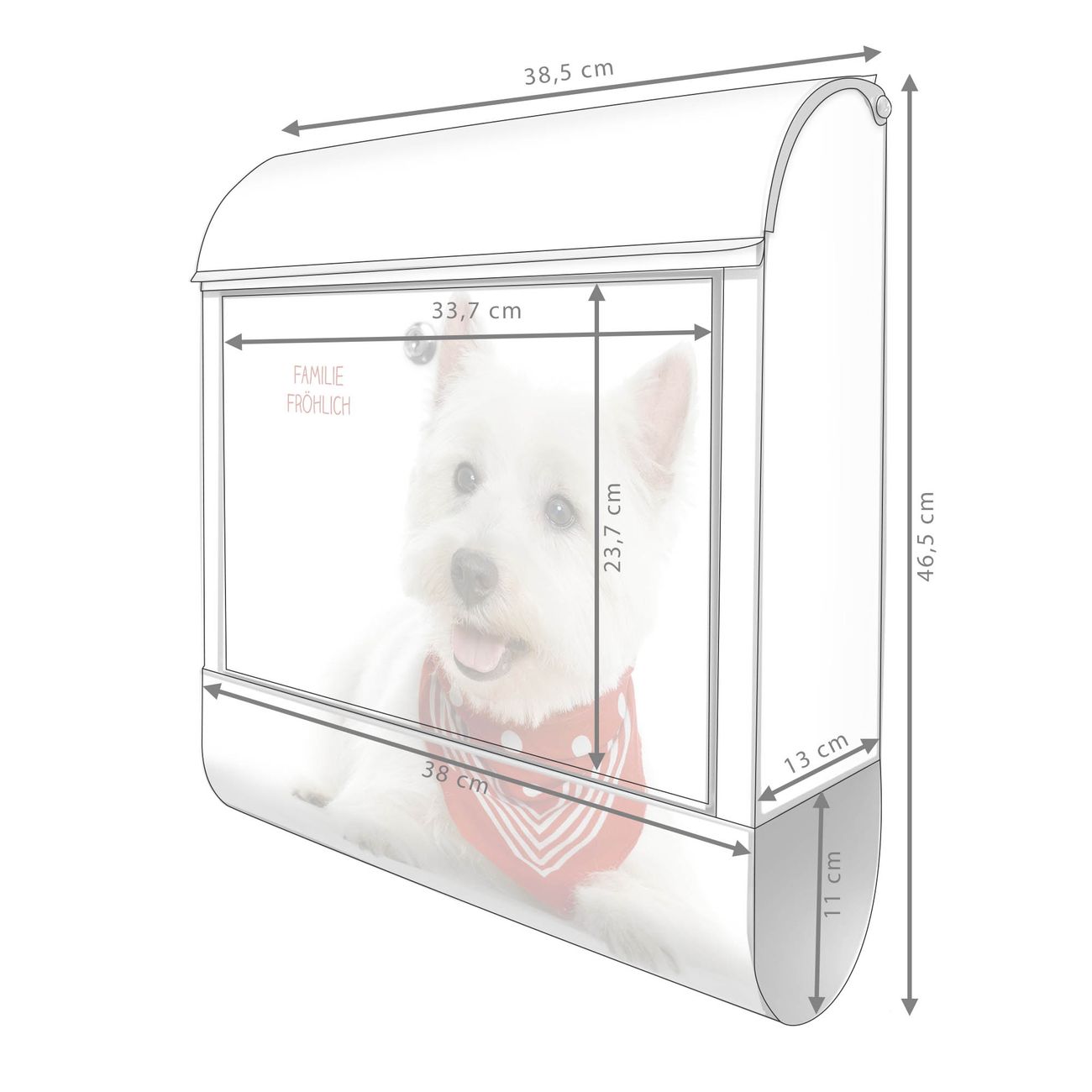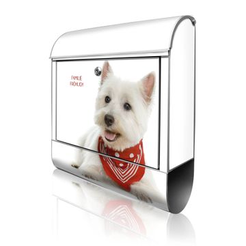 DESIGN: Der Postkasten mit Motiv Motiv Westie hat ein sehr ansprechendes und ausgefallenes Design, damit entlocken Sie Ihren Nachbarn und dem Postboten ein Lächeln. Heben Sie Sich von der tristen grauen Masse ab, ohne auf Funktionalität zu verzichten. DETAILS: Der Postkasten besteht aus pulverbeschichtetem Stahl. Er ist 38x46x12,5cm groß. Das Motiv besteht aus einer wetter- und UV-resistenten Folie, die mit einem Schutzlaminat überzogen ist, sodass der Briefkasten zusätzlich vor Kratzern geschützt ist. Der Briefkasten wird mit Montagematerial, zusätzlich zwei Schlüssel sowie einer Bohrschablone geliefert. NUTZEN: Sie können diesen Briefkasten sowohl als Wandbriefkasten montieren oder einen passenden Ständer kaufen und als Standbriefkasten einbetonieren. Die Größe bietet genügend Platz für Sendungen aller Art, der Einwurf fasst auch größere A4 Sendungen. BANJADO: Ihr Briefkasten wird in Sachsen in einer kleinen Manufaktur von Hand veredelt. Die Motivfolie ist lösungsmittelfrei und schutzlaminiert für einen langen Halt. Wir legen großen Wert auf die Verbindung von Funktionalität und Design. Sie erhalten Handarbeit aus Sachsen.