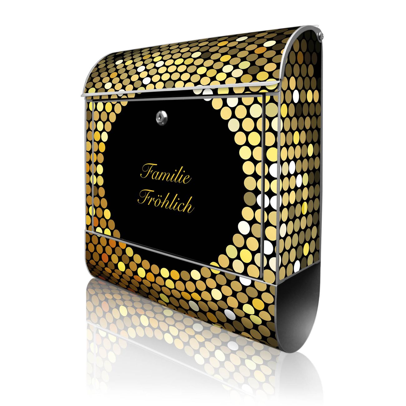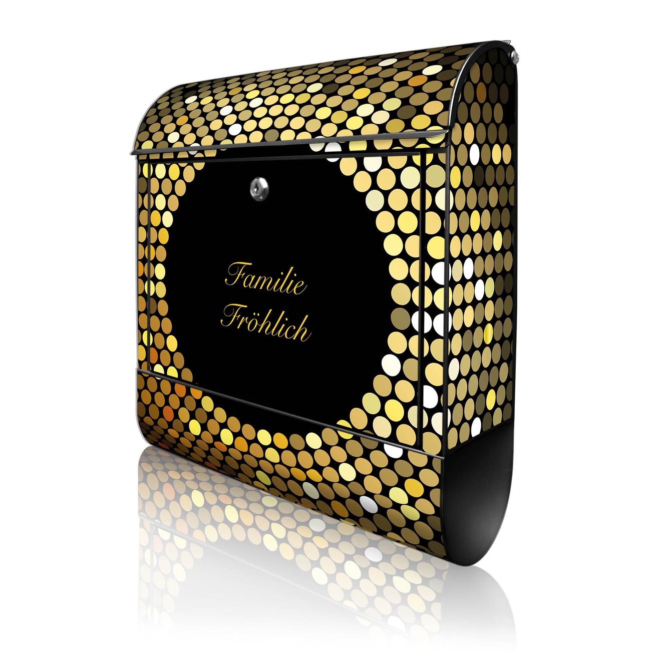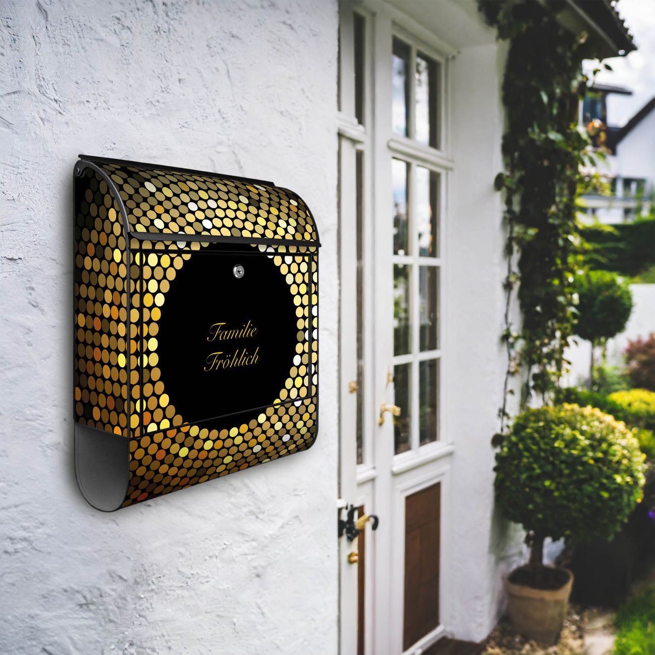 DESIGN: Der Postkasten mit Motiv Motiv WT Gold Disco hat ein sehr ansprechendes und ausgefallenes Design, damit entlocken Sie Ihren Nachbarn und dem Postboten ein Lächeln. Heben Sie Sich von der tristen grauen Masse ab, ohne auf Funktionalität zu verzichten. DETAILS: Der Postkasten besteht aus pulverbeschichtetem Stahl. Er ist 38x46x12,5cm groß. Das Motiv besteht aus einer wetter- und UV-resistenten Folie, die mit einem Schutzlaminat überzogen ist, sodass der Briefkasten zusätzlich vor Kratzern geschützt ist. Der Briefkasten wird mit Montagematerial, zusätzlich zwei Schlüssel sowie einer Bohrschablone geliefert. NUTZEN: Sie können diesen Briefkasten sowohl als Wandbriefkasten montieren oder einen passenden Ständer kaufen und als Standbriefkasten einbetonieren. Die Größe bietet genügend Platz für Sendungen aller Art, der Einwurf fasst auch größere A4 Sendungen. BANJADO: Ihr Briefkasten wird in Sachsen in einer kleinen Manufaktur von Hand veredelt. Die Motivfolie ist lösungsmittelfrei und schutzlaminiert für einen langen Halt. Wir legen großen Wert auf die Verbindung von Funktionalität und Design. Sie erhalten Handarbeit aus Sachsen.