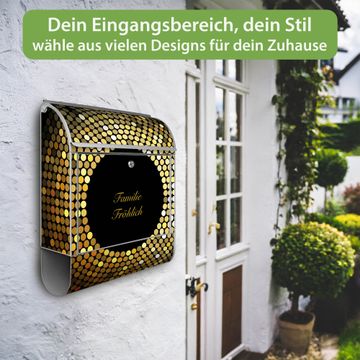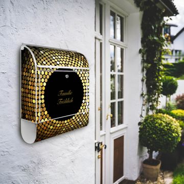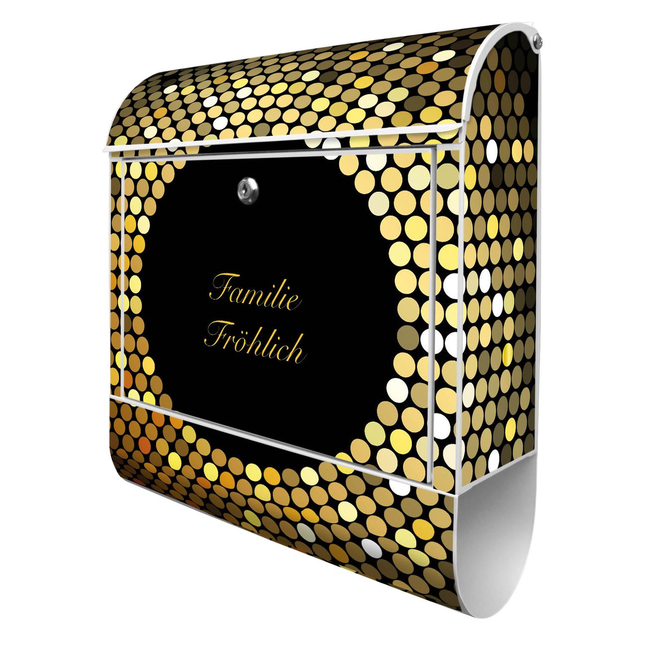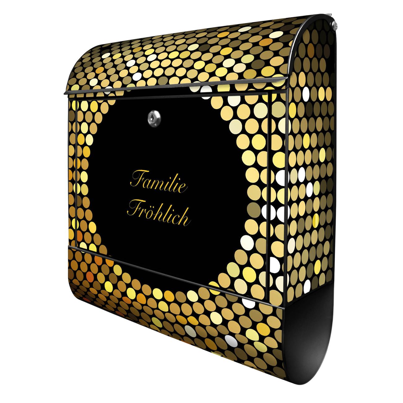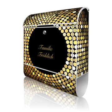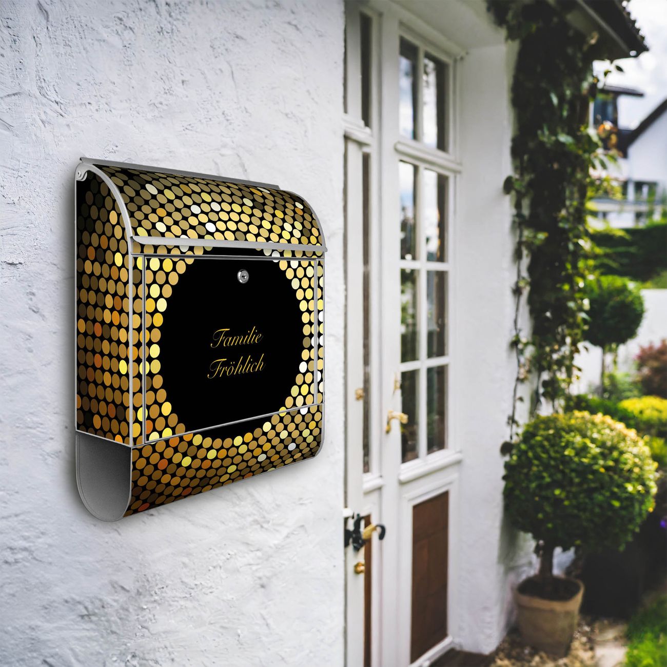 DESIGN: Der Postkasten mit Motiv Motiv WT Gold Disco hat ein sehr ansprechendes und ausgefallenes Design, damit entlocken Sie Ihren Nachbarn und dem Postboten ein Lächeln. Heben Sie Sich von der tristen grauen Masse ab, ohne auf Funktionalität zu verzichten. DETAILS: Der Postkasten besteht aus pulverbeschichtetem Stahl. Er ist 38x46x12,5cm groß. Das Motiv besteht aus einer wetter- und UV-resistenten Folie, die mit einem Schutzlaminat überzogen ist, sodass der Briefkasten zusätzlich vor Kratzern geschützt ist. Der Briefkasten wird mit Montagematerial, zusätzlich zwei Schlüssel sowie einer Bohrschablone geliefert. NUTZEN: Sie können diesen Briefkasten sowohl als Wandbriefkasten montieren oder einen passenden Ständer kaufen und als Standbriefkasten einbetonieren. Die Größe bietet genügend Platz für Sendungen aller Art, der Einwurf fasst auch größere A4 Sendungen. BANJADO: Ihr Briefkasten wird in Sachsen in einer kleinen Manufaktur von Hand veredelt. Die Motivfolie ist lösungsmittelfrei und schutzlaminiert für einen langen Halt. Wir legen großen Wert auf die Verbindung von Funktionalität und Design. Sie erhalten Handarbeit aus Sachsen.