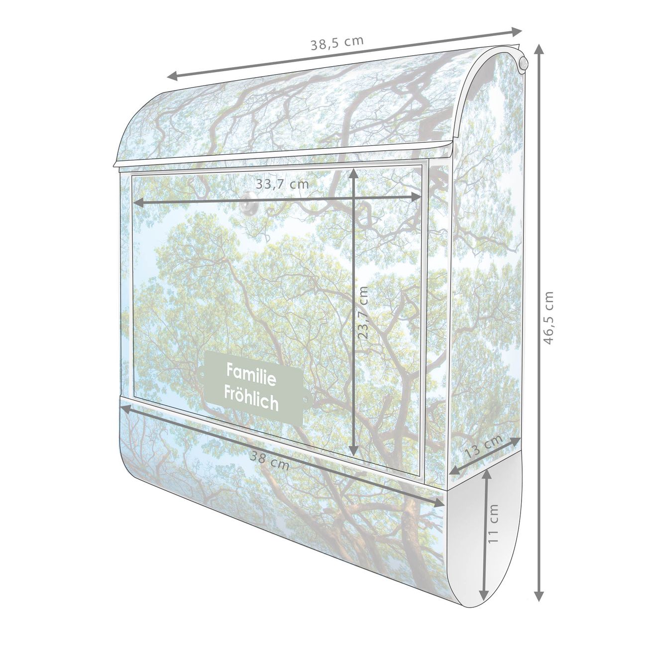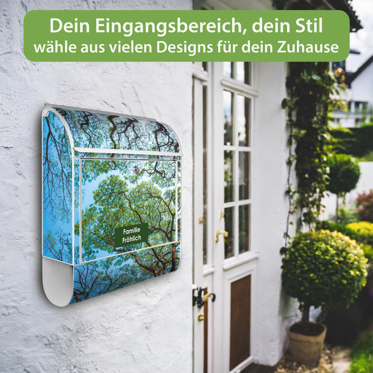 DESIGN: Der Postkasten mit Motiv Motiv Zwischen Bäumen 2 hat ein sehr ansprechendes und ausgefallenes Design, damit entlocken Sie Ihren Nachbarn und dem Postboten ein Lächeln. Heben Sie Sich von der tristen grauen Masse ab, ohne auf Funktionalität zu verzichten. DETAILS: Der Postkasten besteht aus pulverbeschichtetem Stahl. Er ist 38x46x12,5cm groß. Das Motiv besteht aus einer wetter- und UV-resistenten Folie, die mit einem Schutzlaminat überzogen ist, sodass der Briefkasten zusätzlich vor Kratzern geschützt ist. Der Briefkasten wird mit Montagematerial, zusätzlich zwei Schlüssel sowie einer Bohrschablone geliefert. NUTZEN: Sie können diesen Briefkasten sowohl als Wandbriefkasten montieren oder einen passenden Ständer kaufen und als Standbriefkasten einbetonieren. Die Größe bietet genügend Platz für Sendungen aller Art, der Einwurf fasst auch größere A4 Sendungen. BANJADO: Ihr Briefkasten wird in Sachsen in einer kleinen Manufaktur von Hand veredelt. Die Motivfolie ist lösungsmittelfrei und schutzlaminiert für einen langen Halt. Wir legen großen Wert auf die Verbindung von Funktionalität und Design. Sie erhalten Handarbeit aus Sachsen.