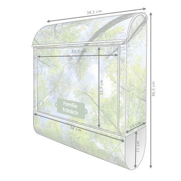 DESIGN: Der Postkasten mit Motiv Motiv Zwischen Bäumen 3 hat ein sehr ansprechendes und ausgefallenes Design, damit entlocken Sie Ihren Nachbarn und dem Postboten ein Lächeln. Heben Sie Sich von der tristen grauen Masse ab, ohne auf Funktionalität zu verzichten. DETAILS: Der Postkasten besteht aus pulverbeschichtetem Stahl. Er ist 38x46x12,5cm groß. Das Motiv besteht aus einer wetter- und UV-resistenten Folie, die mit einem Schutzlaminat überzogen ist, sodass der Briefkasten zusätzlich vor Kratzern geschützt ist. Der Briefkasten wird mit Montagematerial, zusätzlich zwei Schlüssel sowie einer Bohrschablone geliefert. NUTZEN: Sie können diesen Briefkasten sowohl als Wandbriefkasten montieren oder einen passenden Ständer kaufen und als Standbriefkasten einbetonieren. Die Größe bietet genügend Platz für Sendungen aller Art, der Einwurf fasst auch größere A4 Sendungen. BANJADO: Ihr Briefkasten wird in Sachsen in einer kleinen Manufaktur von Hand veredelt. Die Motivfolie ist lösungsmittelfrei und schutzlaminiert für einen langen Halt. Wir legen großen Wert auf die Verbindung von Funktionalität und Design. Sie erhalten Handarbeit aus Sachsen.