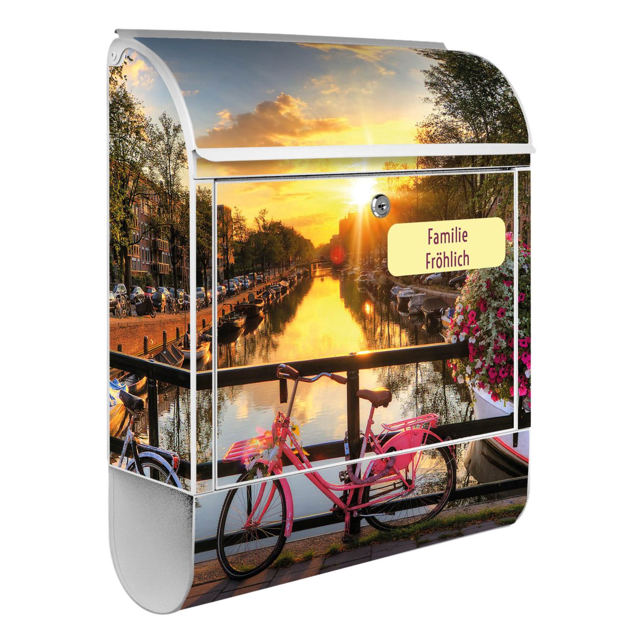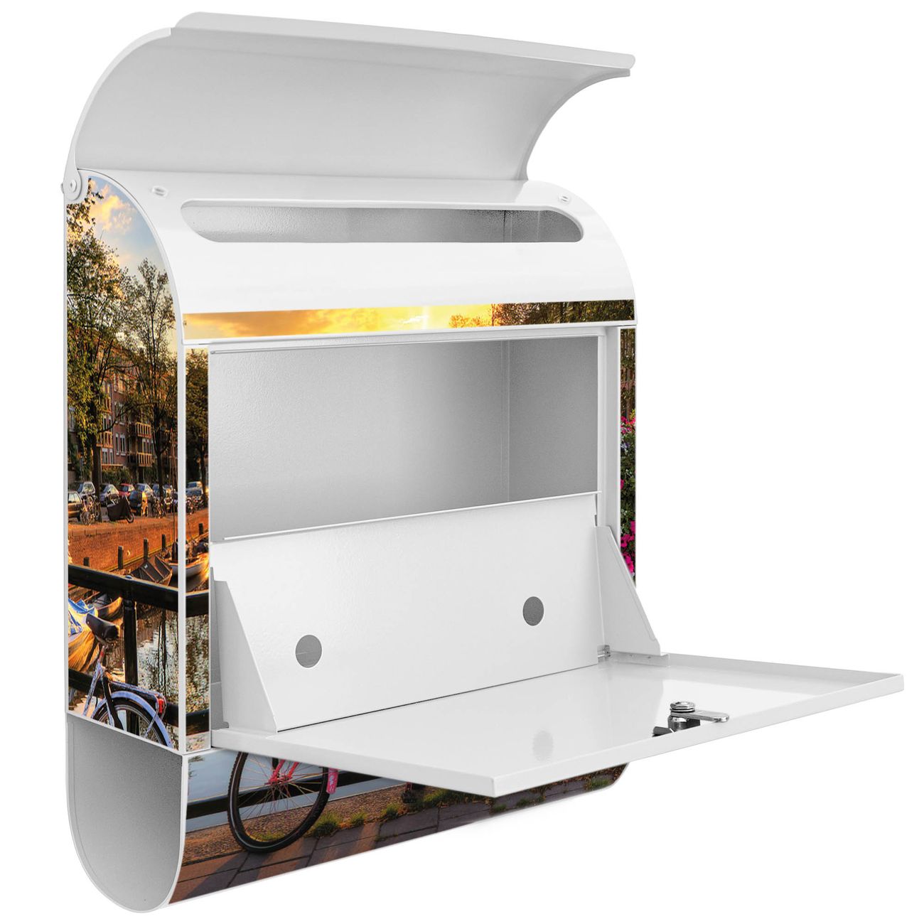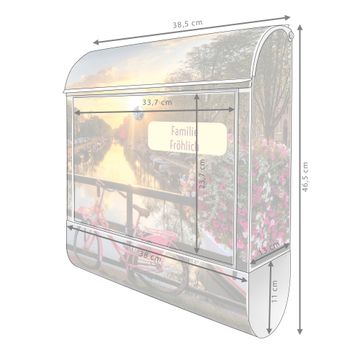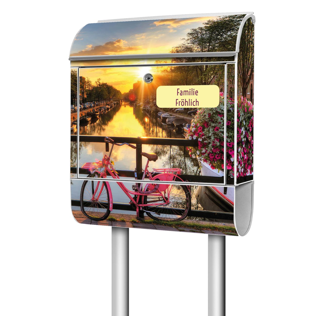 Der banjado Standbriefkasten mit Motiv Motiv Amsterdam Mit Rad kombiniert großzügigen Stauraum mit modernem Design. Durch das geräumige Fach finden auch große A4-Sendungen problemlos Platz. Die integrierte Zeitungsrolle sorgt dafür, dass Tageszeitungen und Magazine separat und griffbereit untergebracht sind. Der pulverbeschichtete Standfuß ist farblich passend zum Briefkasten gestaltet und sorgt für ein stimmiges Gesamtbild. Mit dem individuellen Motiv setzen Sie einen optischen Akzent, der sowohl praktisch als auch dekorativ ist.