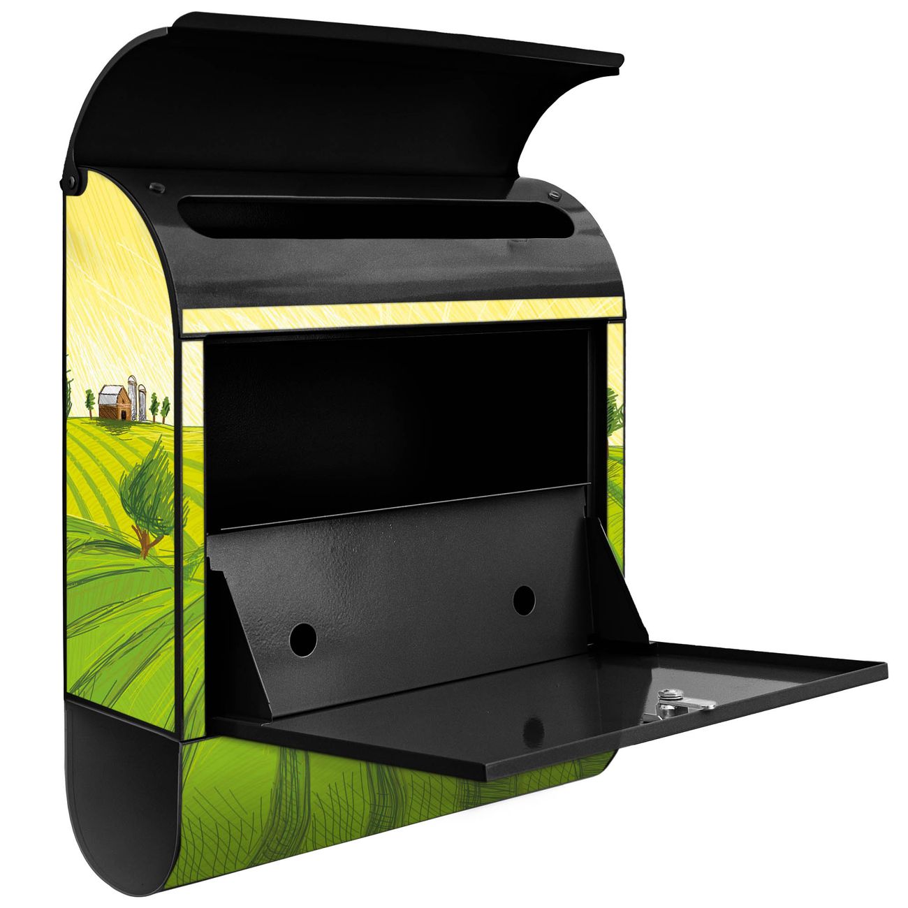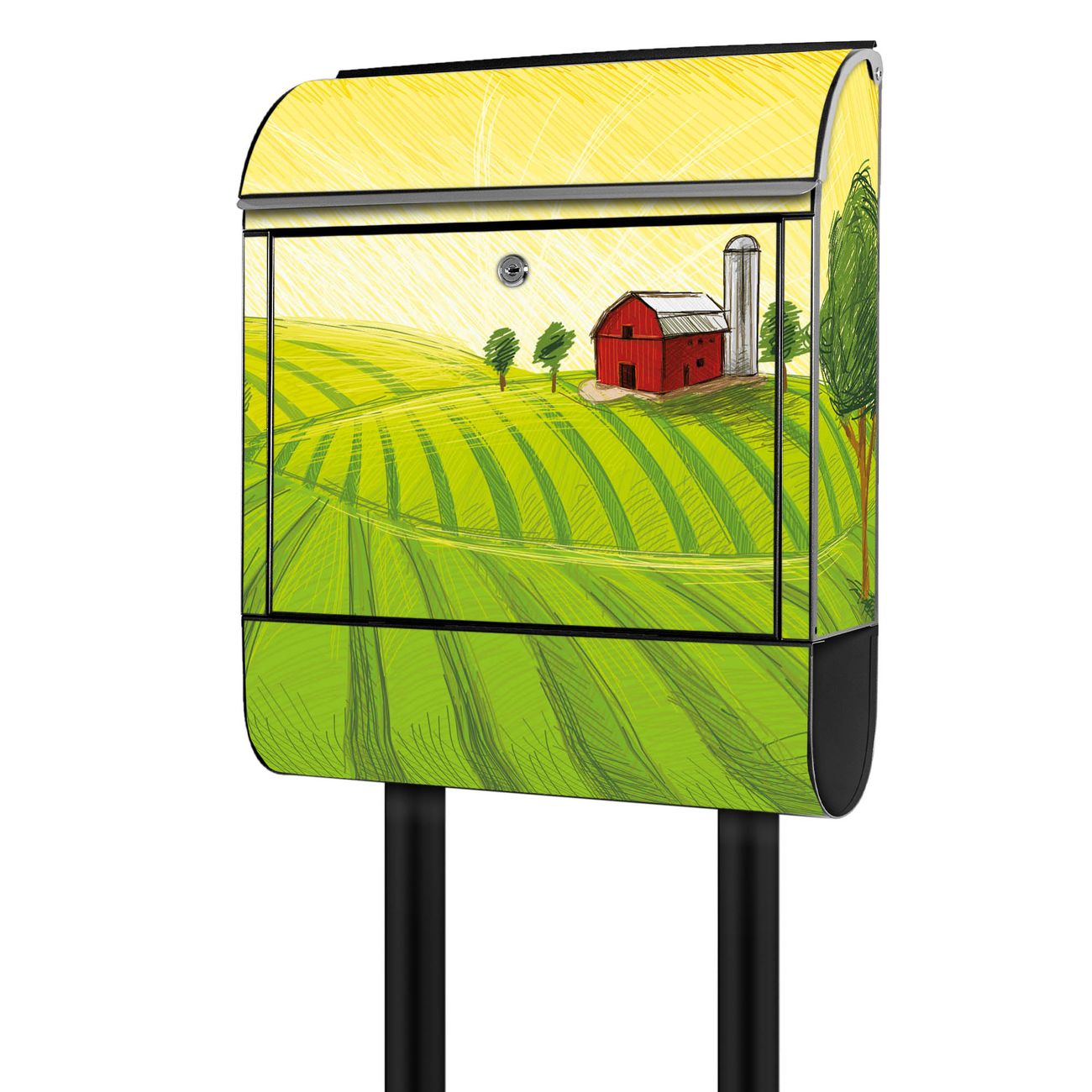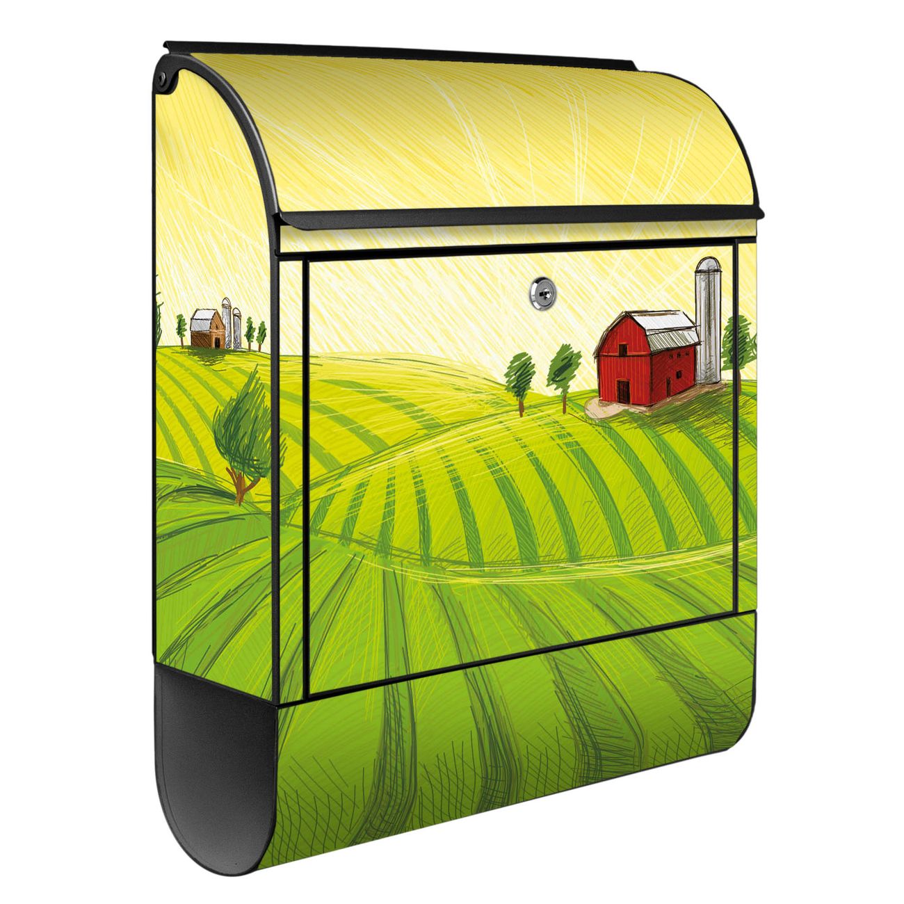 Der banjado Standbriefkasten mit Motiv Motiv Auf dem Land kombiniert großzügigen Stauraum mit modernem Design. Durch das geräumige Fach finden auch große A4-Sendungen problemlos Platz. Die integrierte Zeitungsrolle sorgt dafür, dass Tageszeitungen und Magazine separat und griffbereit untergebracht sind. Der pulverbeschichtete Standfuß ist farblich passend zum Briefkasten gestaltet und sorgt für ein stimmiges Gesamtbild. Mit dem individuellen Motiv setzen Sie einen optischen Akzent, der sowohl praktisch als auch dekorativ ist.