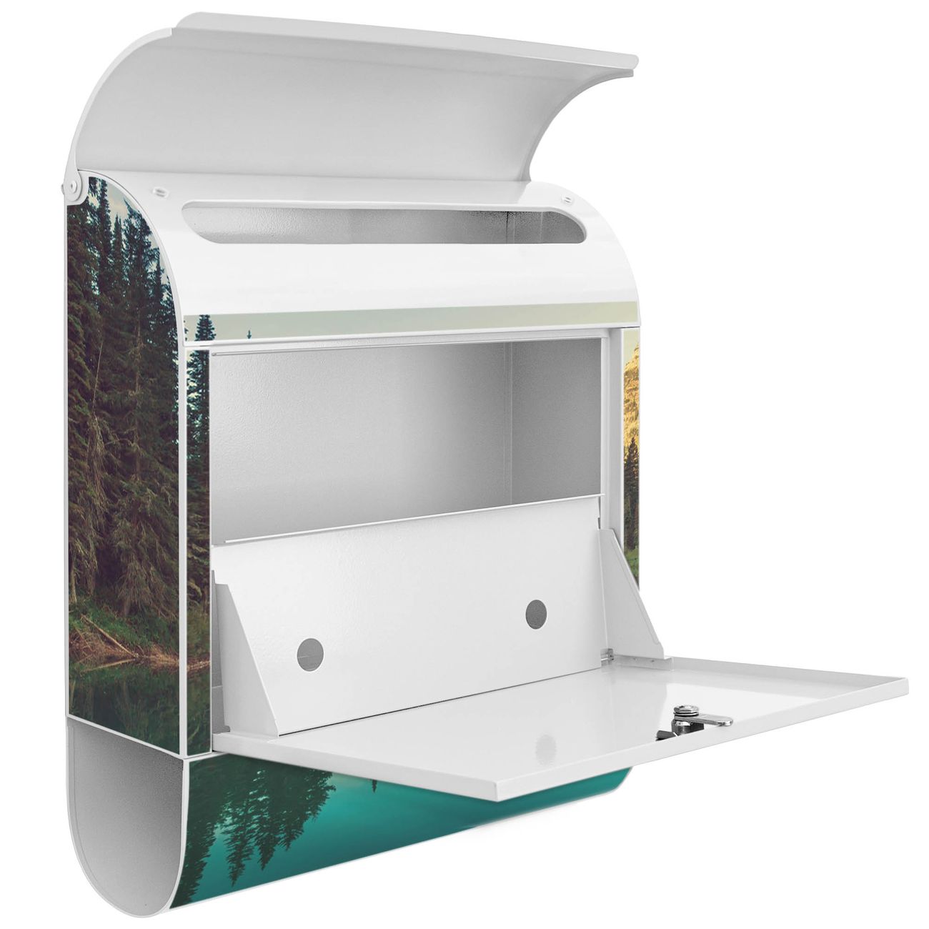 Der banjado Standbriefkasten mit Motiv Motiv Bergsee kombiniert großzügigen Stauraum mit modernem Design. Durch das geräumige Fach finden auch große A4-Sendungen problemlos Platz. Die integrierte Zeitungsrolle sorgt dafür, dass Tageszeitungen und Magazine separat und griffbereit untergebracht sind. Der pulverbeschichtete Standfuß ist farblich passend zum Briefkasten gestaltet und sorgt für ein stimmiges Gesamtbild. Mit dem individuellen Motiv setzen Sie einen optischen Akzent, der sowohl praktisch als auch dekorativ ist.