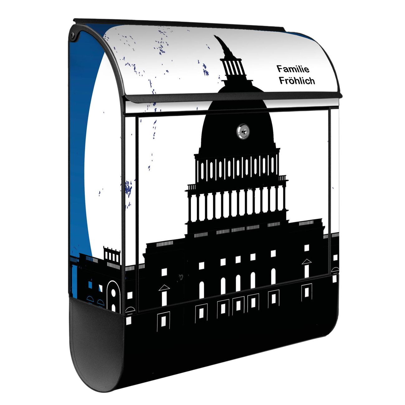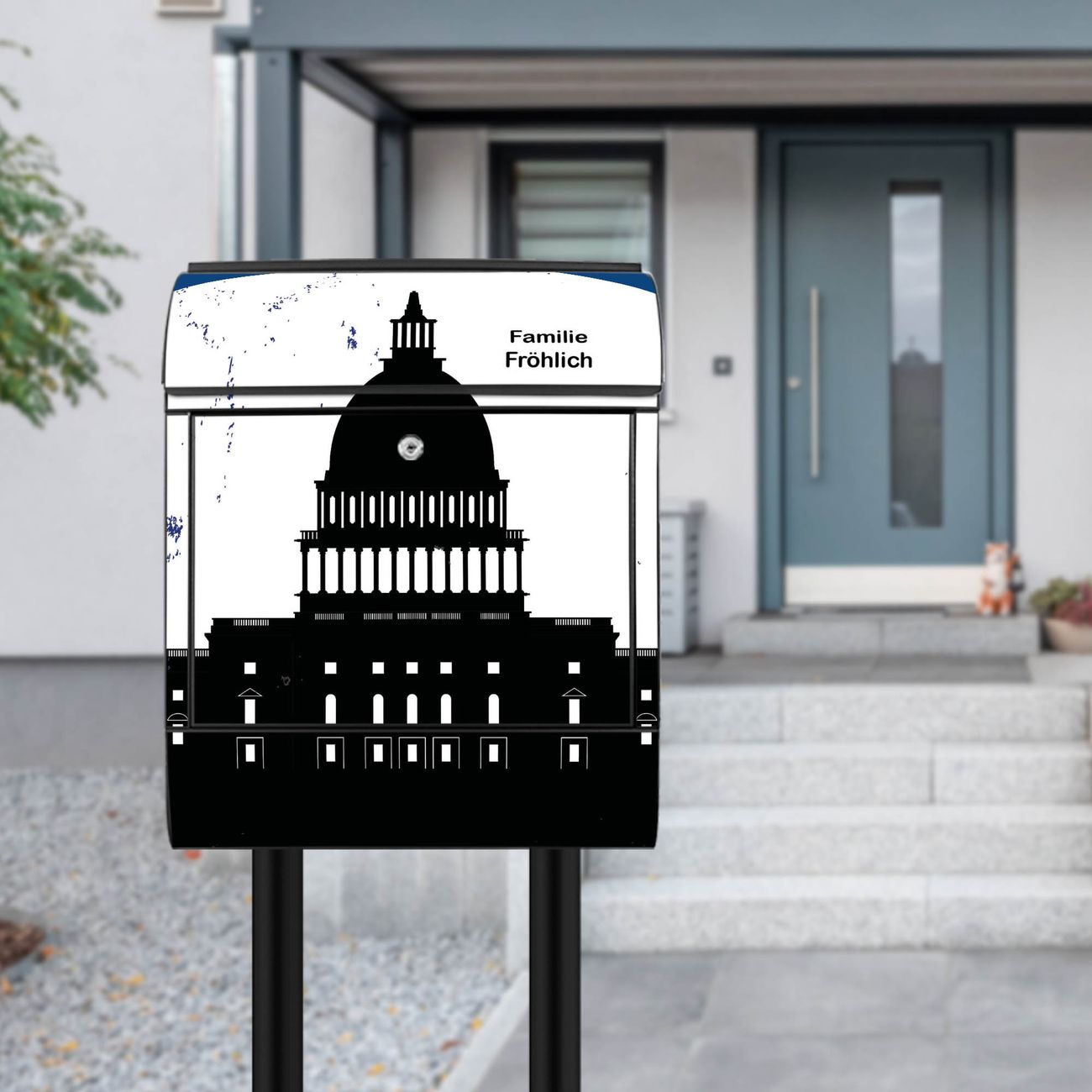 Der banjado Standbriefkasten mit Motiv Motiv City Poster Washington kombiniert großzügigen Stauraum mit modernem Design. Durch das geräumige Fach finden auch große A4-Sendungen problemlos Platz. Die integrierte Zeitungsrolle sorgt dafür, dass Tageszeitungen und Magazine separat und griffbereit untergebracht sind. Der pulverbeschichtete Standfuß ist farblich passend zum Briefkasten gestaltet und sorgt für ein stimmiges Gesamtbild. Mit dem individuellen Motiv setzen Sie einen optischen Akzent, der sowohl praktisch als auch dekorativ ist.