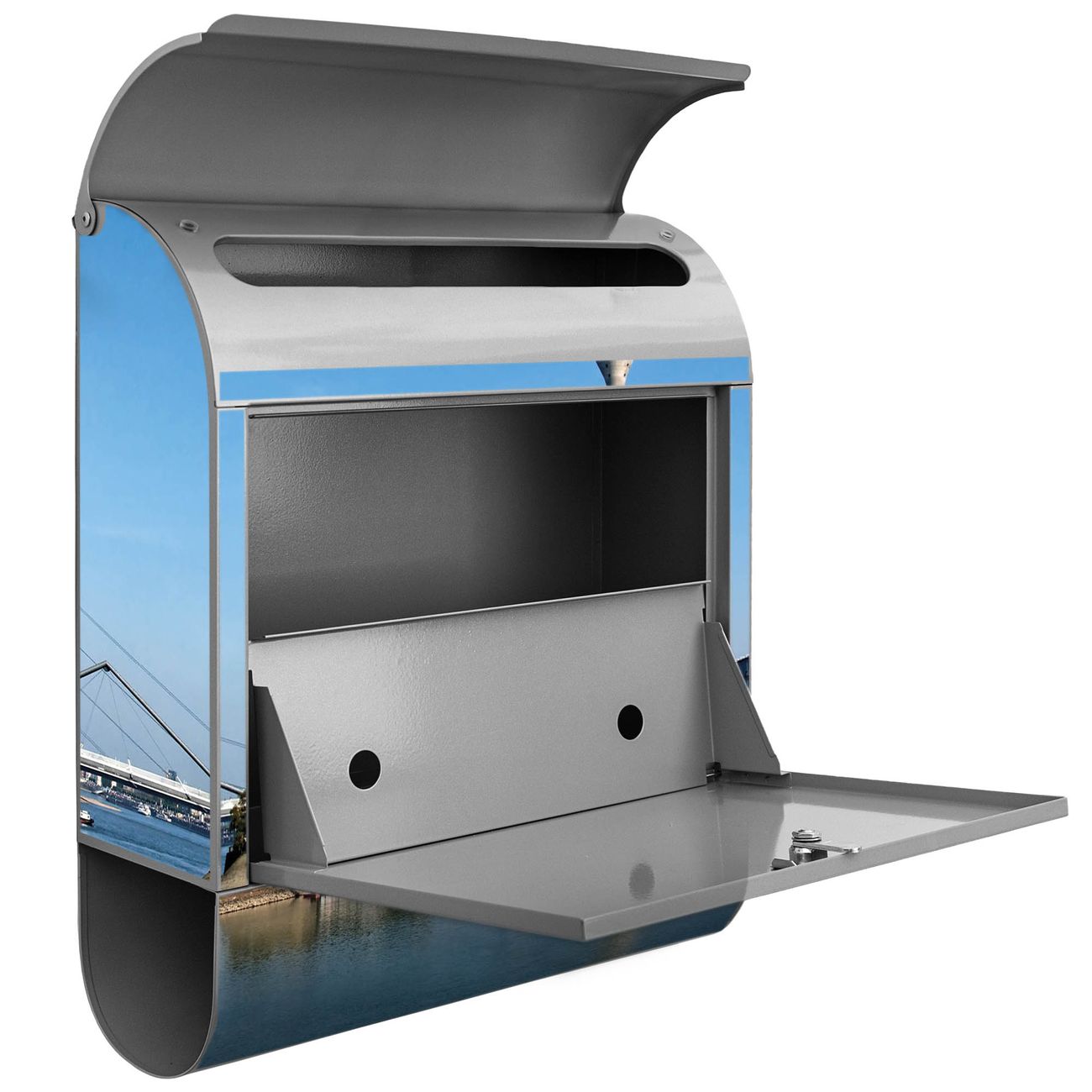 Der banjado Standbriefkasten mit Motiv Motiv Düsseldorf kombiniert großzügigen Stauraum mit modernem Design. Durch das geräumige Fach finden auch große A4-Sendungen problemlos Platz. Die integrierte Zeitungsrolle sorgt dafür, dass Tageszeitungen und Magazine separat und griffbereit untergebracht sind. Der pulverbeschichtete Standfuß ist farblich passend zum Briefkasten gestaltet und sorgt für ein stimmiges Gesamtbild. Mit dem individuellen Motiv setzen Sie einen optischen Akzent, der sowohl praktisch als auch dekorativ ist.