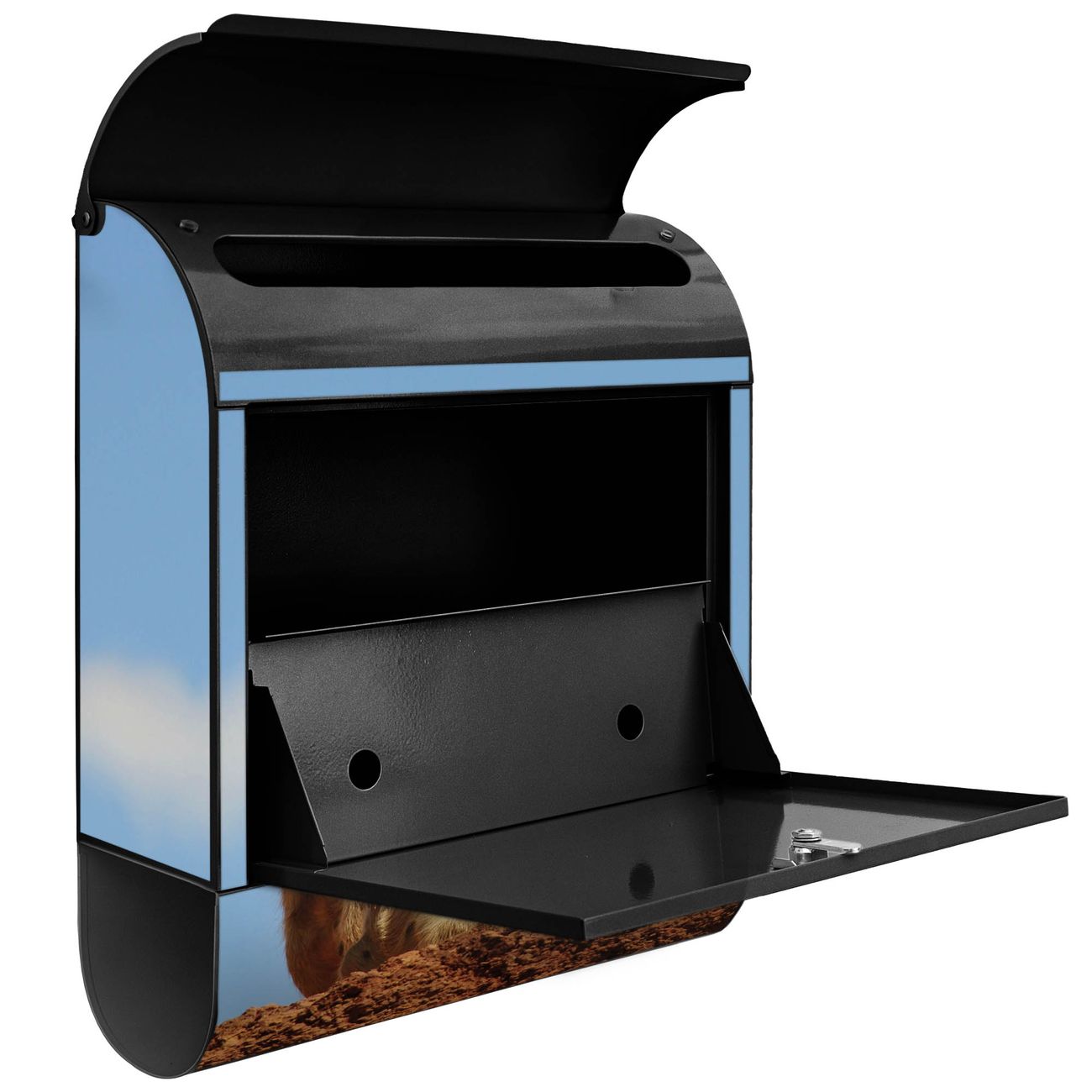 Der banjado Standbriefkasten mit Motiv Motiv Erdmännchenfamilie kombiniert großzügigen Stauraum mit modernem Design. Durch das geräumige Fach finden auch große A4-Sendungen problemlos Platz. Die integrierte Zeitungsrolle sorgt dafür, dass Tageszeitungen und Magazine separat und griffbereit untergebracht sind. Der pulverbeschichtete Standfuß ist farblich passend zum Briefkasten gestaltet und sorgt für ein stimmiges Gesamtbild. Mit dem individuellen Motiv setzen Sie einen optischen Akzent, der sowohl praktisch als auch dekorativ ist.