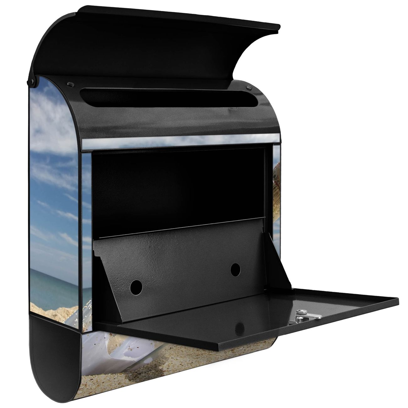 Der banjado Standbriefkasten mit Motiv Motiv Flaschenpost kombiniert großzügigen Stauraum mit modernem Design. Durch das geräumige Fach finden auch große A4-Sendungen problemlos Platz. Die integrierte Zeitungsrolle sorgt dafür, dass Tageszeitungen und Magazine separat und griffbereit untergebracht sind. Der pulverbeschichtete Standfuß ist farblich passend zum Briefkasten gestaltet und sorgt für ein stimmiges Gesamtbild. Mit dem individuellen Motiv setzen Sie einen optischen Akzent, der sowohl praktisch als auch dekorativ ist.