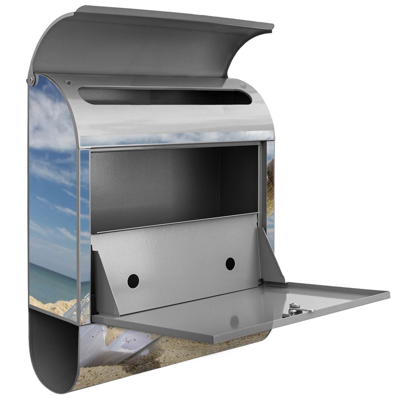 Der banjado Standbriefkasten mit Motiv Motiv Flaschenpost kombiniert großzügigen Stauraum mit modernem Design. Durch das geräumige Fach finden auch große A4-Sendungen problemlos Platz. Die integrierte Zeitungsrolle sorgt dafür, dass Tageszeitungen und Magazine separat und griffbereit untergebracht sind. Der pulverbeschichtete Standfuß ist farblich passend zum Briefkasten gestaltet und sorgt für ein stimmiges Gesamtbild. Mit dem individuellen Motiv setzen Sie einen optischen Akzent, der sowohl praktisch als auch dekorativ ist.