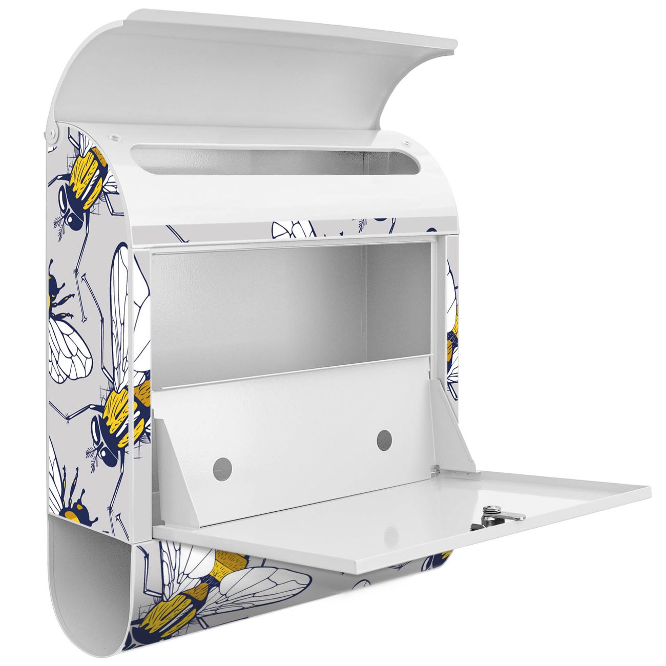 Der banjado Standbriefkasten mit Motiv Motiv Fliegen und Bienen kombiniert großzügigen Stauraum mit modernem Design. Durch das geräumige Fach finden auch große A4-Sendungen problemlos Platz. Die integrierte Zeitungsrolle sorgt dafür, dass Tageszeitungen und Magazine separat und griffbereit untergebracht sind. Der pulverbeschichtete Standfuß ist farblich passend zum Briefkasten gestaltet und sorgt für ein stimmiges Gesamtbild. Mit dem individuellen Motiv setzen Sie einen optischen Akzent, der sowohl praktisch als auch dekorativ ist.